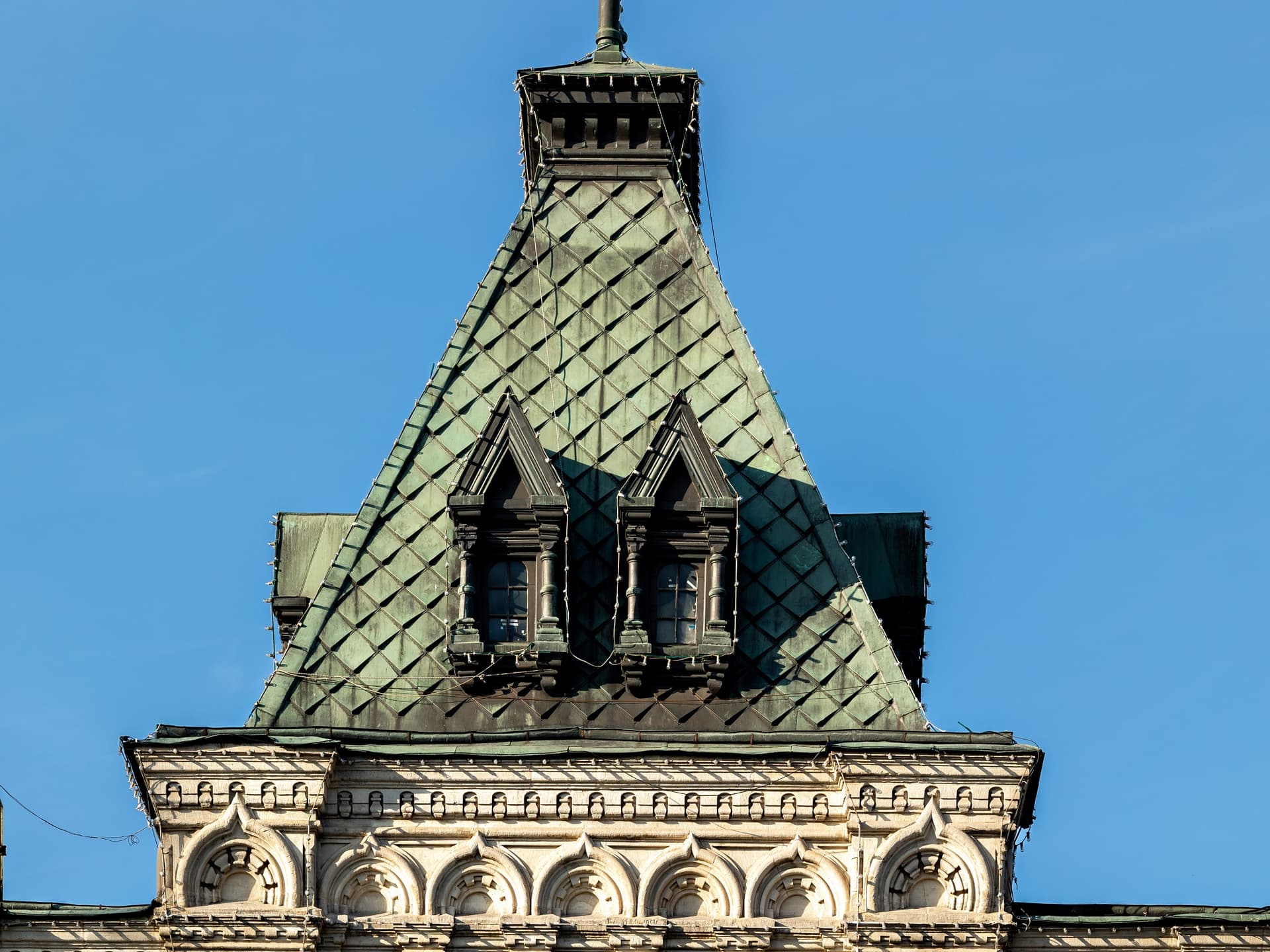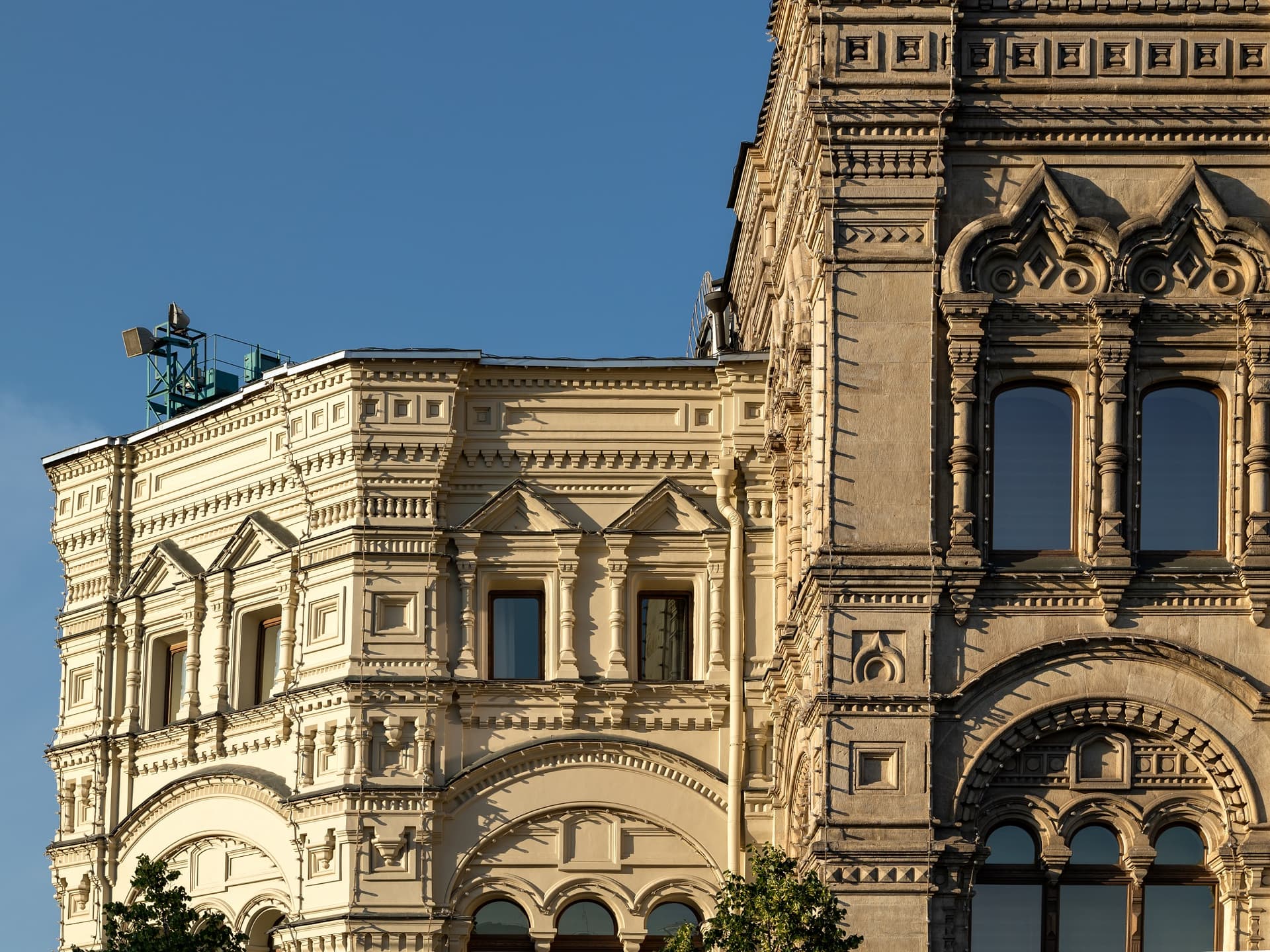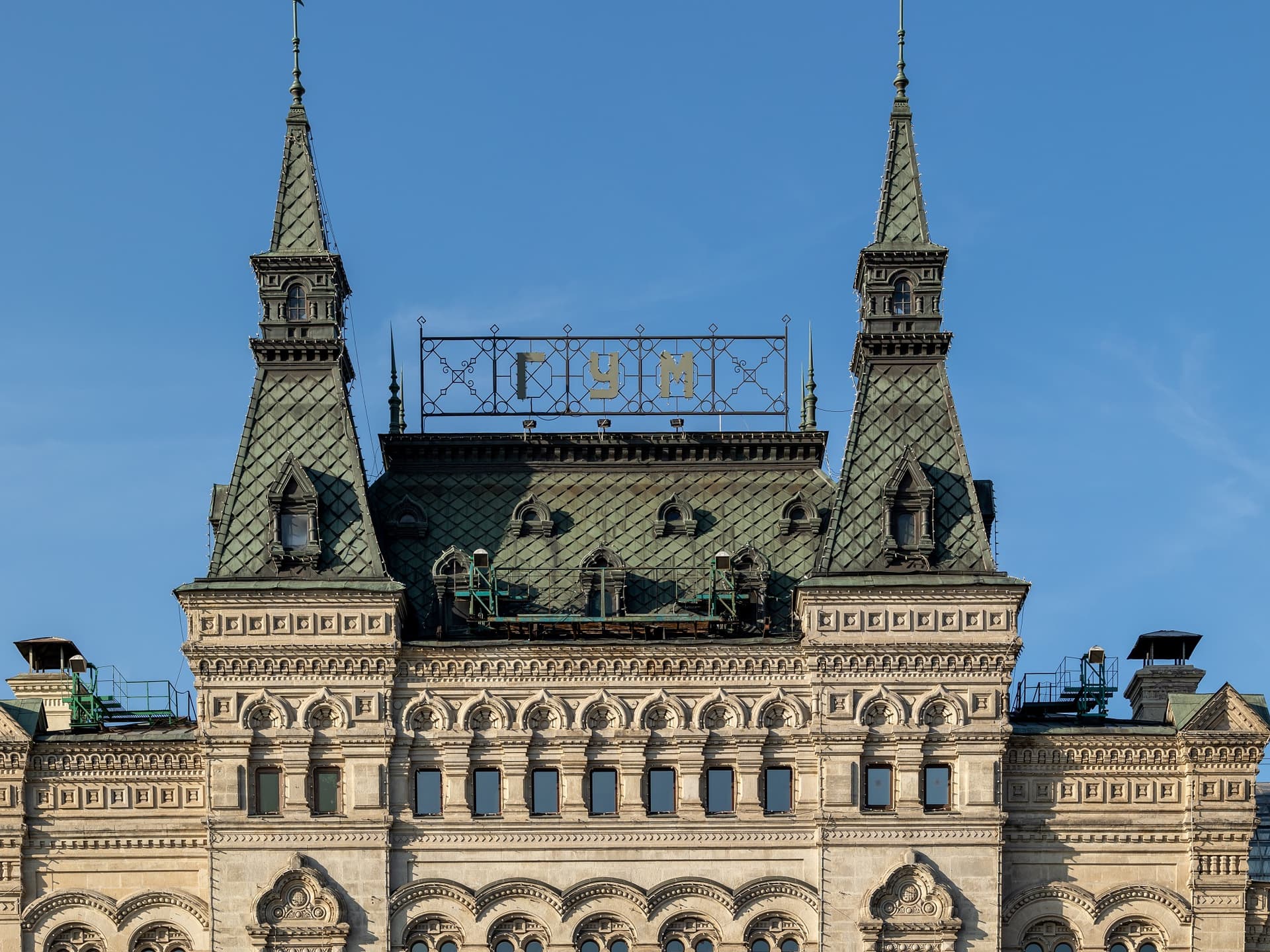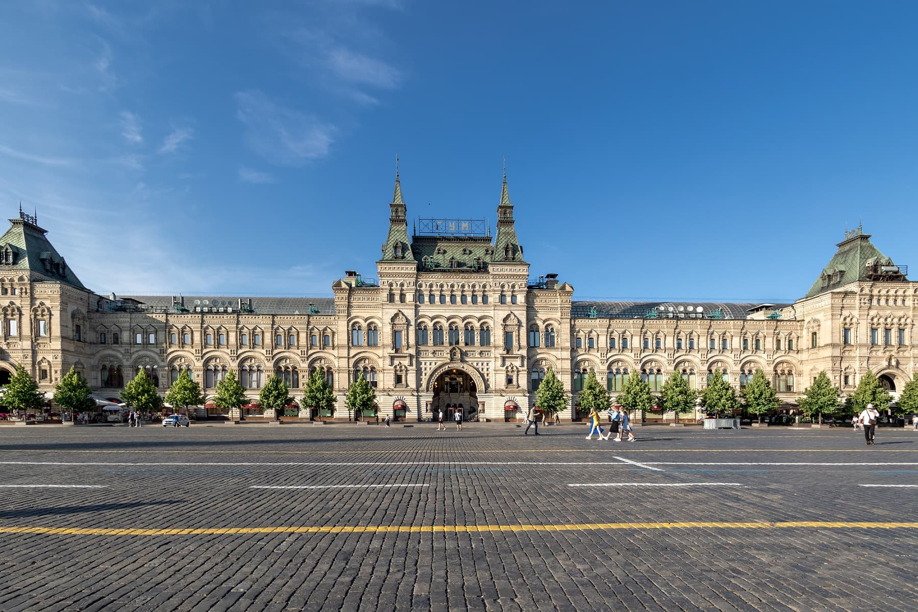 Хотя зодчий отошел от классицистического стиля в пользу псевдорусского, структура комплекса осталась прежней: линии, проходы и широкие окна витрин. Вытянутые «теремковые» крыши и шатры со шпилями над главным входом гармонируют с башнями Кремля. Благодаря инженерам В.Г. Шухову и А.Ф. Лолейту пассажи («ряды») получили крыши с остеклением. В здании была своя электростанция, освещавшая и ряды, и Красную площадь, водопровод и артезианская скважина. Всего здесь было 1200 магазинов и три зала собраний. В 1897 г. в одном из них был создан кинотеатр.