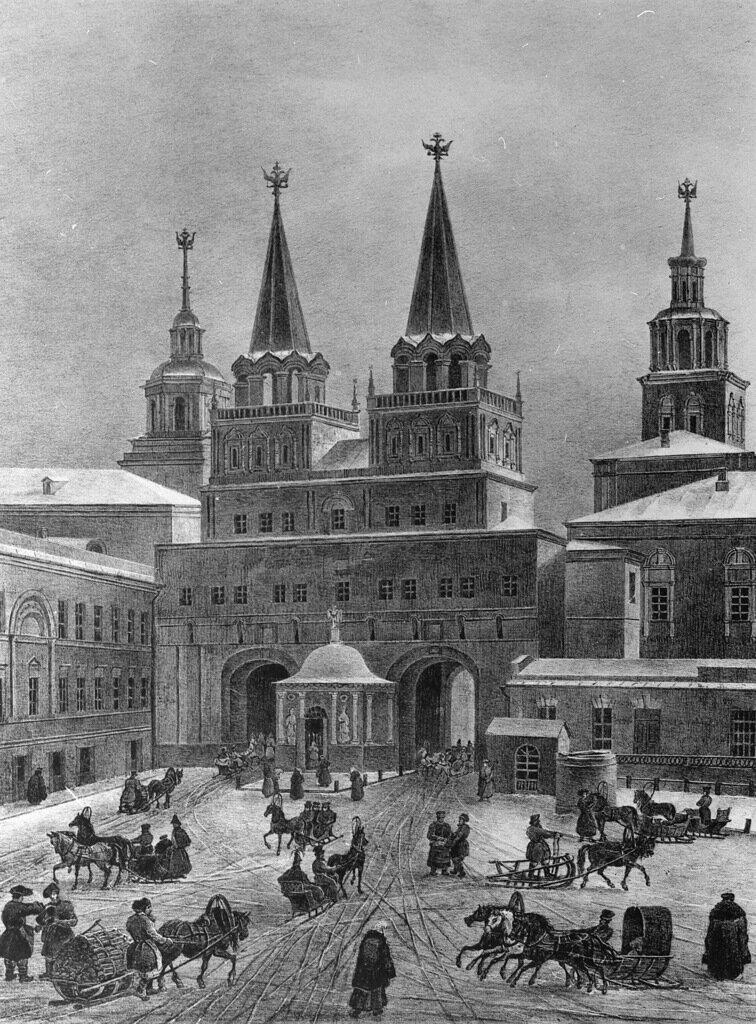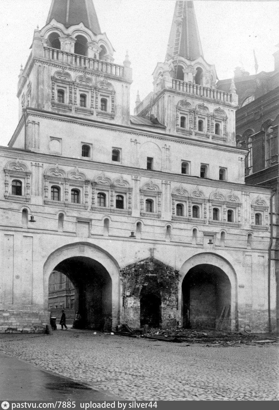 Воскресенские (Иверские) ворота Китай-города были построены как двухарочные в 1535 -м, а в 1680 году фактически обрели тот вид, что дошел неизменным до 1931 года, когда ворота были снесены. В 1781 году перед воротами поставили часовню (сначала деревянную, а с 1791 года – каменную) для иконы Иверской Божией Матери, сломанную впоследствии вместе с воротами и вместе с ними же восстановленную.