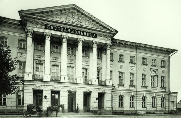 Парадные ворота старинного литья и стерегущие их массивные львы сразу настраивают на то, что здесь не просто больница, а дом с длинной историей. Если заглянуть в ограду, то видно ярко-желтый дворец со строгим классическим портиком. Но и это еще не все!