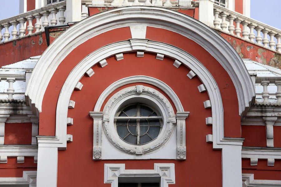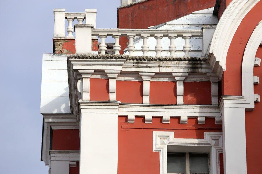 Там, где теперь закрытый переход от Никольской улицы к метро, располагался монастырский сад. Здесь был монастырский театр, где силами студентов академии разыгрывались пьесы. От улицы монастырь был отгорожен двумя корпусами с лавками. В конце XIX века их сломали и на их месте построили другие в «русском стиле». Левый дом – номер 7 – 1895‑1897 годов построен по проекту архитектора М. Преображенского, а общеее руководство строительством осуществлял архитектор С.У. Соловьев. Правый с колокольней и воротами построен в 1899‑1900 годах архитектором З.И. Ивановым. Колокольня 1900 года повторяла колокольню церкви Успения на Покровке. В этом корпусе до 1917 года находился большой книжный магазин И.Д. Сытина.