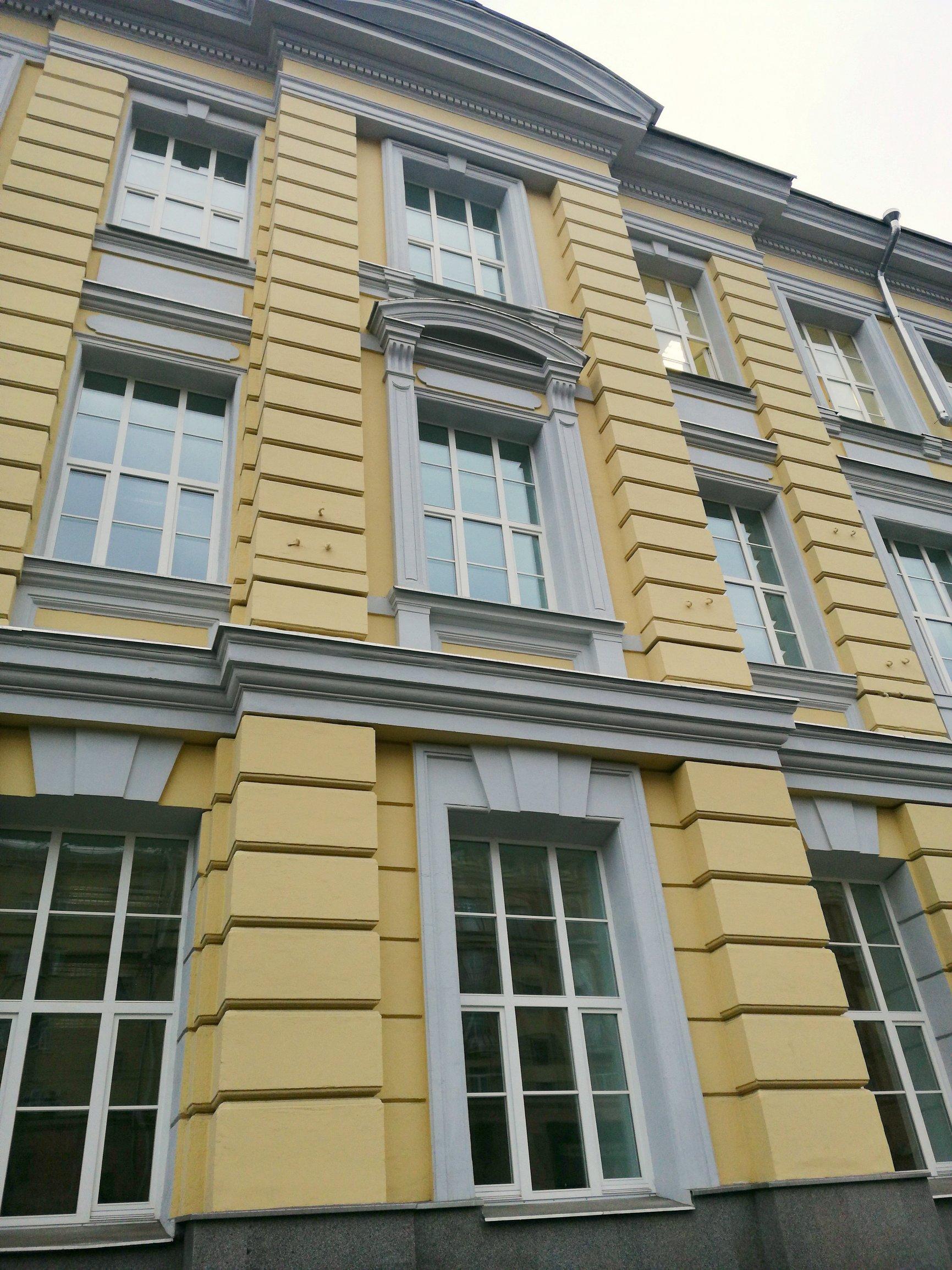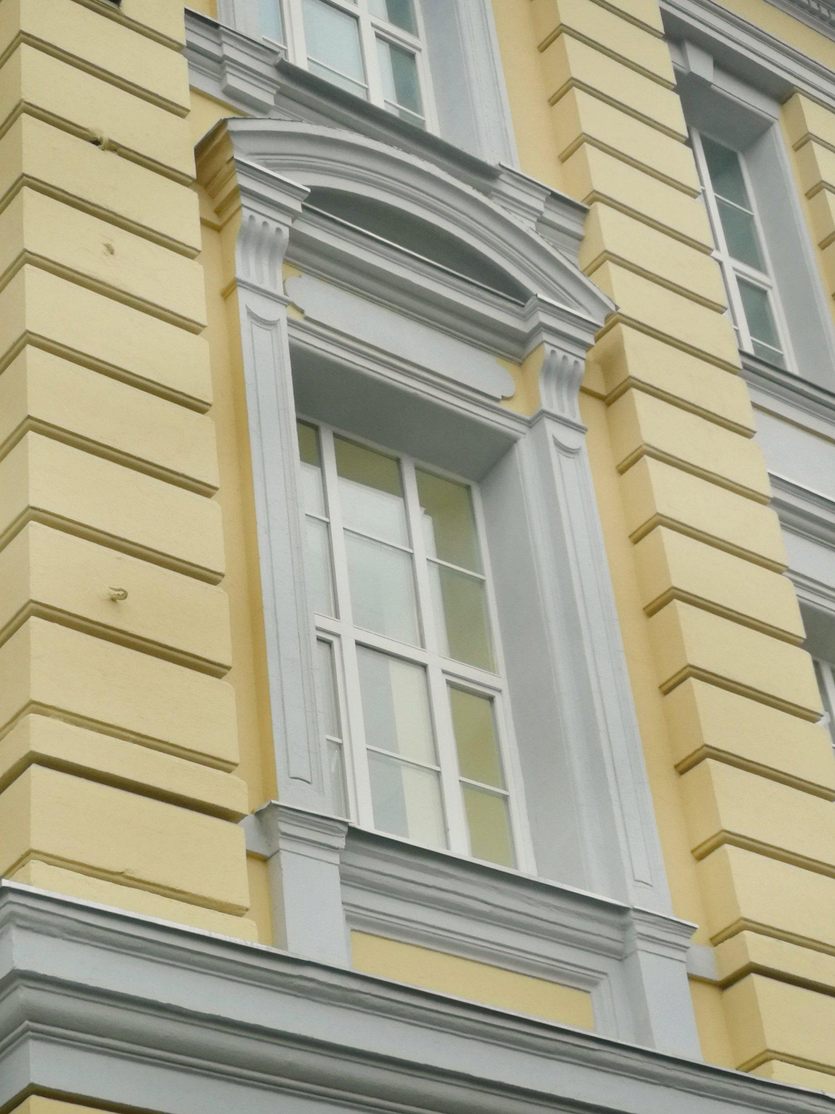 Особый характер облику дома придают одинаковые прямоугольные оконные проемы, расположенные с равными интервалами. В нижнем этаже окна оформлены наличниками с замковыми камнями, окна второго этажа декорированы наличниками и сандриками прямоугольной формы, а на третьем проемы обрамляют простые наличники, благодаря чему он зрительно воспринимается легче. Торцевые и дворовый фасады более лаконичны, но, тем не менее, решены в единой стилистике с главным фасадом.
