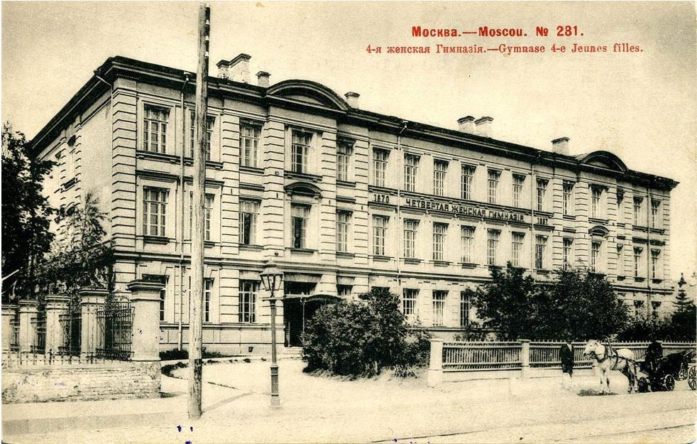 Сама 4-я женская гимназия была преобразована в 1870 г. из женского училища Ведомства учреждений императрицы Марии Федоровны и поначалу располагалась в другом здании. После революции гимназию ликвидировали, а в 1920-е открыли на ее месте обычную школу. Здесь в свое время учился Б. Е. Черток, выдающийся конструктор ракетно-космической техники, ближайший соратник С. П. Королева.