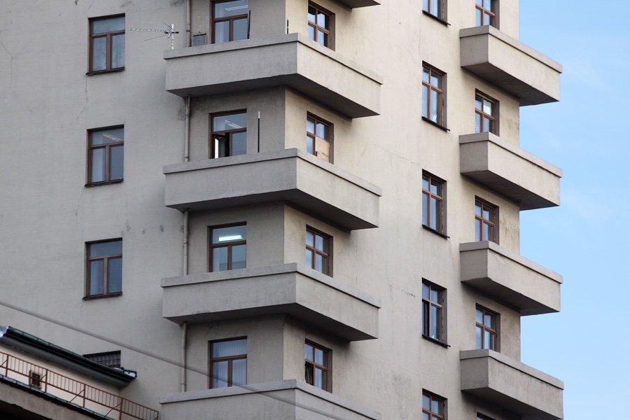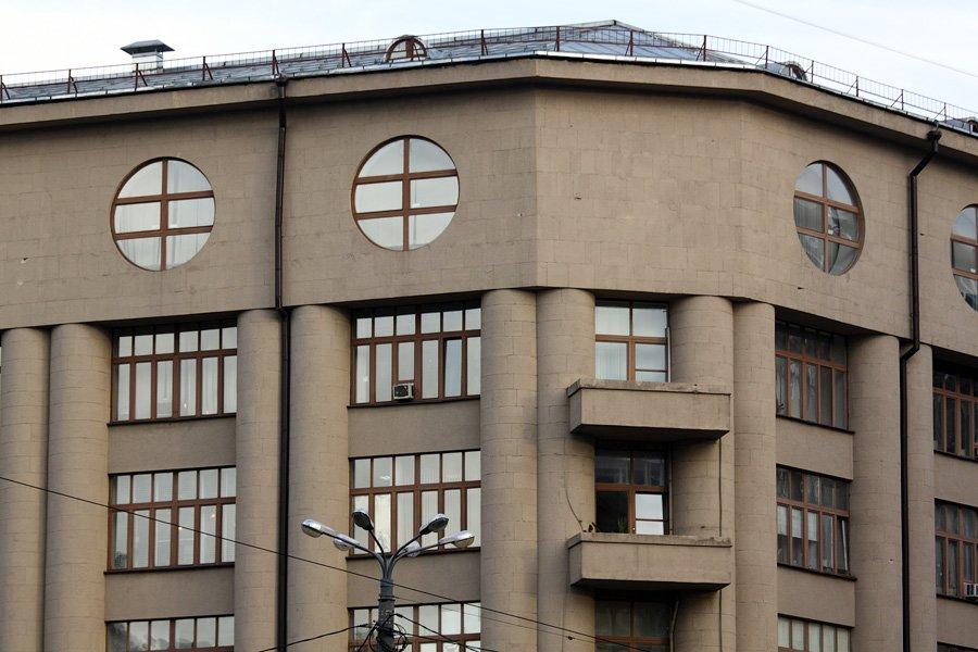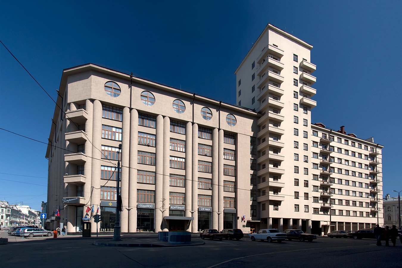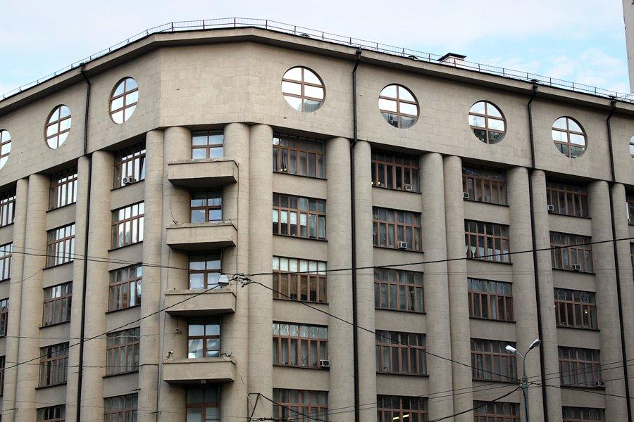 Здание выстроено на месте снесенной Третьей московской гимназии. В1928 году на закрытом конкурсе победил проект петербуржца Фомина, мастера старой школы, работавшего в стиле неоклассики. Монументальный угловой офисный корпус с гигантскими спаренными колоннами отделяется высокой башней от жилого корпуса с криволинейными фасадами, который имеет не такие высокие этажи и выполнен в менее монументальных формах. С другой стороны переулка планировалось построить симметричный корпус, тогда бы здания образовали бы своеобразные пропилеи — сквозь них Кузнецкий мост должен был продолжаться новым проспектом. Но в результате, напротив было построено здание по другому проекту, а расширения соседних улиц так и не произошло.
