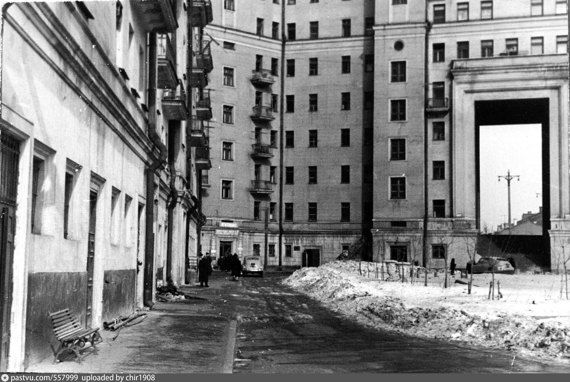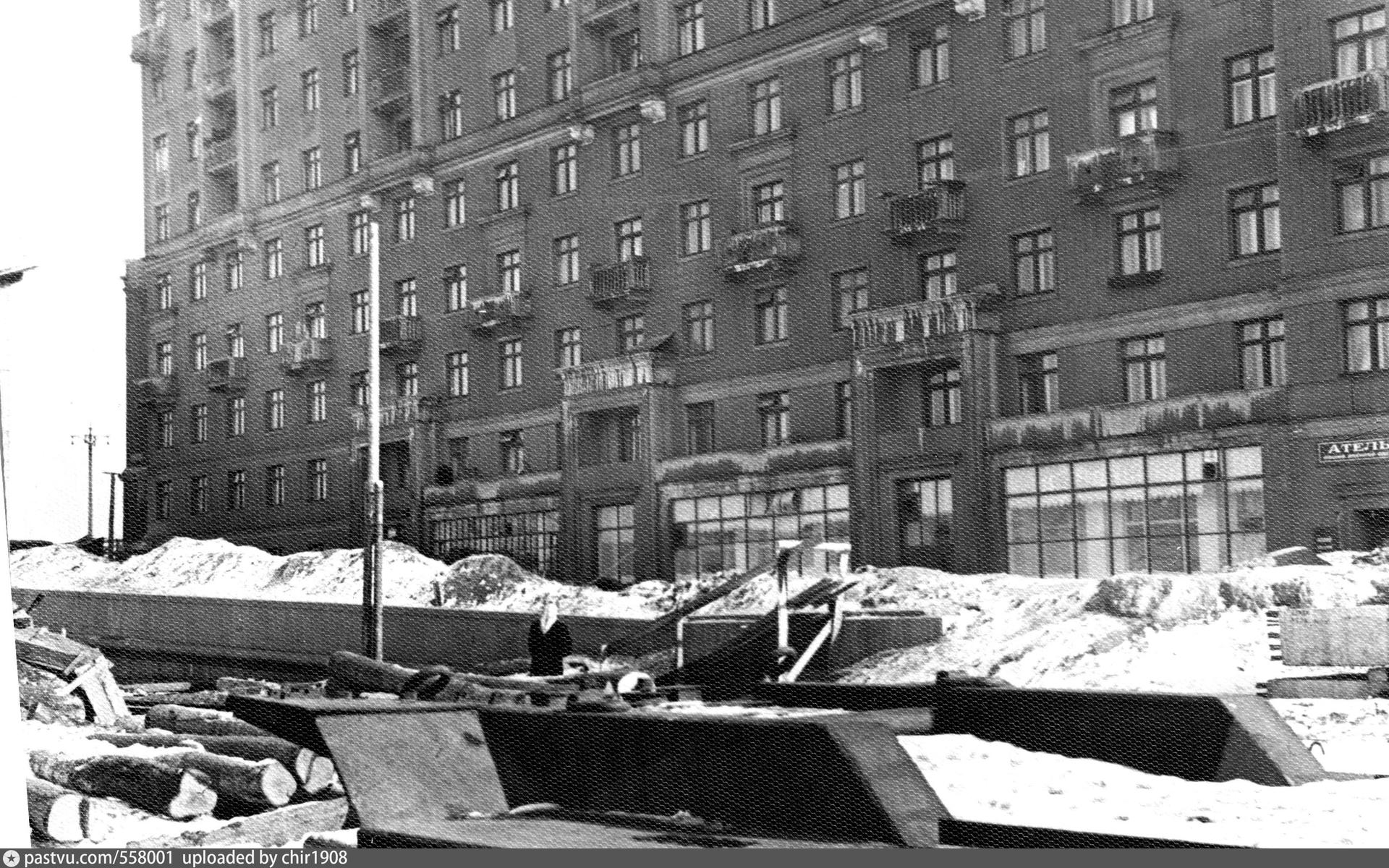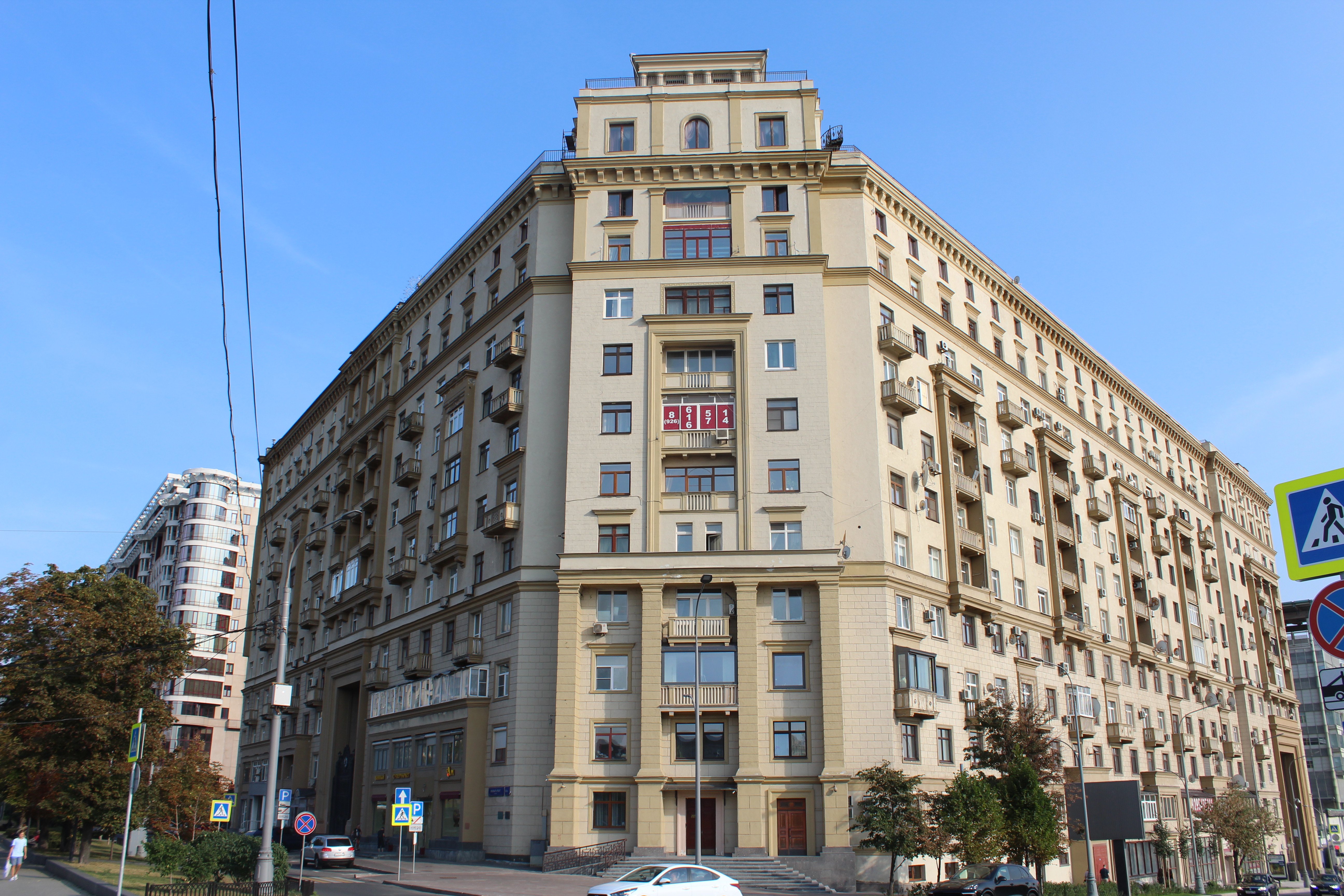 В 1937-1939 гг. был построен 11-этажный дом на углу Смоленской набережной и Большого Новинского переулка (ныне – Новый Арбат). Переменная высотность здания продиктована рельефом местности с перепадом вдоль Смоленской набережной и остроугольной формой участка. Два крыла здания соединены в срезанном углу, акцентированном башнеобразным объемом в 2,5 этажа.