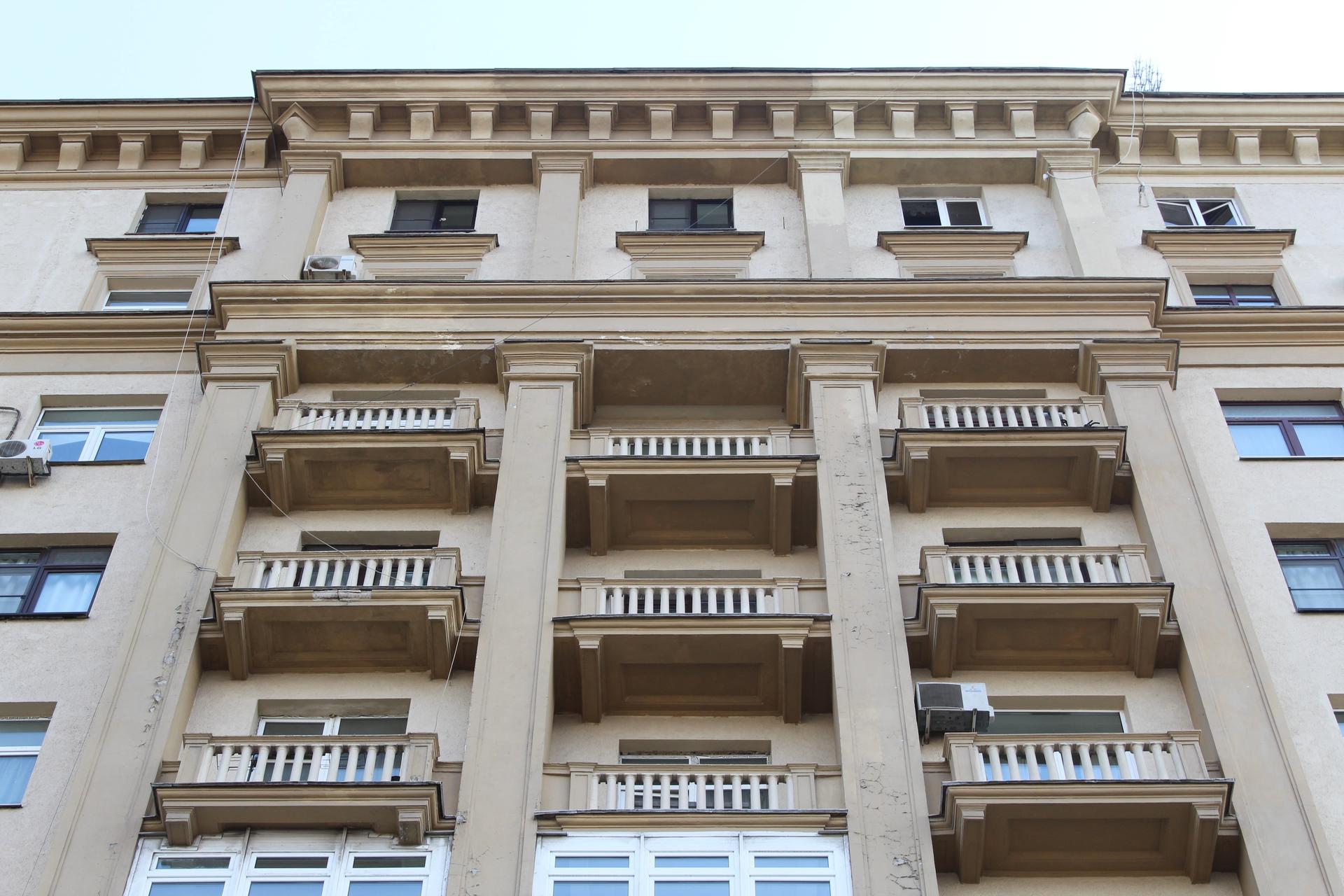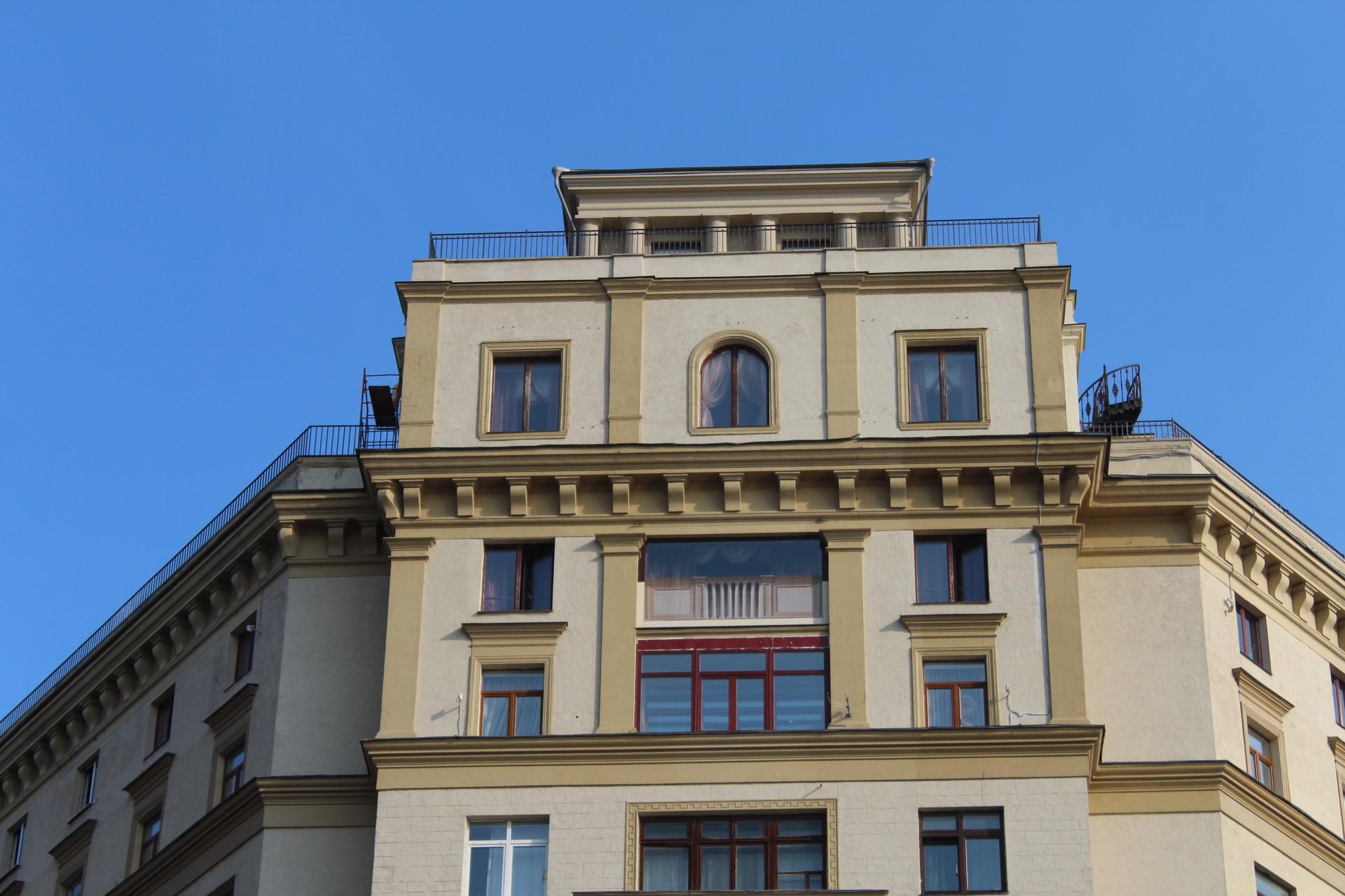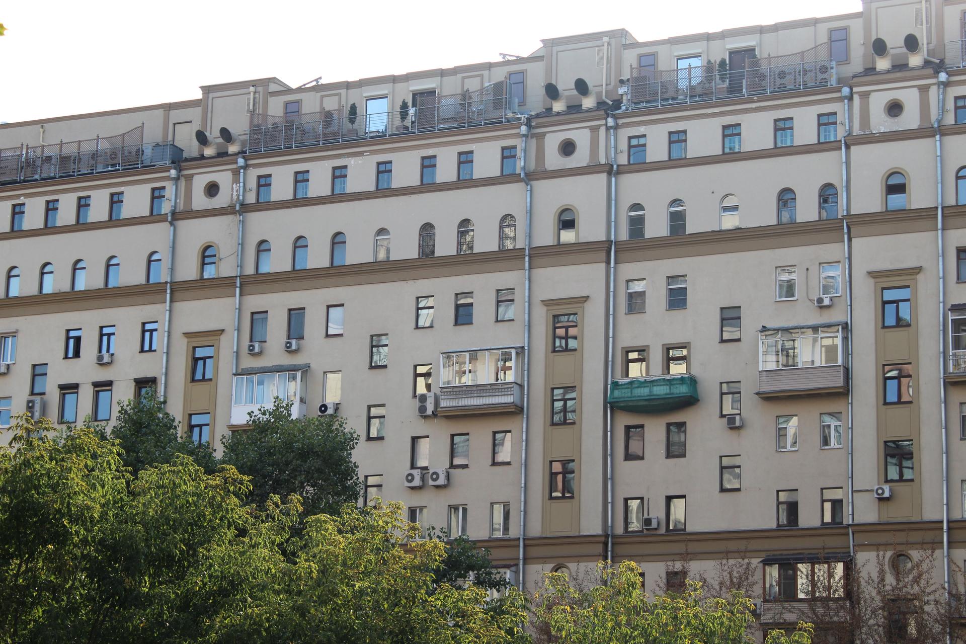 В 1937-1939 гг. был построен 11-этажный дом на углу Смоленской набережной и Большого Новинского переулка (ныне – Новый Арбат). Переменная высотность здания продиктована рельефом местности с перепадом вдоль Смоленской набережной и остроугольной формой участка. Два крыла здания соединены в срезанном углу, акцентированном башнеобразным объемом в 2,5 этажа.