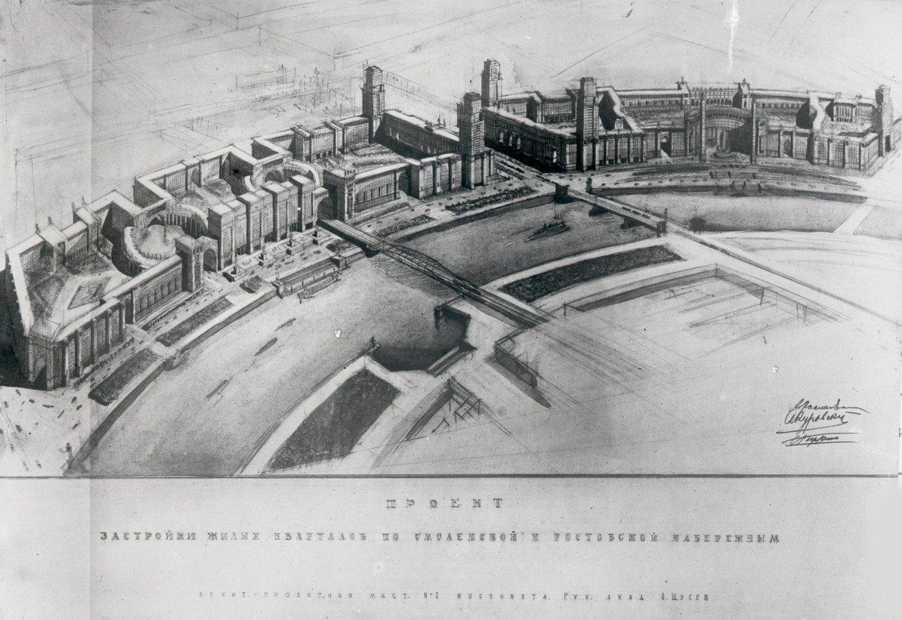 В 1934-1938 гг. А. В. Щусев с архитекторами своей мастерской работает над проектом комплексной застройки Смоленской и Ростовской набережных. Реконструкция набережных, примыкающих к Бородинскому мосту, являлась проектом первой очереди по застройке жилыми кварталами набережных столицы.