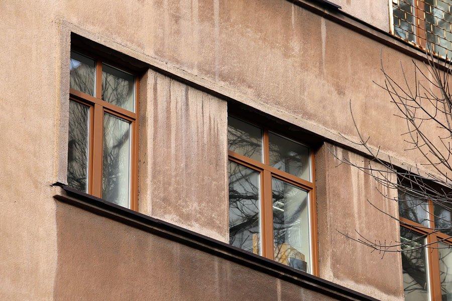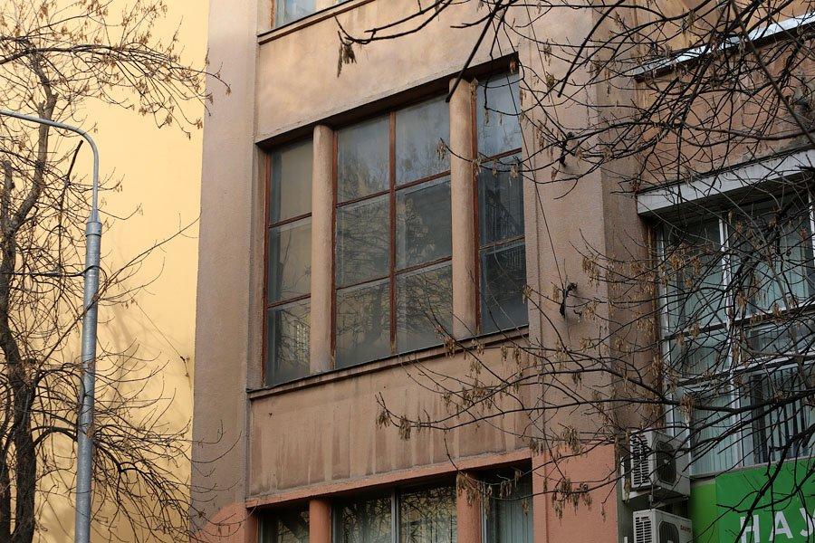 Справа и слева общественный блок обрамляют корпуса, перпендикулярные жилой части. Окна, расположенные на углу правого корпуса, характерны для конструктивистских построек. Жилой блок состоит из одинаковых на первый взгляд секций с двумя квартирами на этаже. Но по задумке архитекторов каждая секция была уникальной. Например, в подъезде №1 угловые квартиры спланированы пятикомнатными и имеют самую большую площадь в доме – 134 кв.м. Таких квартир в этом подъезде всего три, и все они расположены выше четвертого этажа. Квартиры с первого по четвертый этаж – трехкомнатные. Несложно понять, что квартиры с дополнительной площадью предназначались для более высокопоставленных жителей.