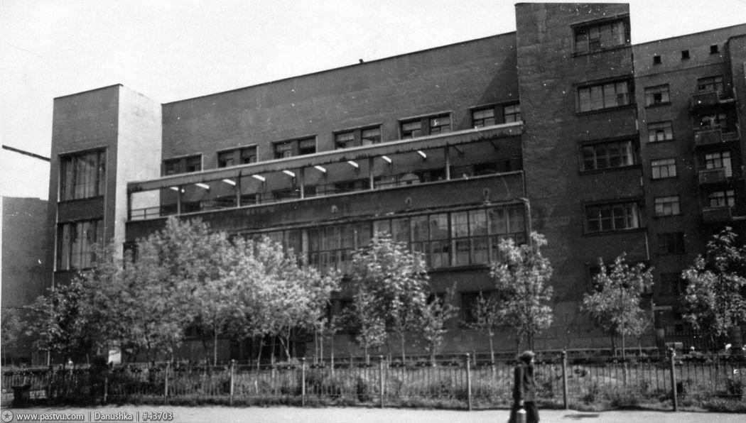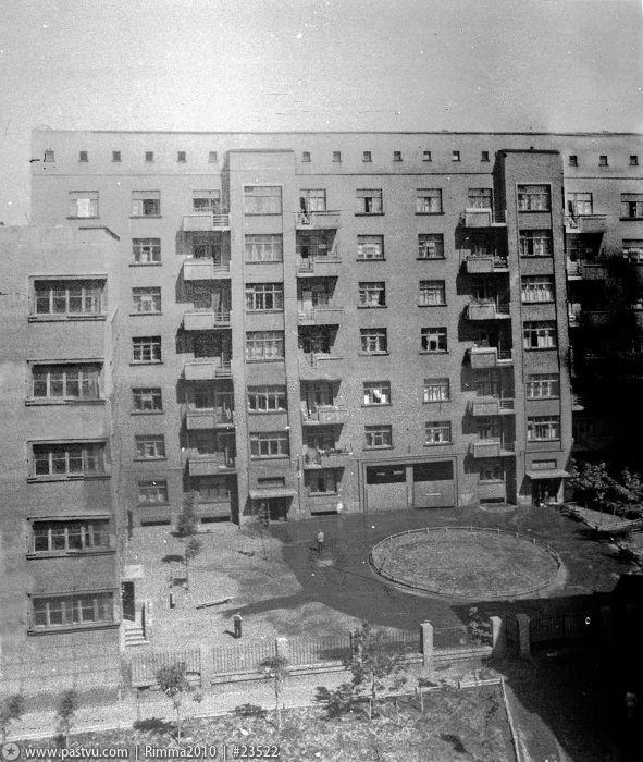 Выстроенный здесь в 1934 году архитекторами А. Я. Лангманом, Л. З. Чериковером, Н.И. Арбузниковым семиэтажный жилой корпус объединен с соседним трехэтажным блоком общественного назначения, выступающим вперед наподобие портика. Четырехэтажный многофункциональный общественный блок включал помещения клуба, столовой, детского сада и яслей, общежития и парикмахерской. После завершения в 1935 году строительных и отделочных работ началось заселение дома сотрудниками ведомства.