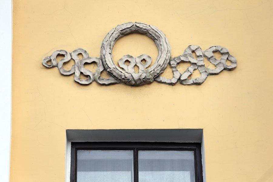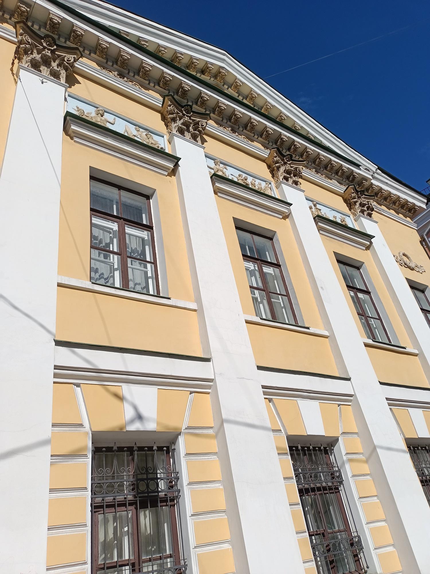 Дворовый фасад с небольшим мезонином сохранил основы декоративной отделки допожарного здания.