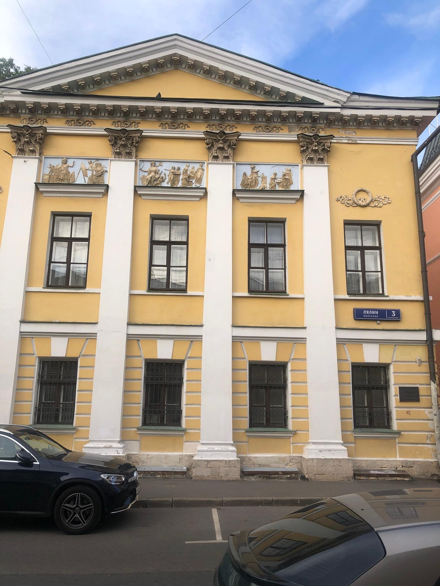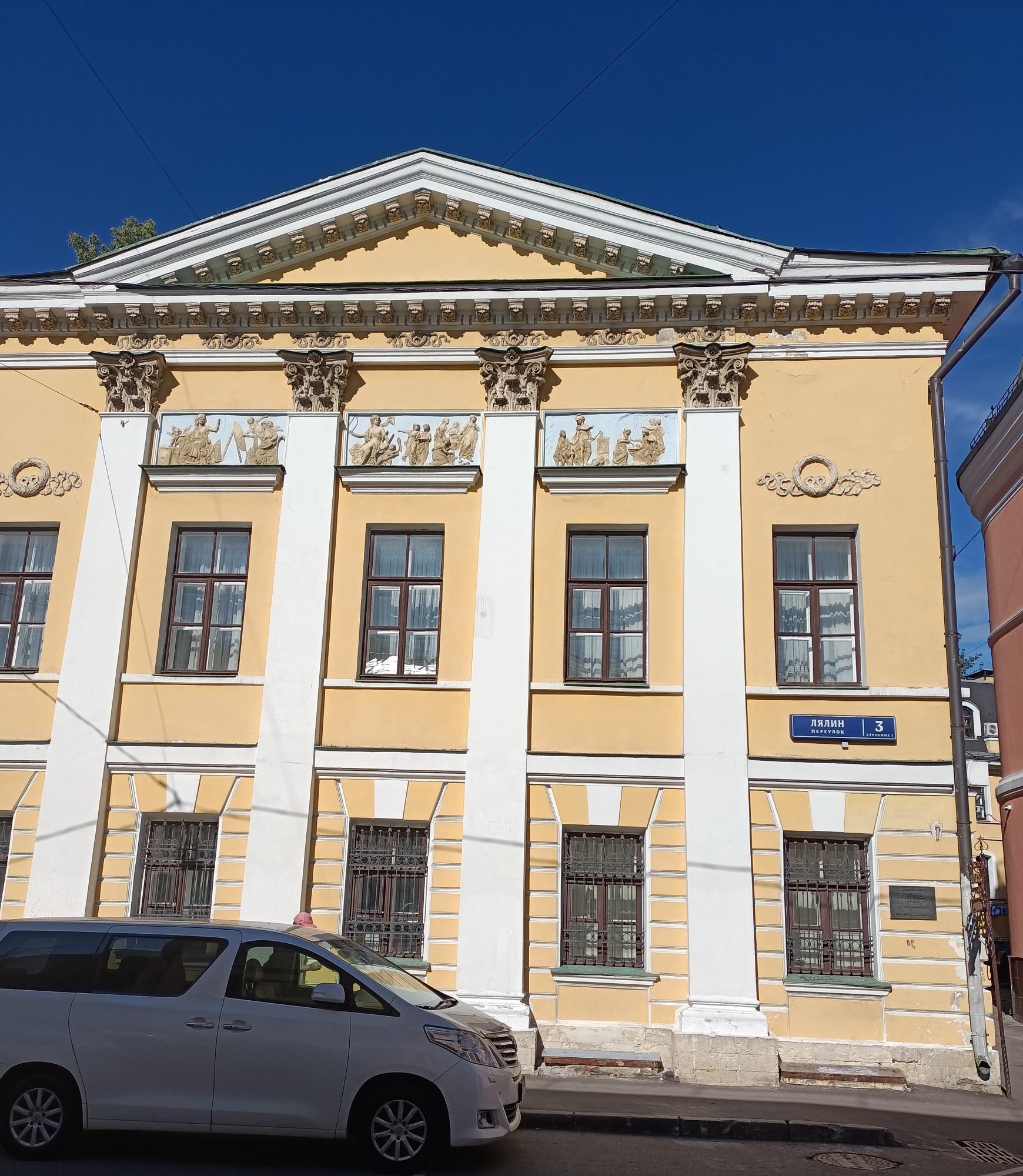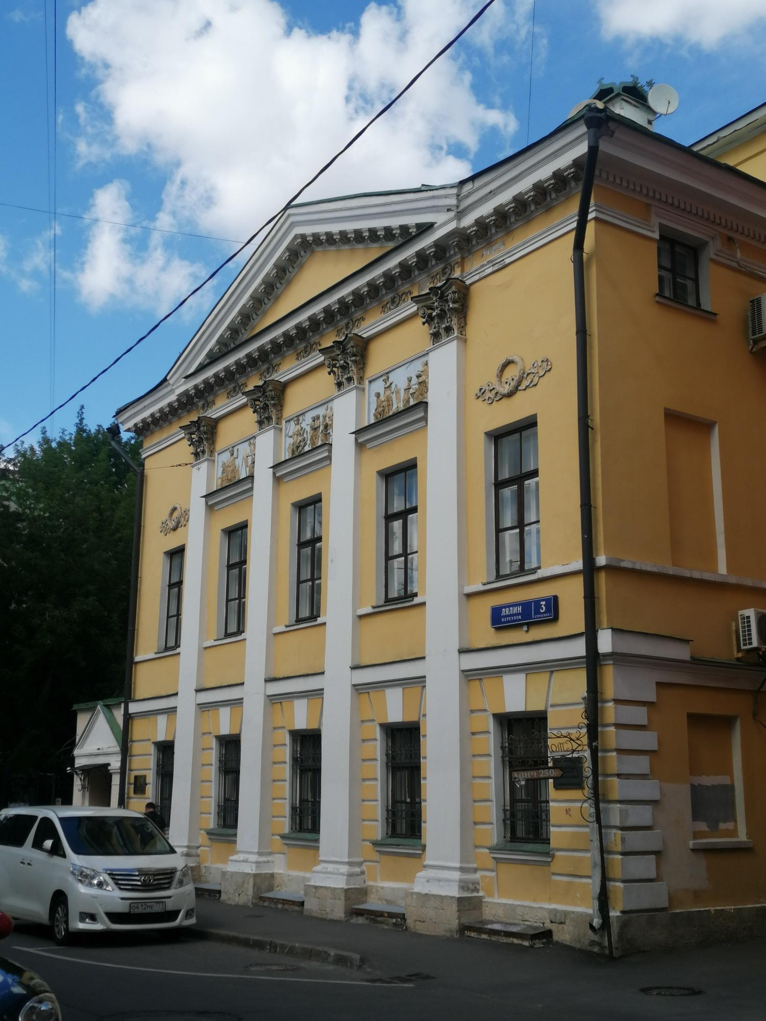 Д. 3 стр. 1 по Лялину переулку – очень любопытное сооружение. На боковых фасадах видны остатки декоративной обработки стен здания второй половины XVIII века, входившего в усадьбу доктора Г.А. Скиадана, который занимал должность московского губернского доктора, принимал активное участие в борьбе с эпидемией чумы в 1771 г. (его владение в XVIII веке включало современные участки № 3 и № 5 и продолжалось дальше, занимая часть Лялиной площади).