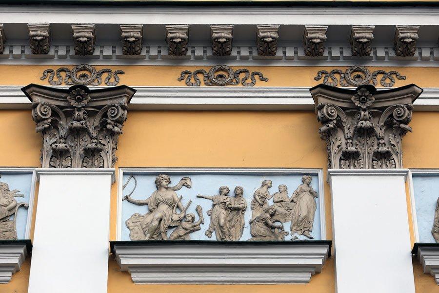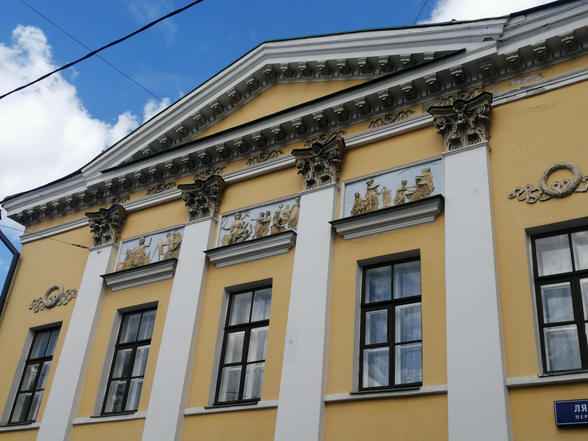 Боковой фасад, решенный как главный, обращен к переулку. Между четырьмя пилястрами коринфского ордера, объединяющими все этажи здания, над окнами третьего этажа расположены три рельефных панно.
