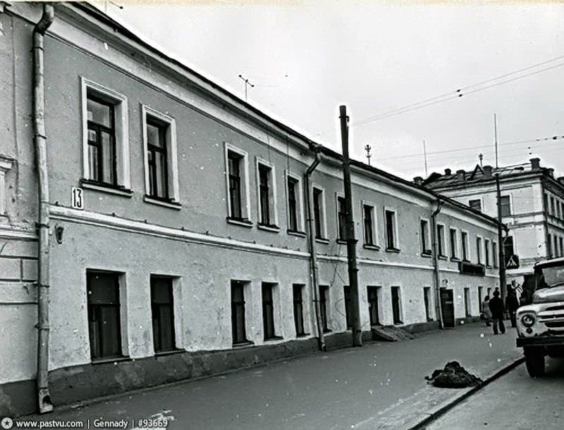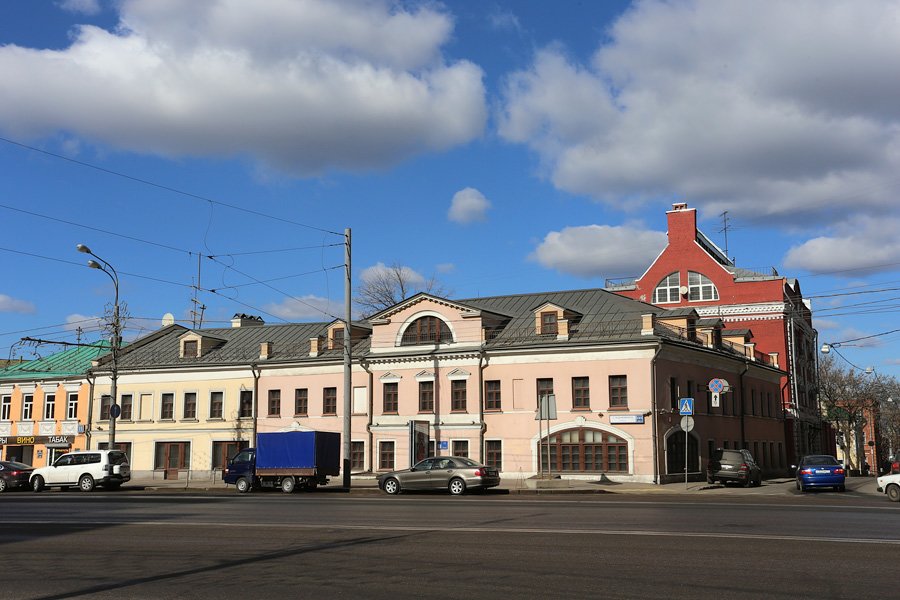 Каменное двухэтажное здание было построено не позднее 1804 г. как главный дом усадьбы. К 1822 г. двухэтажный дом был надстроен мезонином. В 1844 г. на присоединенном участке с западной стороны к дому пристроили двухэтажное здание, автором проекта которого стал архитектор В. А. Балашов. Первый этаж вновь возведенного строения сдавался под магазины, а второй — под квартиры. В 1853 г. на первом этаже были растесаны большие витринные окна. С этого времени облик здания в целом не менялся, композиция и отделка его были достаточно лаконичны. Оно стояло на высоком цоколе. Фасад угловой части имел 11 прямоугольных оконных проемов на двух этажах. В западной части здания до растески насчитывалось семь оконных проемов на обоих этажах. Верхняя часть фасадов была увенчана штукатурным профильным наличником, в старой части — белокаменным профилем. Оформление уличных фасадов обоих зданий дополнял единый междуэтажный пояс.
