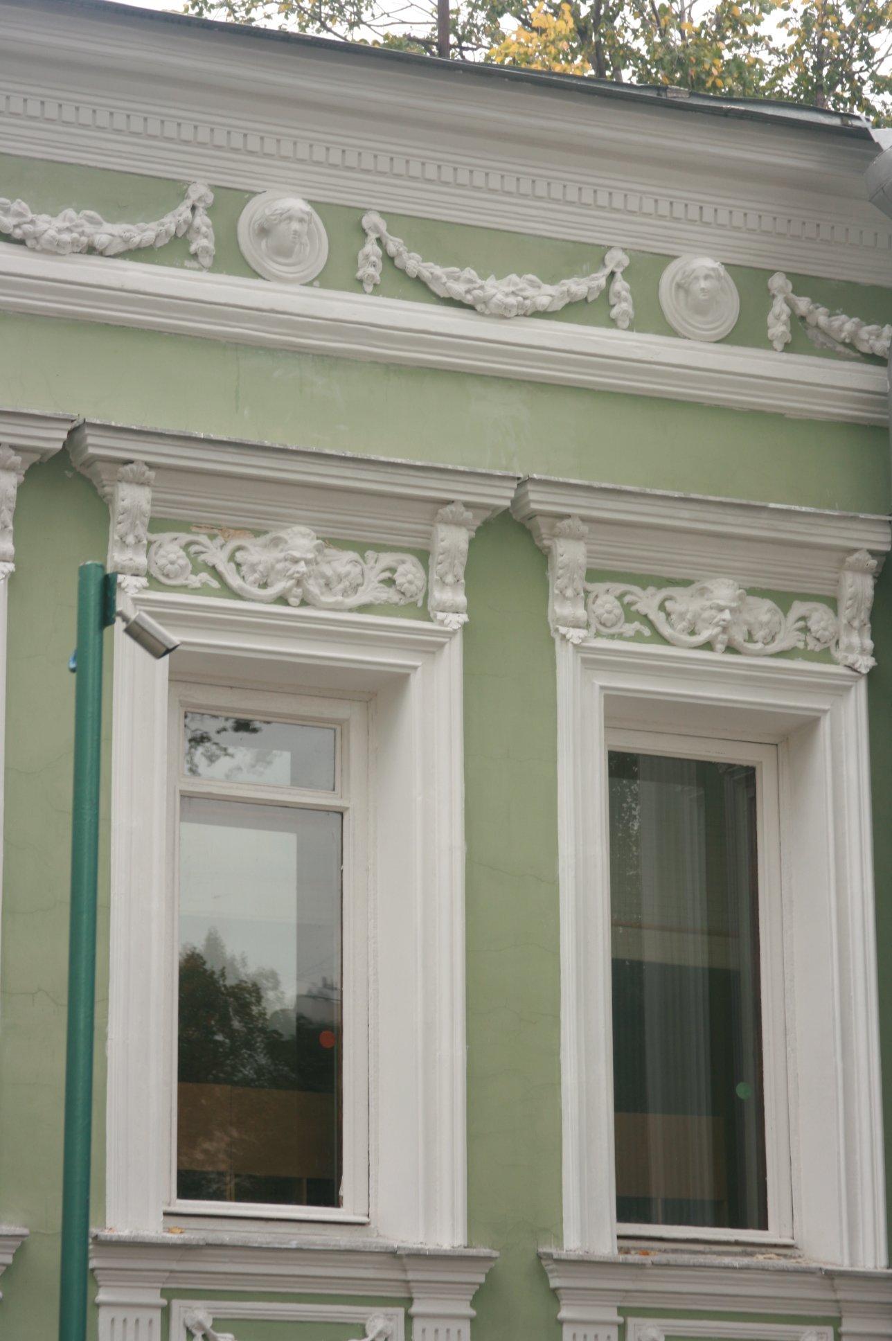 Для художественного оформления южного и северного (дворового) фасадов характерно обилие декора. Окна 2-го этажа обрамлены наличниками с консолями и сложнопрофилированными сандриками с растительным лепным орнаментом и маскаронами. Парадная дверь фланкирована гладкооштукатуренными пилястрами, а окно над ней каннелированными пилястрами с коринфскими капителями. Простенок между венчающим карнизом с сухарикамии и профилированной тягой над окнами 2 этажа декорирован медальонами с лепными женскими головками и гирляндами.