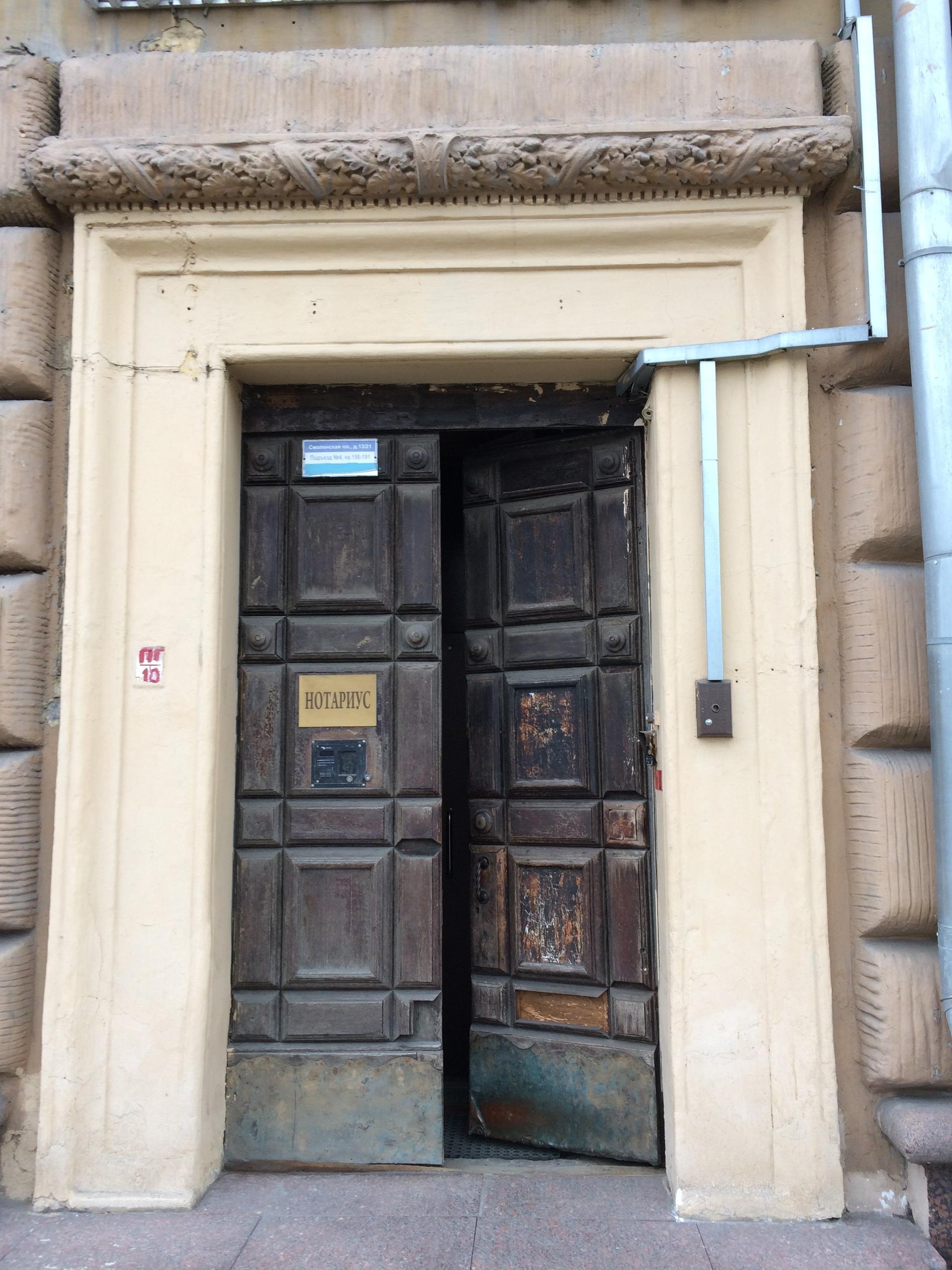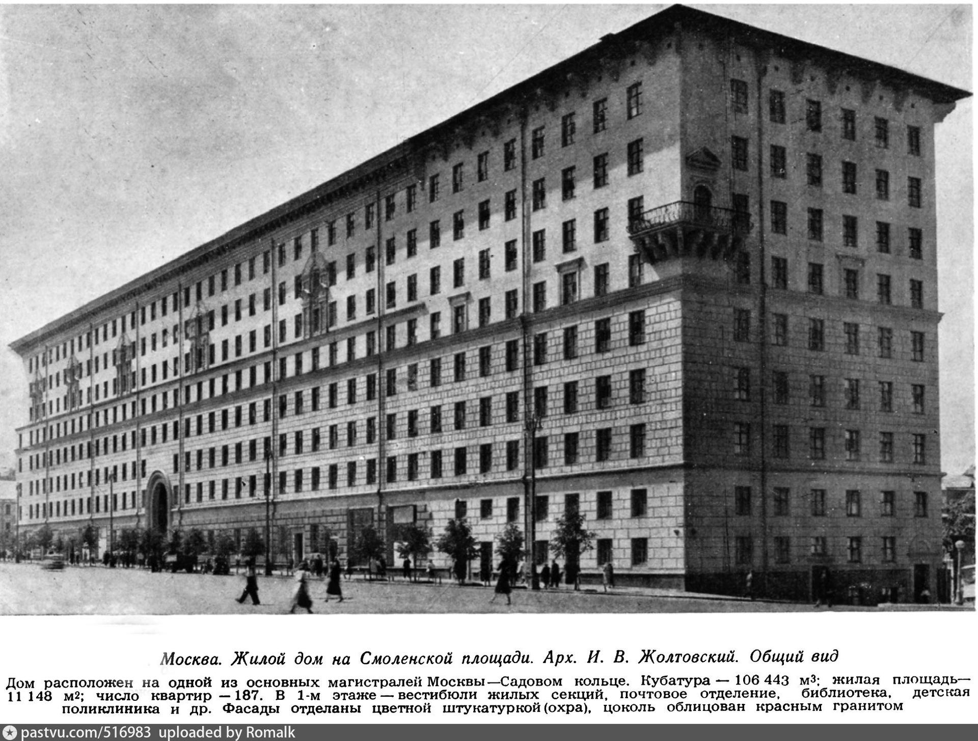 Во двор выходят остекленные эркеры лестничных клеток, а также балконы с расположенными на них пожарными лестницами. Строительство дома было окончено в 1953 г. Первый этаж отведен для размещения объектов культурно-бытовой инфраструктуры. Здесь расположены Центральная библиотека им. Н. А. Добролюбова, отделение почты, учреждение здравоохранения и другие организации. В подвале дома находится подземная автостоянка с въездом со стороны двора. В торцевой части дома размещен вестибюль станции метро «Смоленская» Филевской линии, перенесённый сюда в середине 1950-х гг. из отдельно стоявшего павильона.