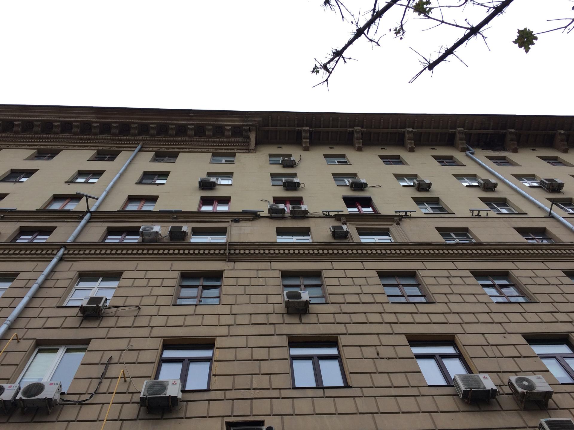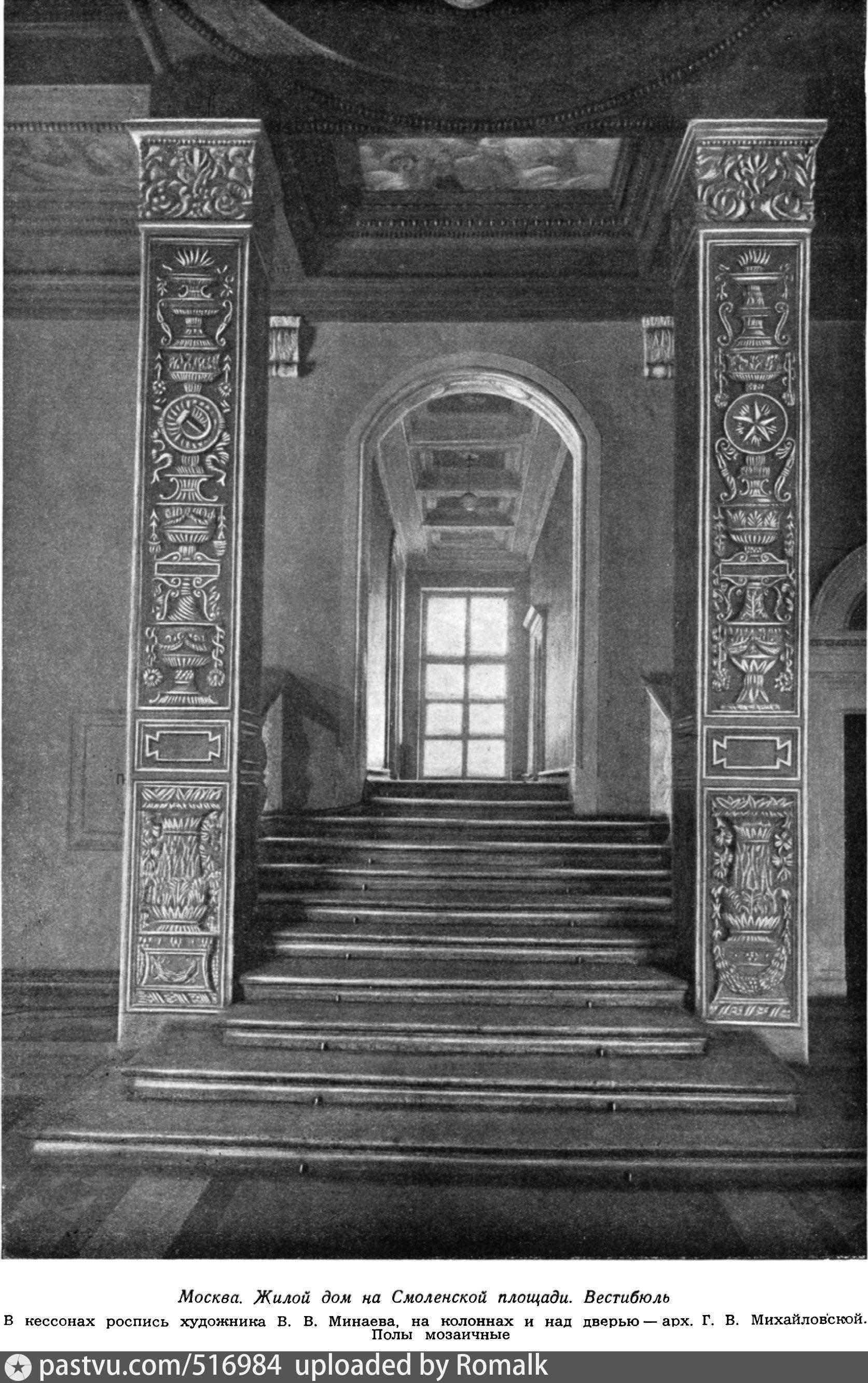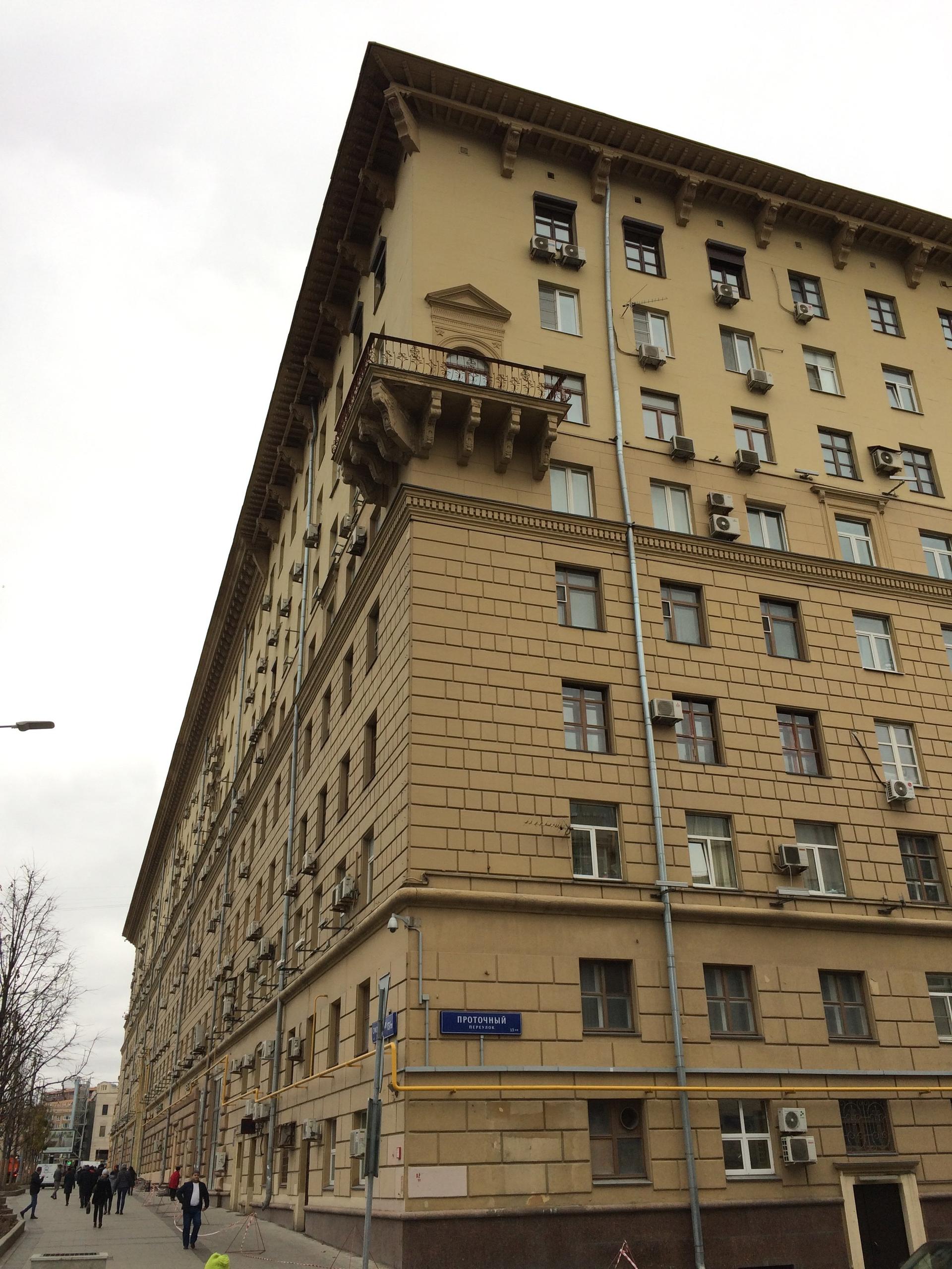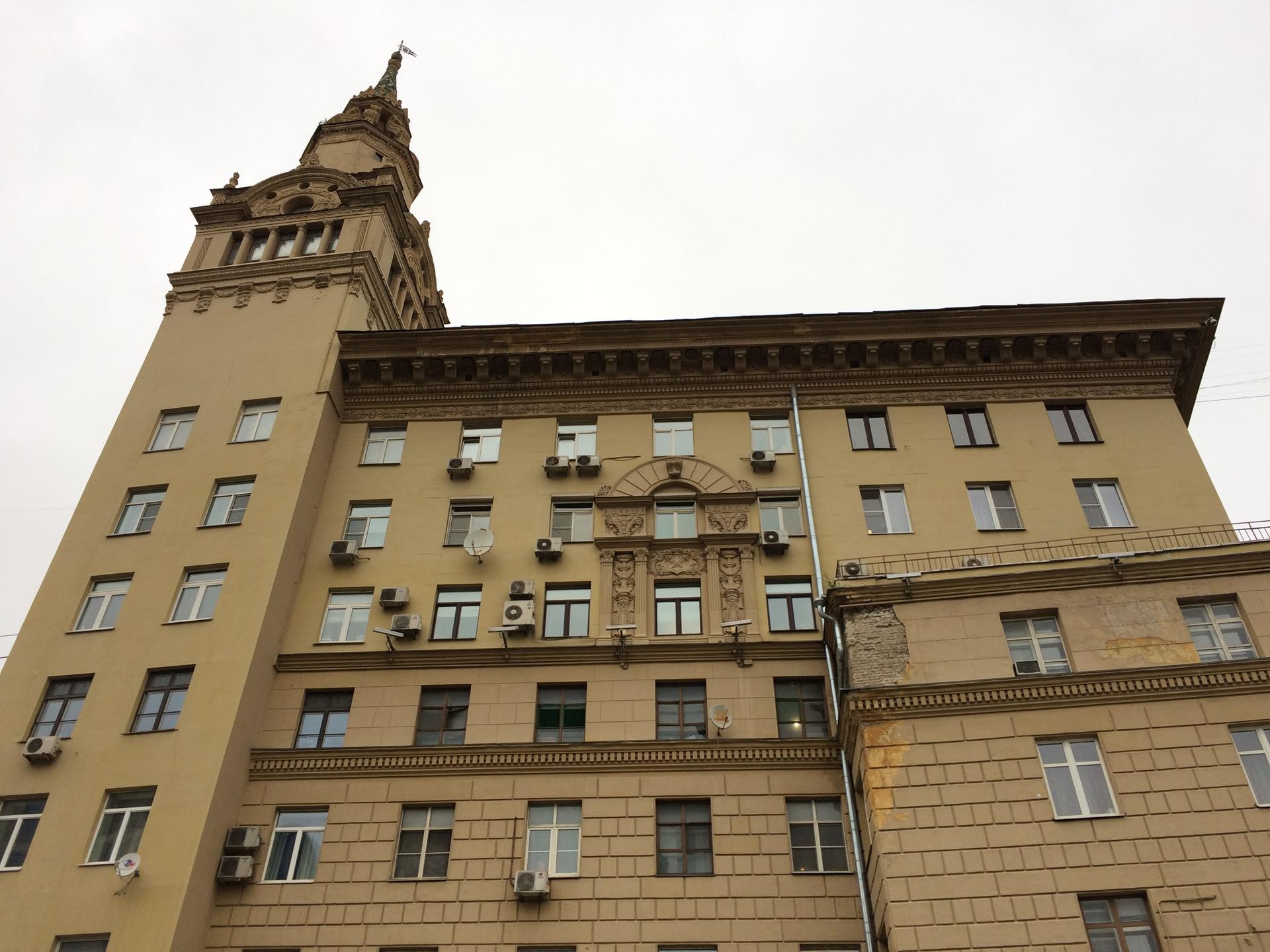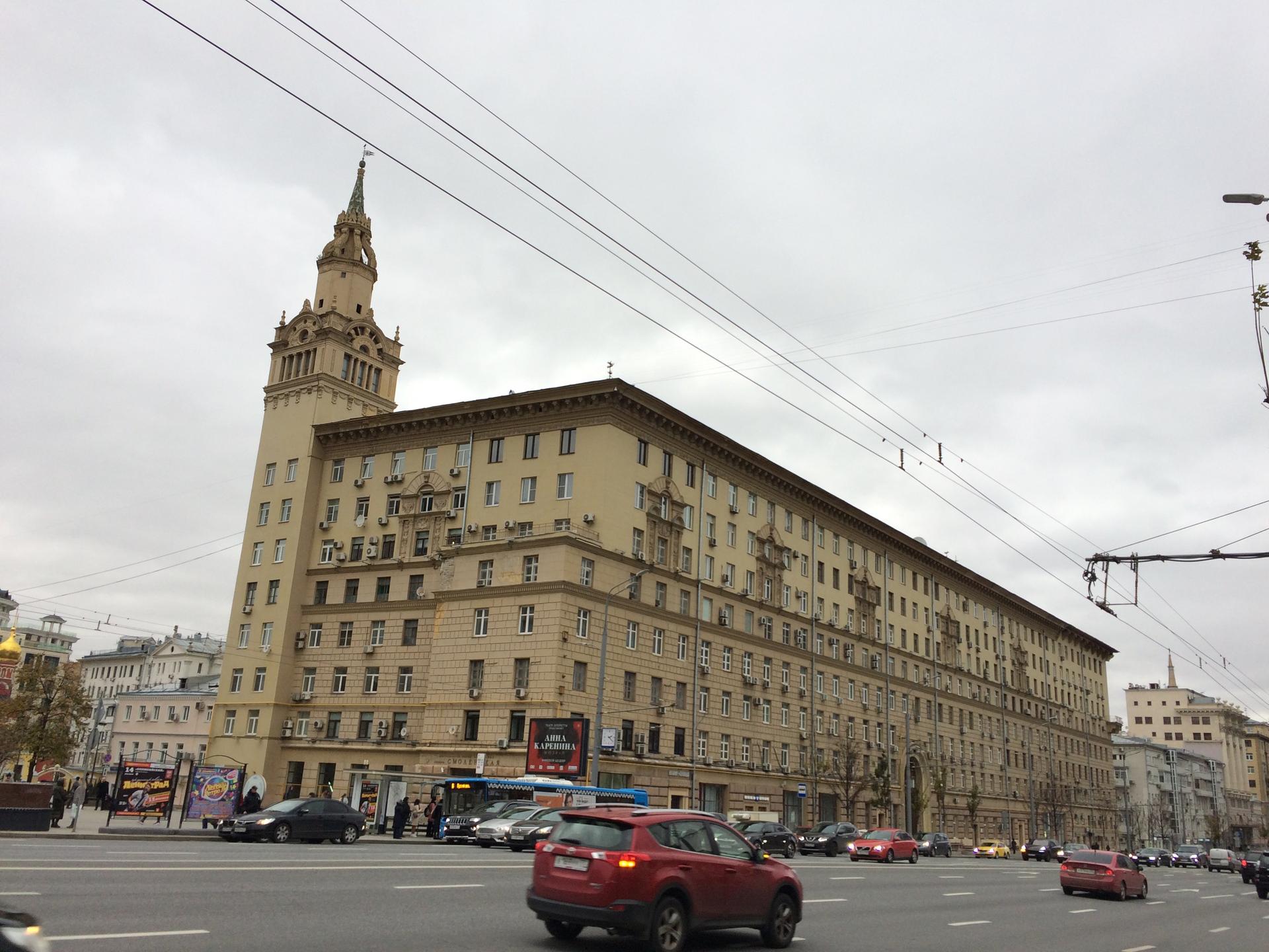 Строительство жилого дома Хозяйственного управления МВД СССР на Смоленском бульваре (тогда – улица Чайковского) началось еще до войны одновременно с домом Хозяйственного управления Совета Министров СССР на Большой Калужской улице, д. 11 (сейчас – Ленинский проспект). Эти здания во многом схожи: восьмиэтажный протяженный жилой корпус с главным фасадом, лишенным балконов и увенчанным сильно вынесенным массивным карнизом. Нижний ярус зрительно утяжелен рустовкой – по примеру тосканских городских палаццо эпохи Ренессанса. Акцентами фасада служат декорированные лепниной обрамления окон шестого и седьмого этажей. Оригинальным приемом решения фасада является перемена типа венчающего карниза и ритма декоративных акцентов в трети фасада, удаленной от башни.