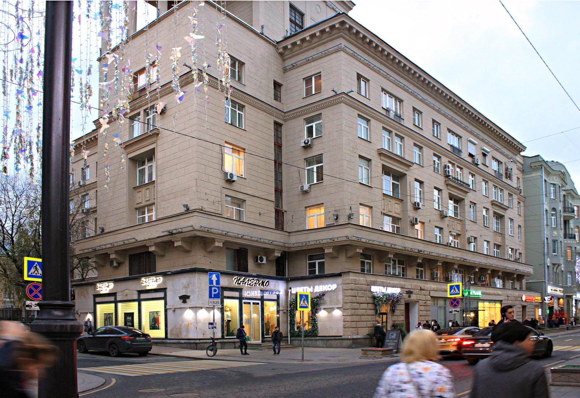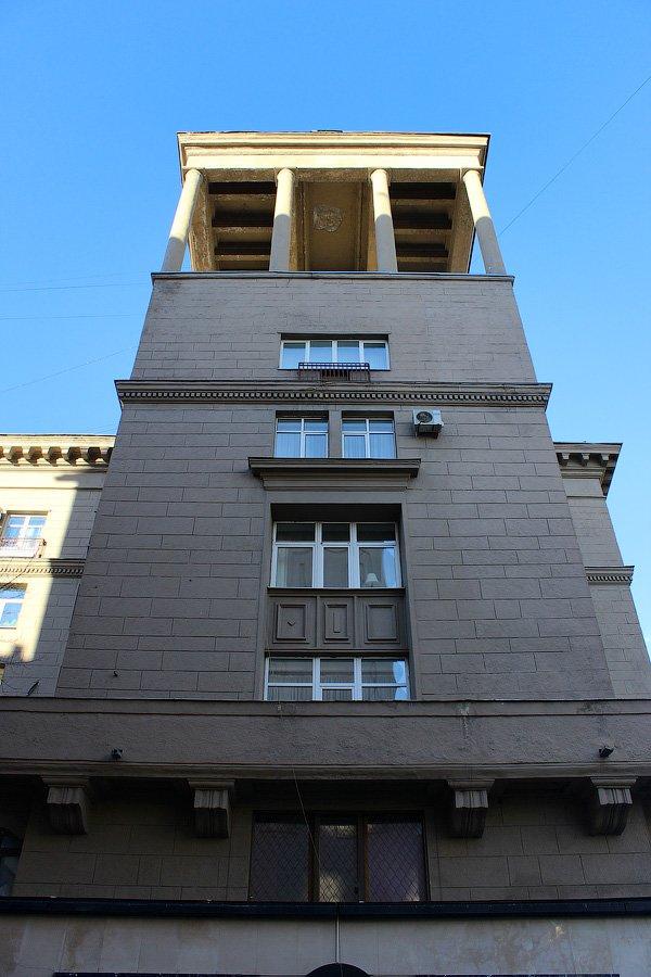 Угловой дом построен по проекту архитекторов В.Н. Владимирова и Г.И. Луцкого, сотрудников мастерской Наркомата тяжелой промышленности под руководством П. А. Голосова. Здание сочетает в себе стили неоклассики и лаконичного конструктивизма. Тяжелый рустованный первый этаж отделен от гладких стен верхних этажей глухим балконом, растянутым по всей длине здания. Первый этаж башни в советские годы занимала парикмахерская.