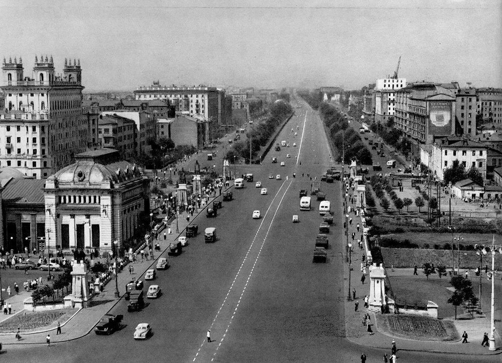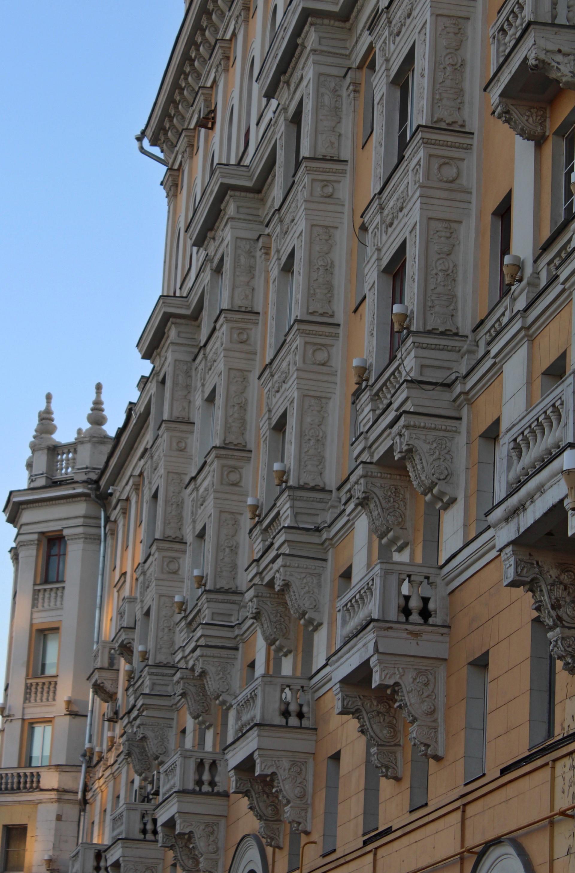 В начале 1950-х гг. началась перестройка дома, в результате которой п-образное в плане здание стало шестиэтажным. На открытой площадке основного строения был возведен дополнительный двухэтажный объем с антресолью и четырьмя башнями. По углам фасад по красной линии Ленинградского проспекта фланкировали граненые выступы. По центральной оси располагалась проездная арка с кессонированным сводом с растительным декором. Архитектурно-художественное решение фасада было выполнено в традициях советского неоклассицизма. Вертикальный ритм фасада подчеркнут пилястрами и рядами эркеров на декоративных кронштейнах, украшенных филенками с растительным орнаментом. Горизонтально плоскость фасада членилась на ярусы балюстрадами, междуэтажными профилированными карнизами, фризом из розеток и венчающим карнизом с модульонами. Доминантой сооружения были четыре прямоугольные башни по углам с арочными проемами, завершающиеся балюстрадой и скульптурным декором.