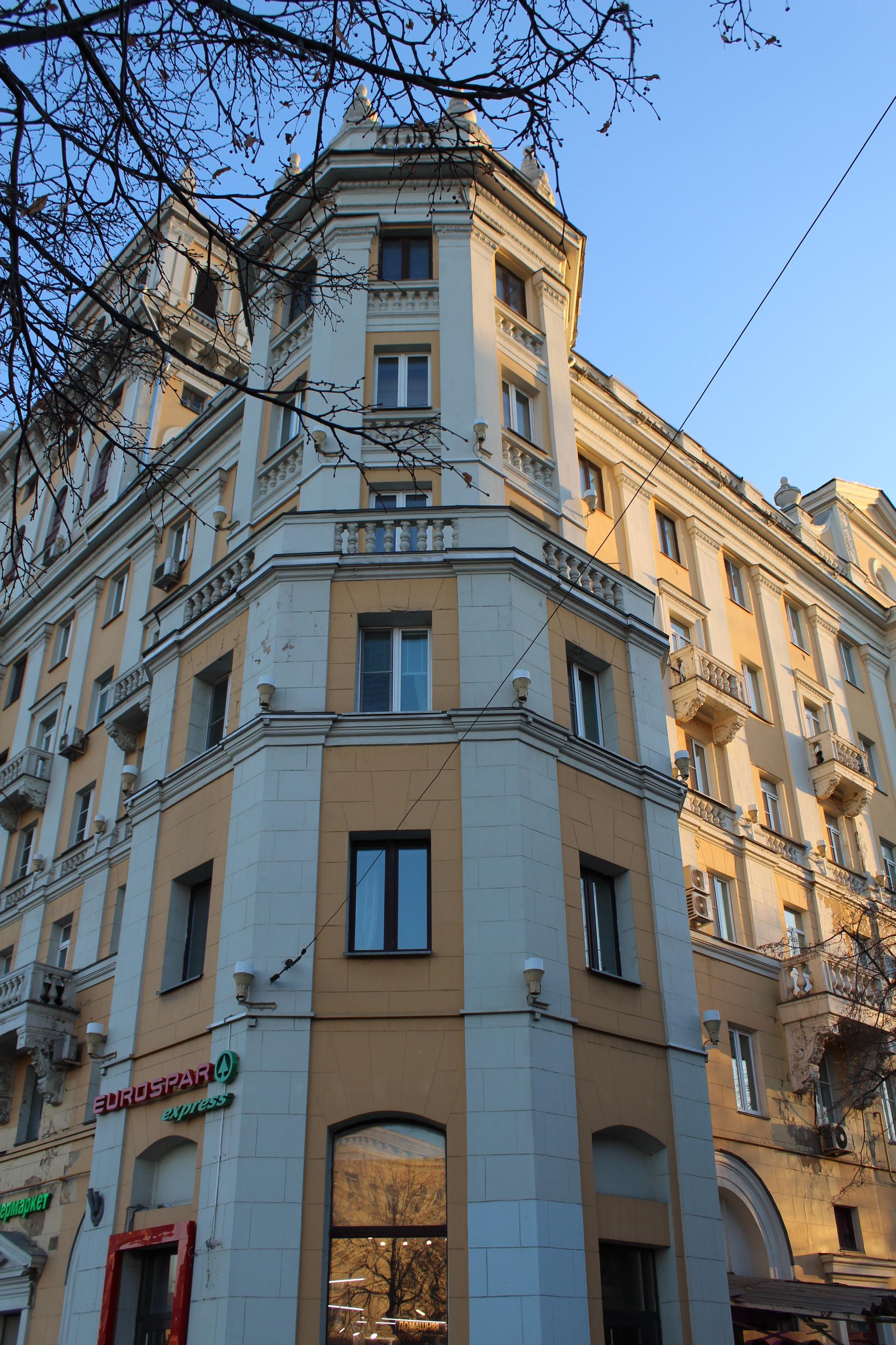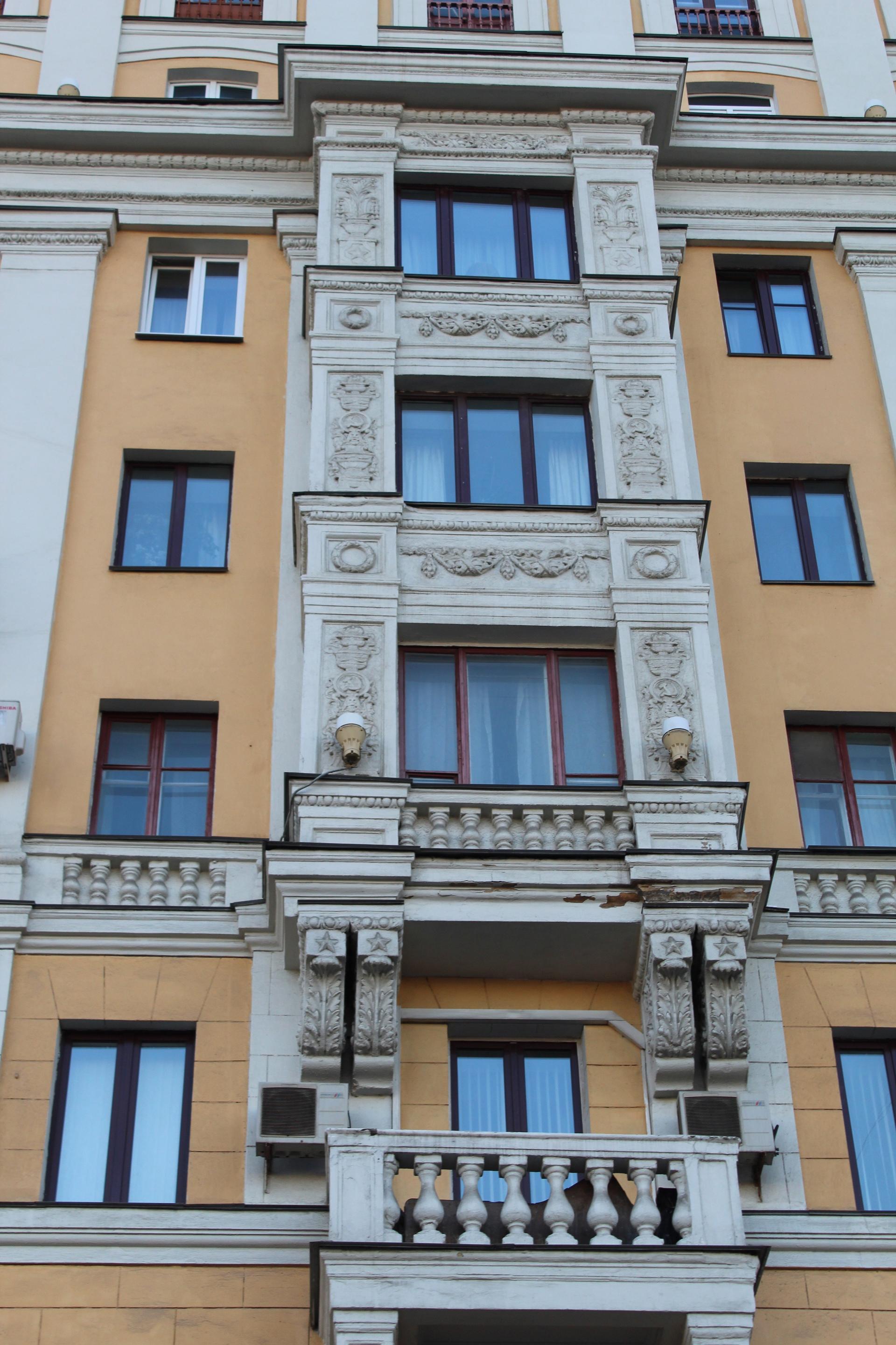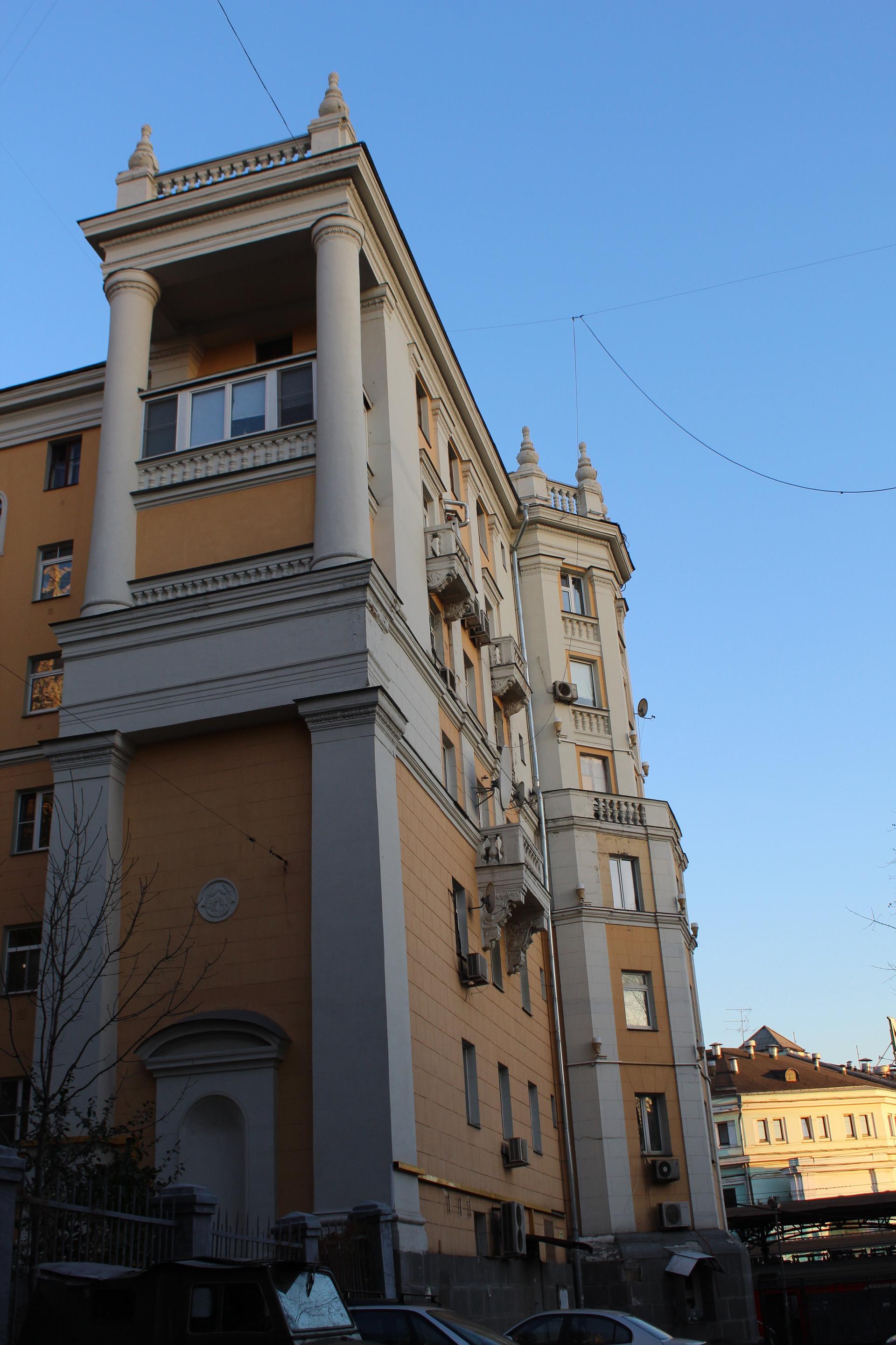В начале 1950-х гг. началась перестройка дома, в результате которой п-образное в плане здание стало шестиэтажным. На открытой площадке основного строения был возведен дополнительный двухэтажный объем с антресолью и четырьмя башнями. По углам фасад по красной линии Ленинградского проспекта фланкировали граненые выступы. По центральной оси располагалась проездная арка с кессонированным сводом с растительным декором. Архитектурно-художественное решение фасада было выполнено в традициях советского неоклассицизма. Вертикальный ритм фасада подчеркнут пилястрами и рядами эркеров на декоративных кронштейнах, украшенных филенками с растительным орнаментом. Горизонтально плоскость фасада членилась на ярусы балюстрадами, междуэтажными профилированными карнизами, фризом из розеток и венчающим карнизом с модульонами. Доминантой сооружения были четыре прямоугольные башни по углам с арочными проемами, завершающиеся балюстрадой и скульптурным декором.