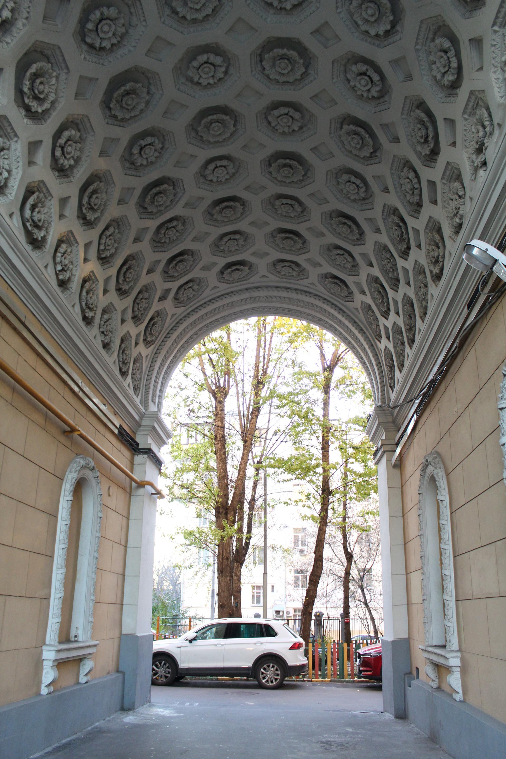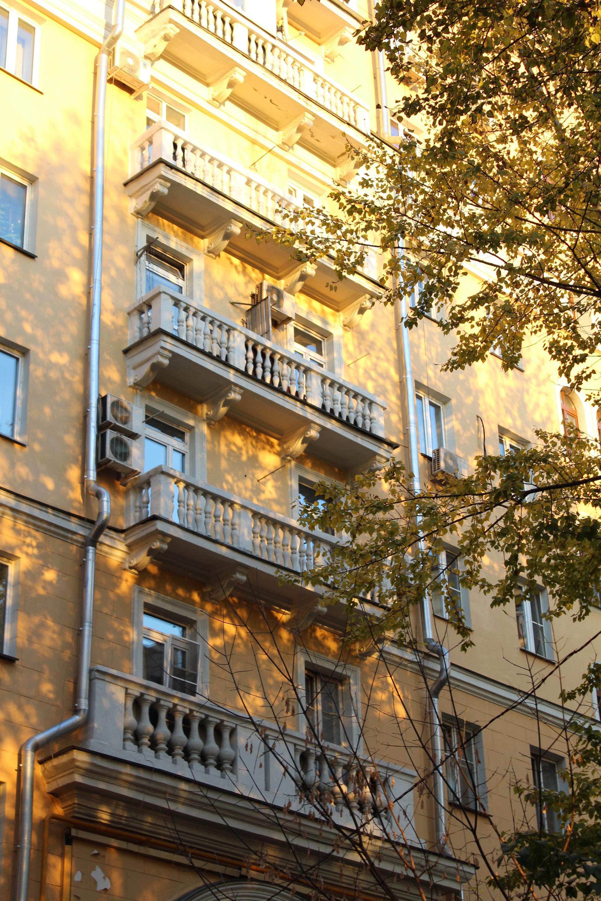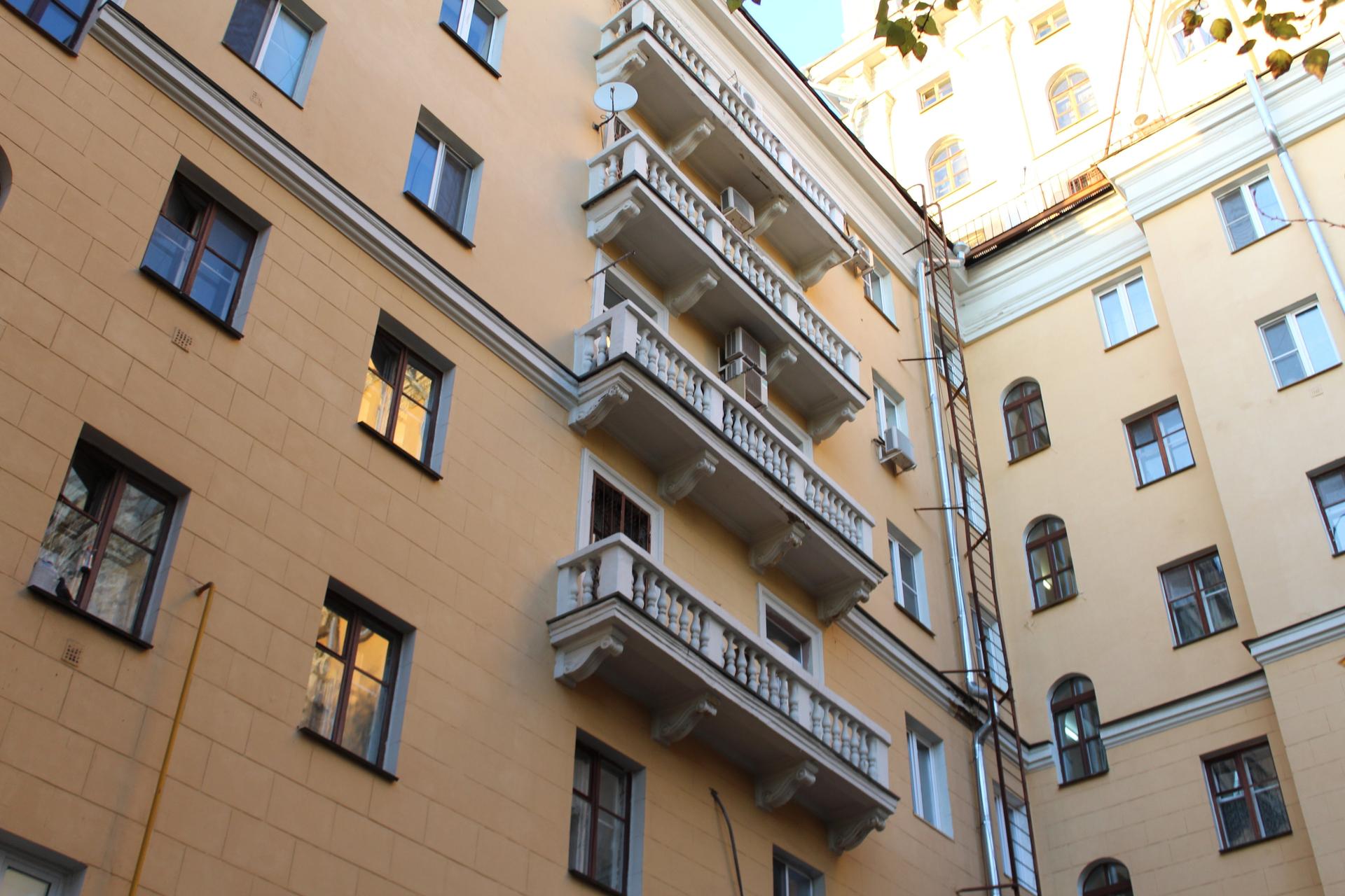 В начале 1950-х гг. началась перестройка дома, в результате которой п-образное в плане здание стало шестиэтажным. На открытой площадке основного строения был возведен дополнительный двухэтажный объем с антресолью и четырьмя башнями. По углам фасад по красной линии Ленинградского проспекта фланкировали граненые выступы. По центральной оси располагалась проездная арка с кессонированным сводом с растительным декором. Архитектурно-художественное решение фасада было выполнено в традициях советского неоклассицизма. Вертикальный ритм фасада подчеркнут пилястрами и рядами эркеров на декоративных кронштейнах, украшенных филенками с растительным орнаментом. Горизонтально плоскость фасада членилась на ярусы балюстрадами, междуэтажными профилированными карнизами, фризом из розеток и венчающим карнизом с модульонами. Доминантой сооружения были четыре прямоугольные башни по углам с арочными проемами, завершающиеся балюстрадой и скульптурным декором.