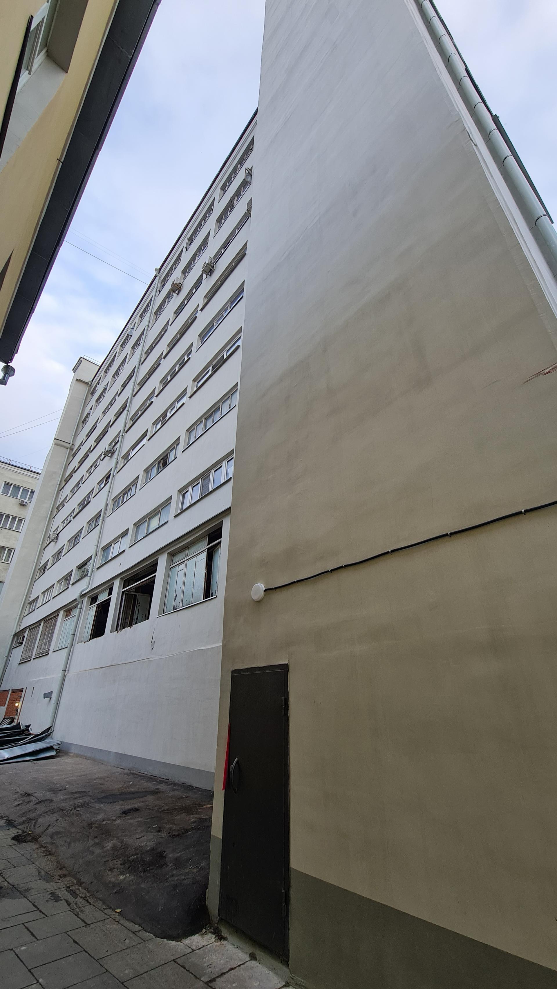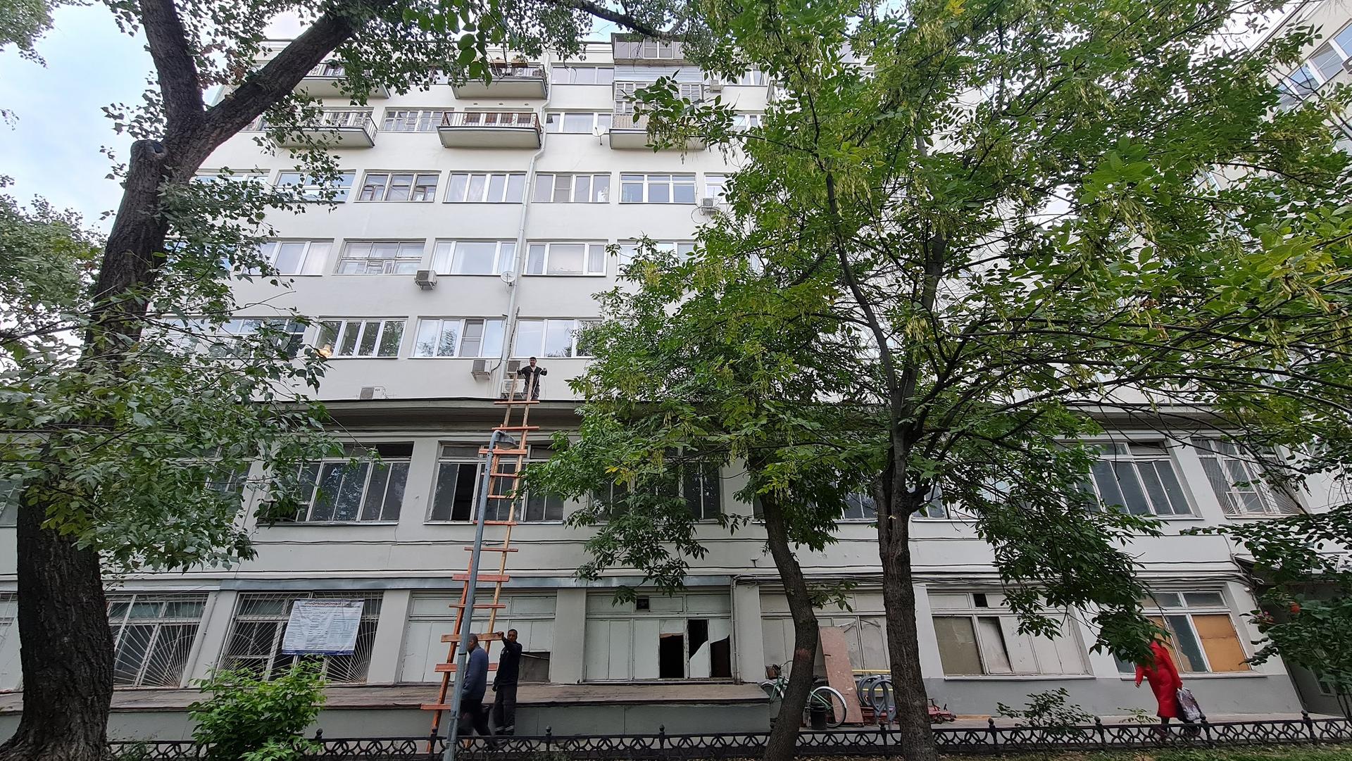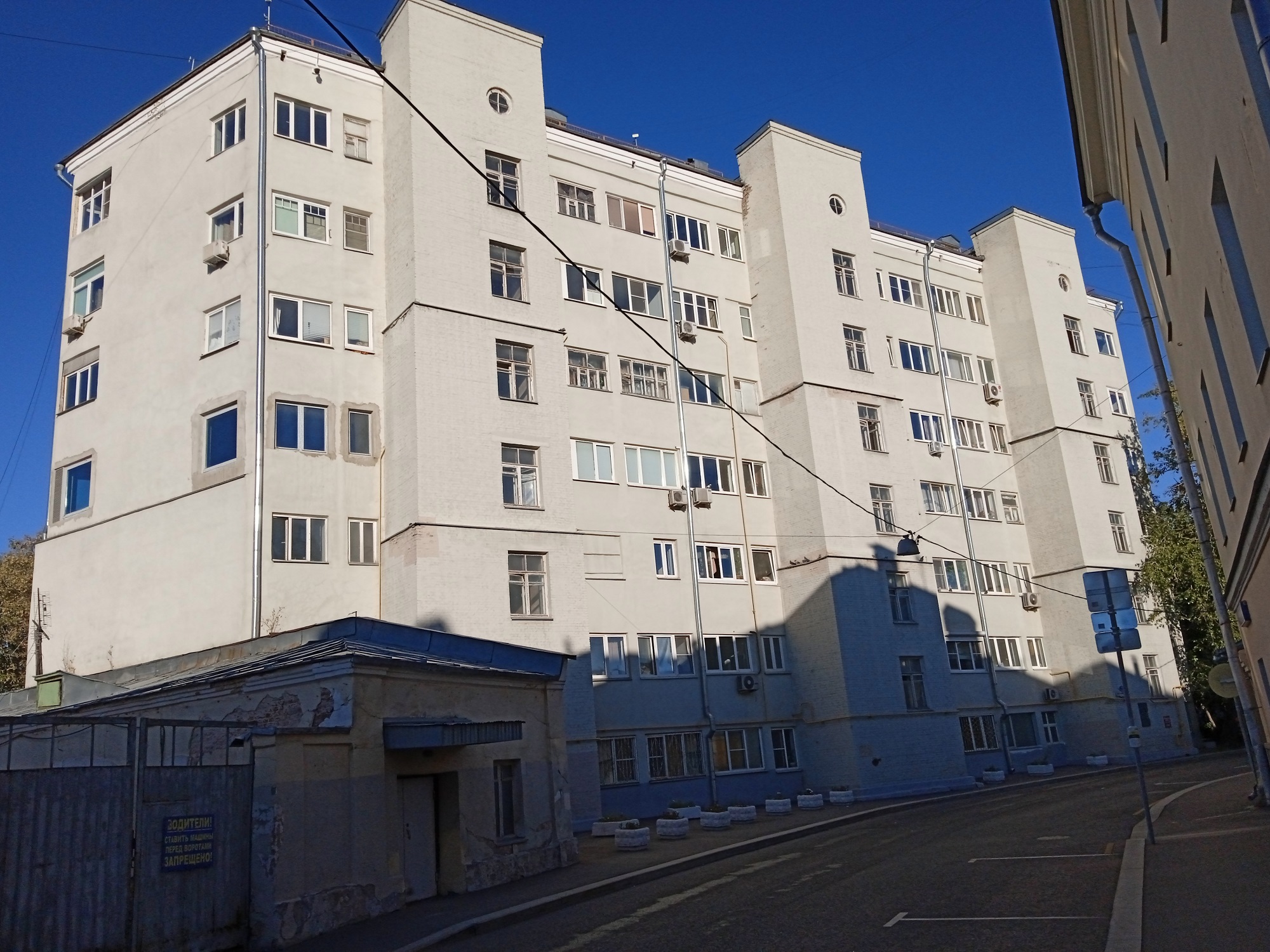 Лестницы располагались в полукруглых коробах со сплошным остеклением, вынесенных за линию фасада, выходящего в Большой Знаменский переулок. В 1950-е гг. в доме устроили лифты, не предусмотренные первоначальным проектом. Прямоугольные кирпичные лифтовые шахты были пристроены к лестницам и заняли все пространство тротуара в переулке.