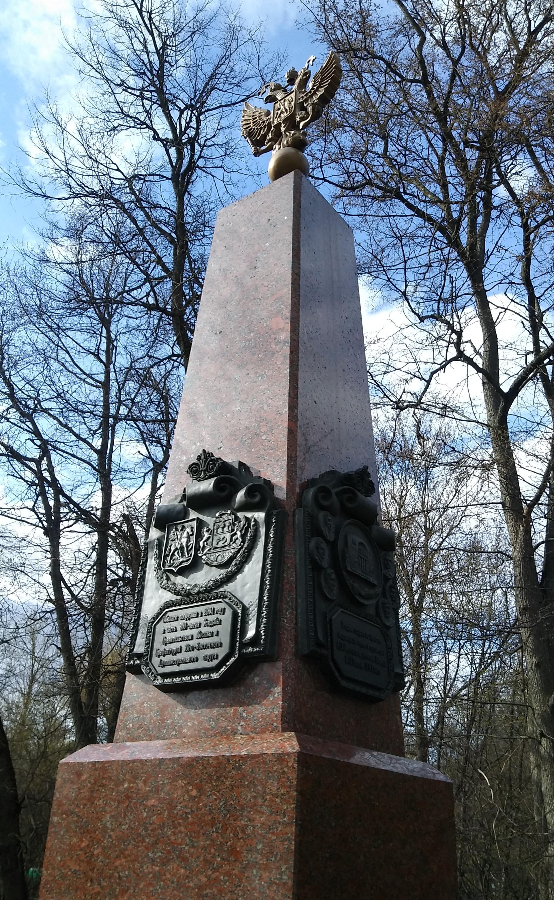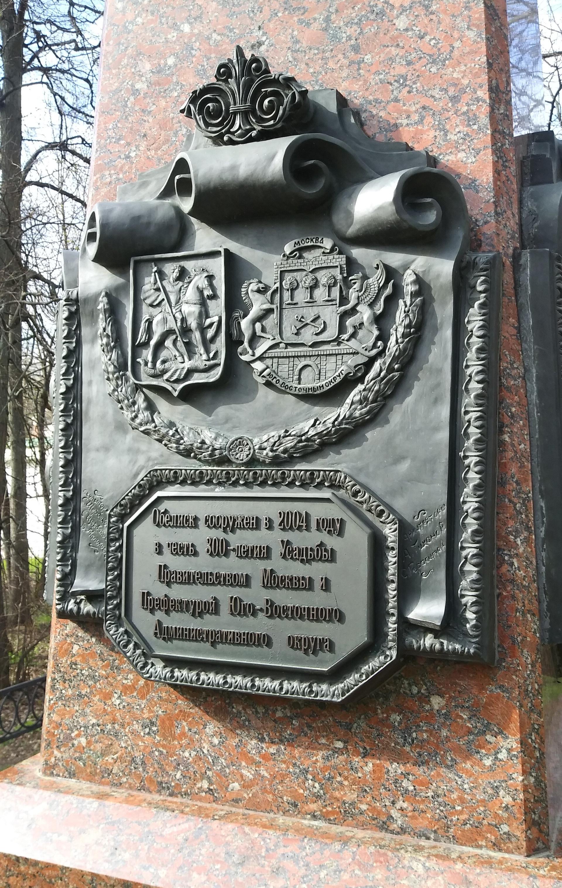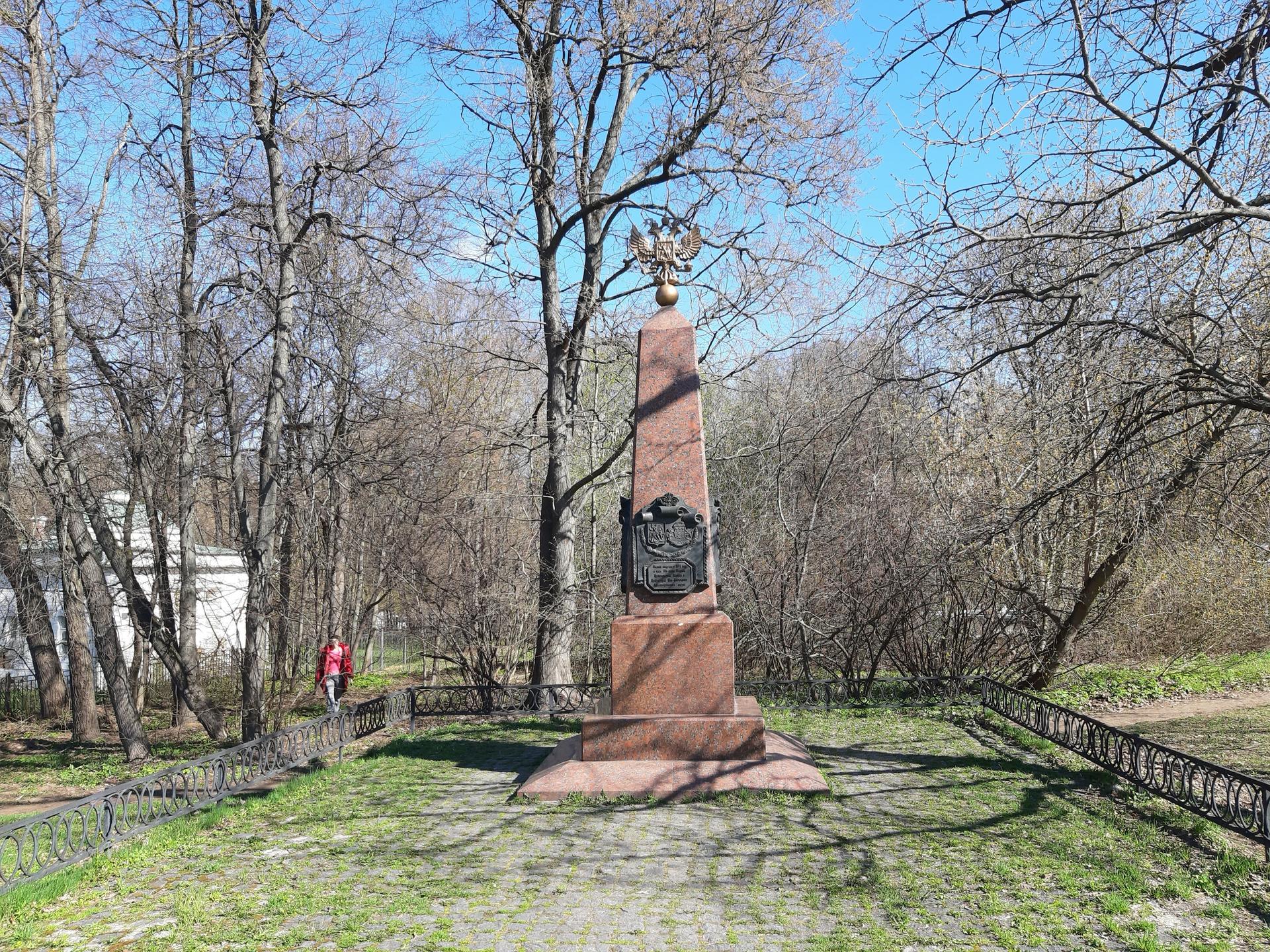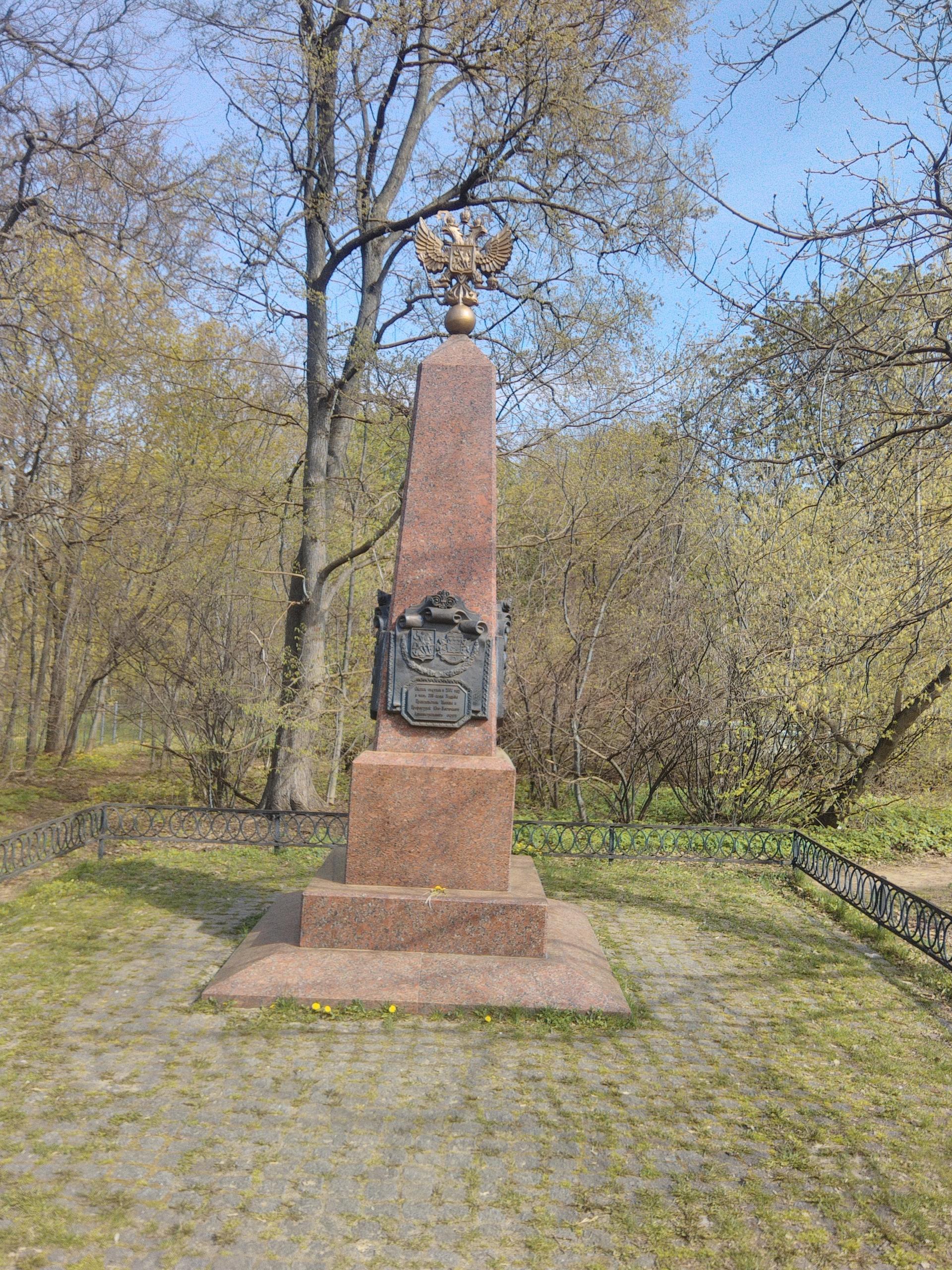 Обелиск установлен в начале Кузьминской улицы (раньше это была главная въездная аллея в усадьбу — Липовая аллея) на месте несохранившегося памятника-обелиска, который был сооружен на месте жилища Петра I и в честь его визитов.