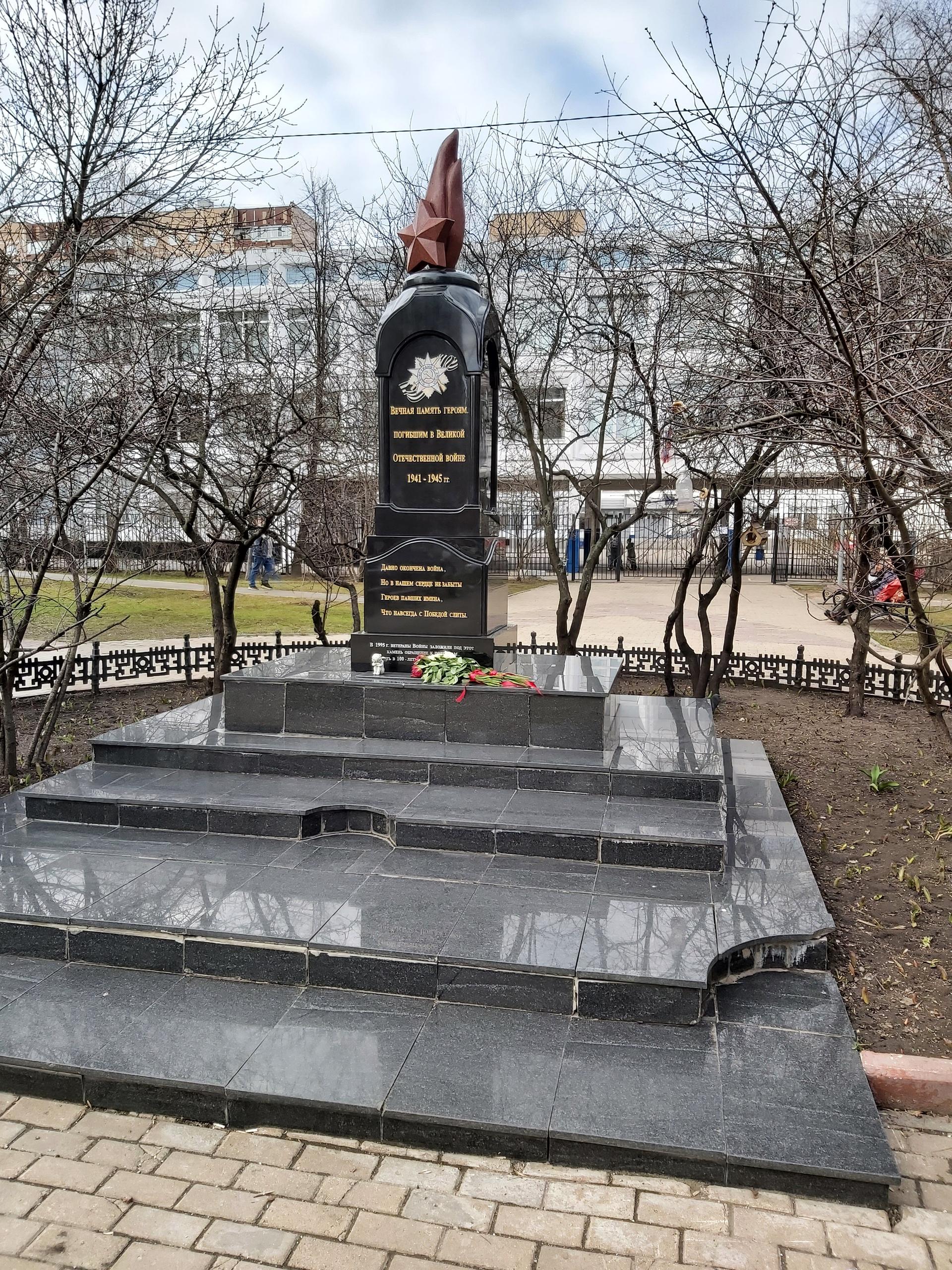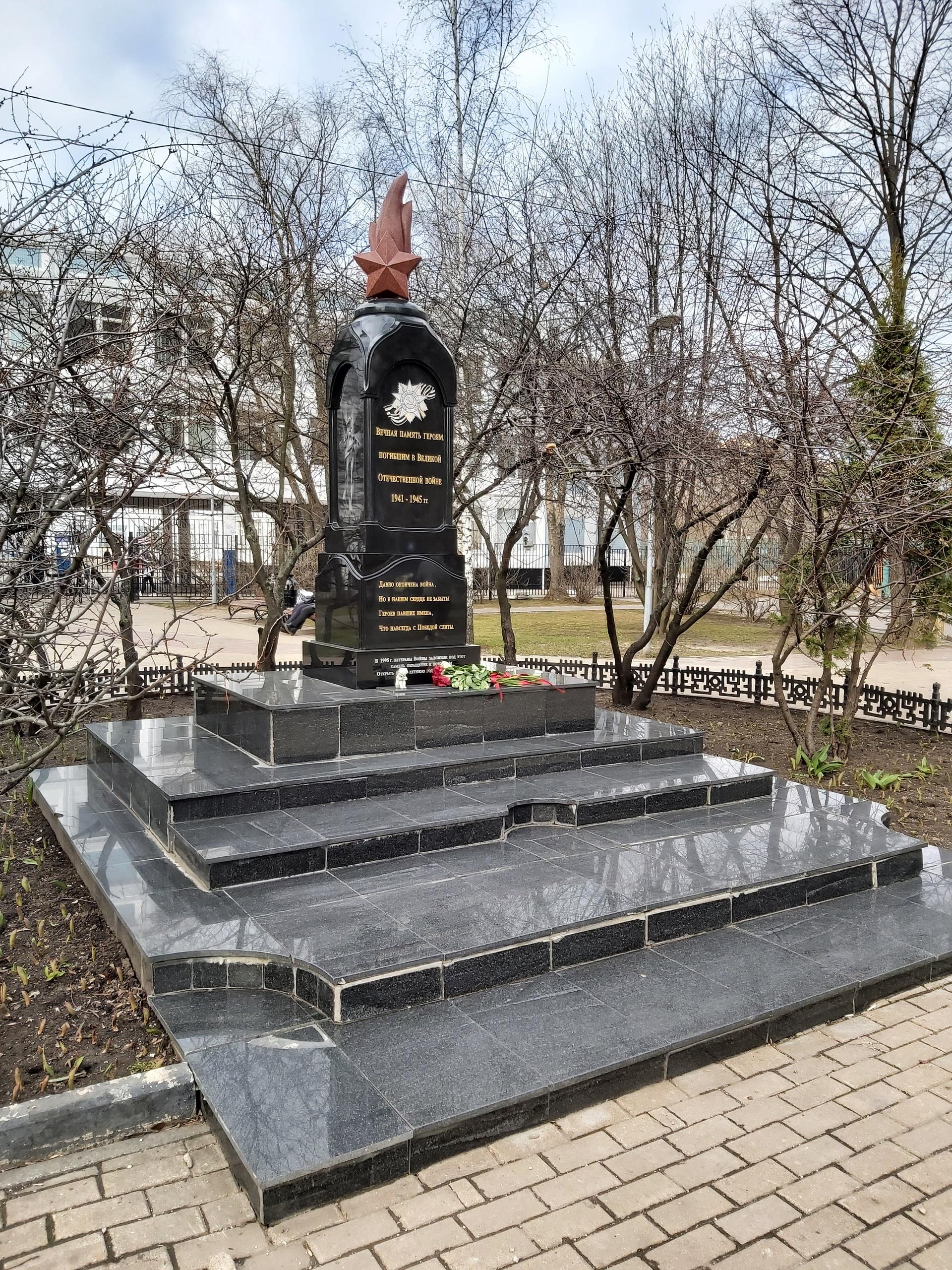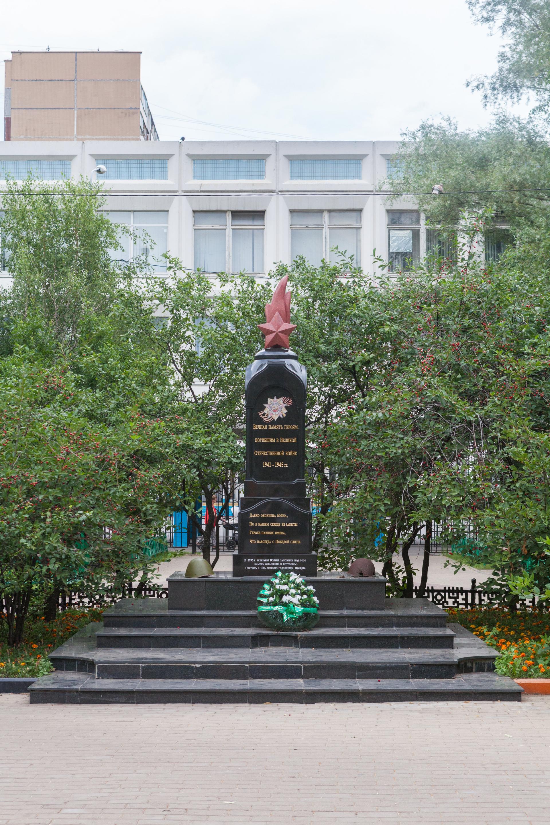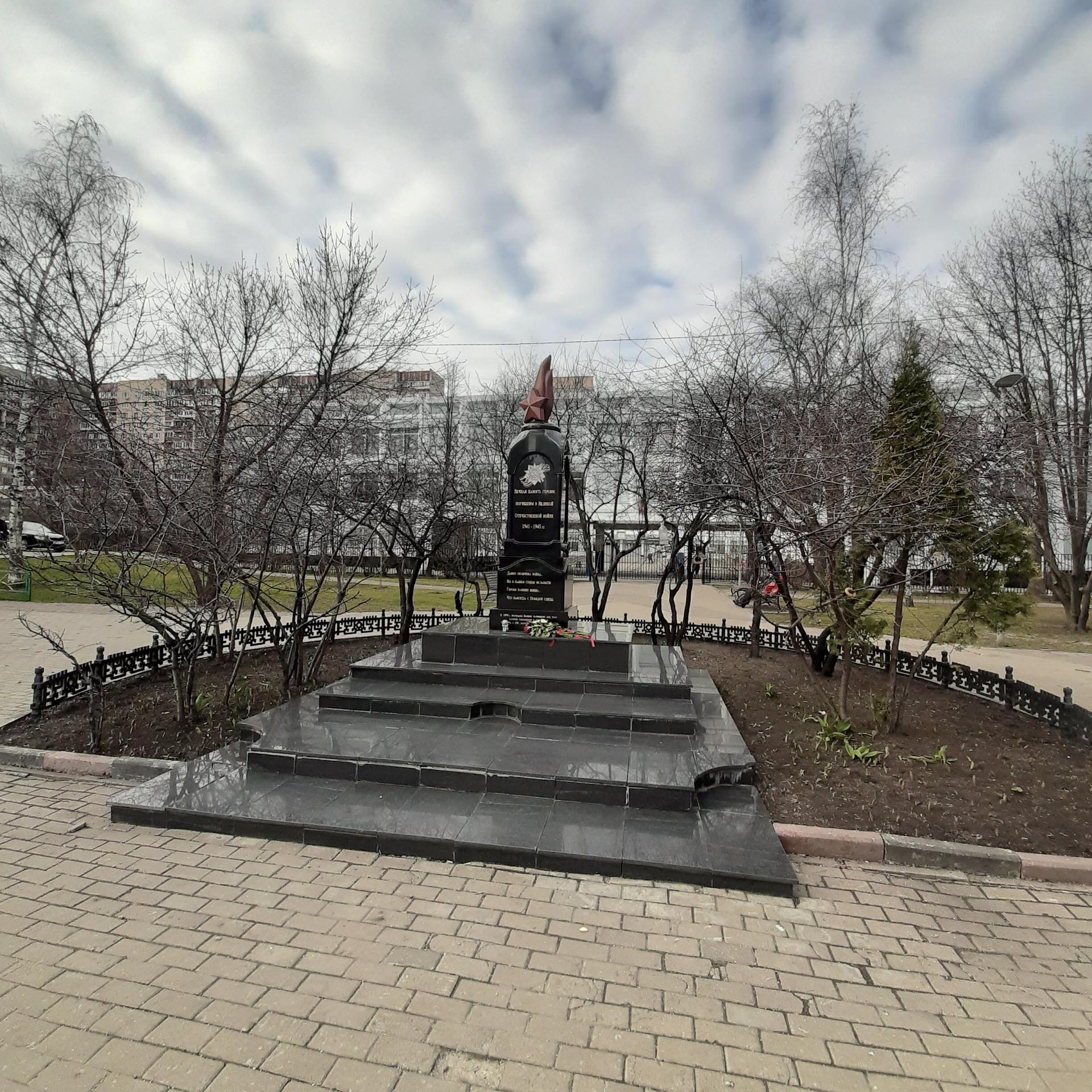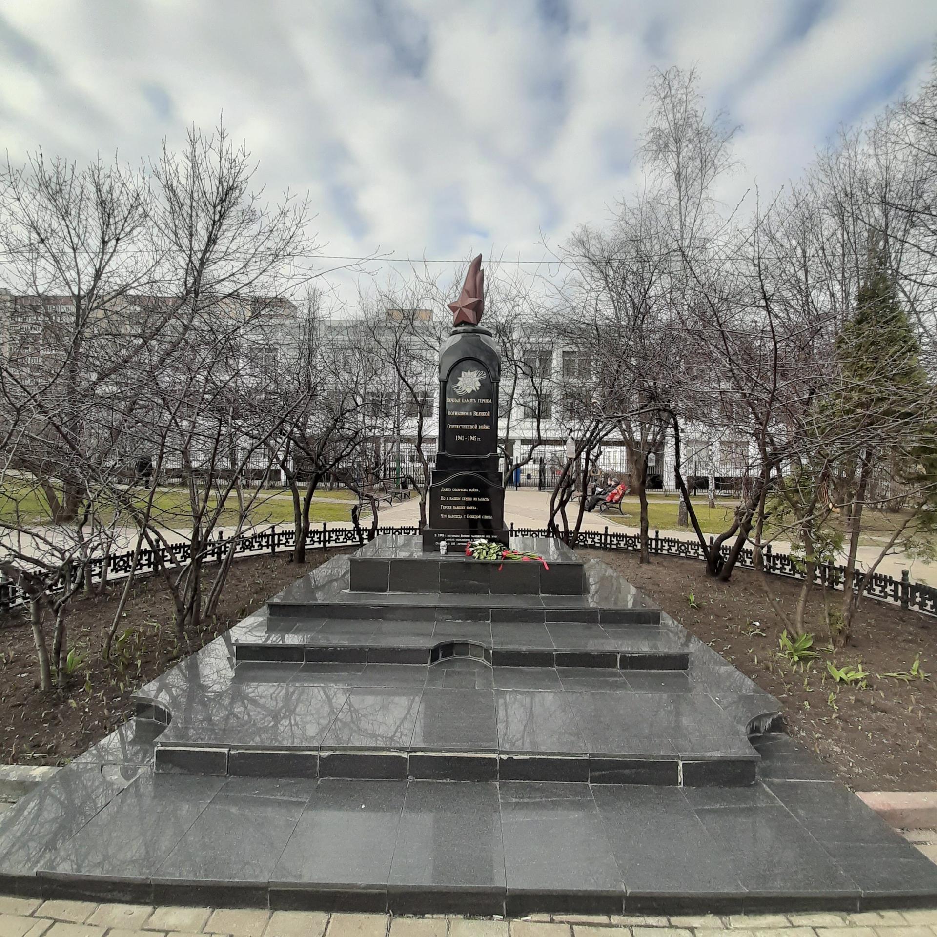 Памятник выполнен из полированного гранита в виде стилизованной часовни, увенчанной пламенем с пятиконечной звездой. В верхней части на лицевой стороне памятника изображен орден Отечественной войны на фоне георгиевской ленты и помещена надпись: «Вечная память героям, погибшим в Великой Отечественной войне 1941-1945 гг.». В 1995 г. ветераны заложили здесь обращение к потомкам, которое будет открыто в 100-летнюю годовщину Победы.