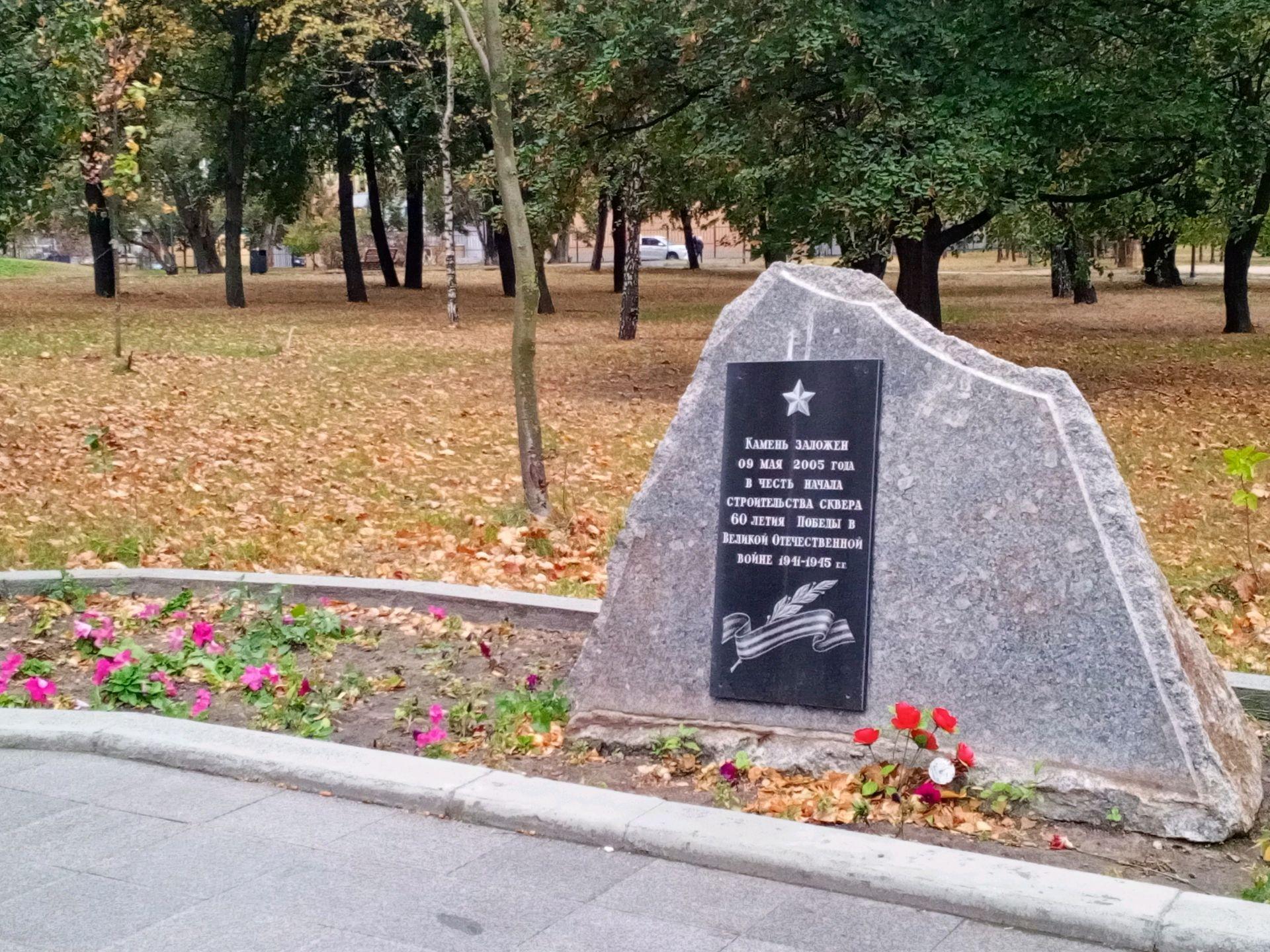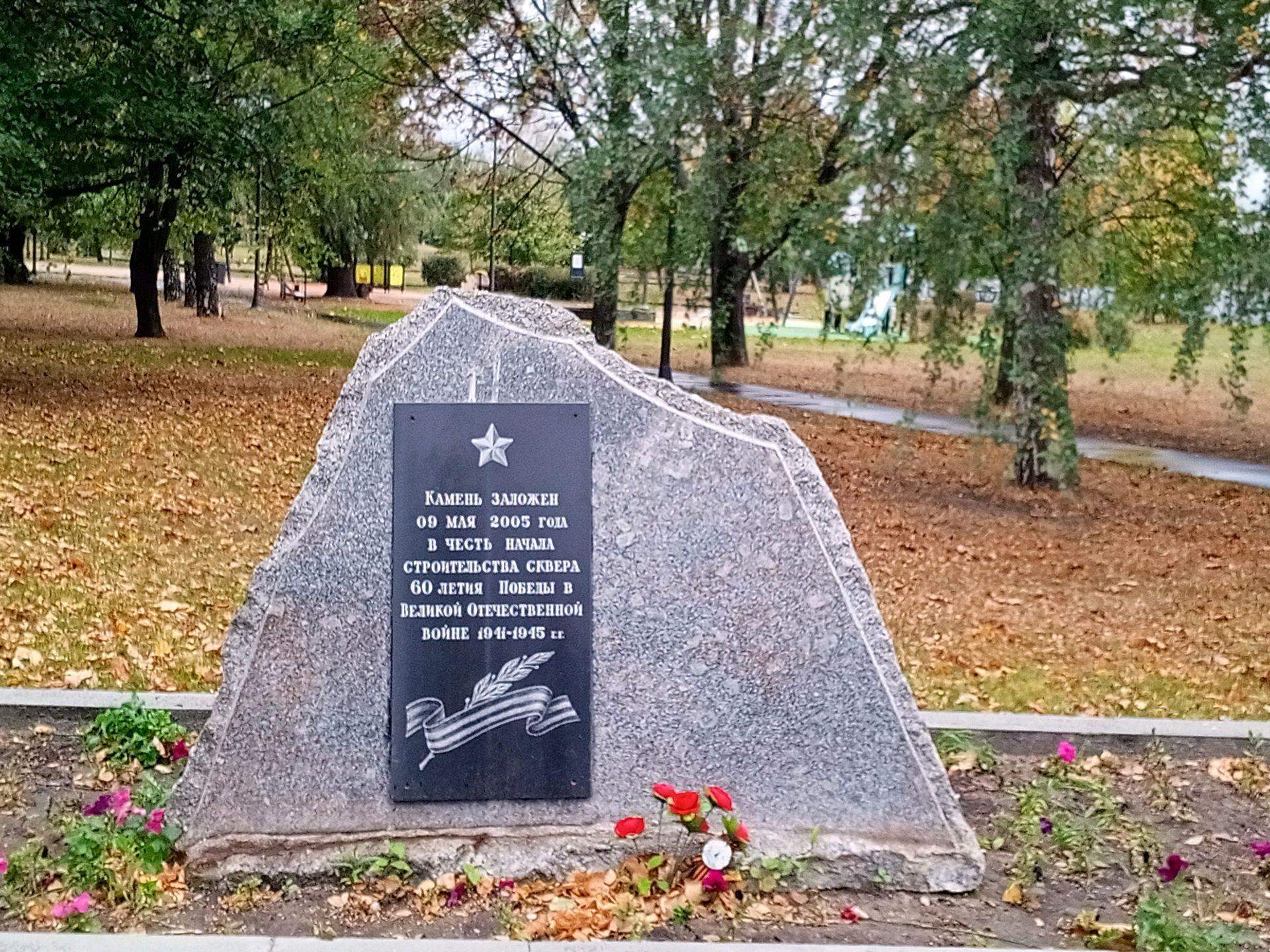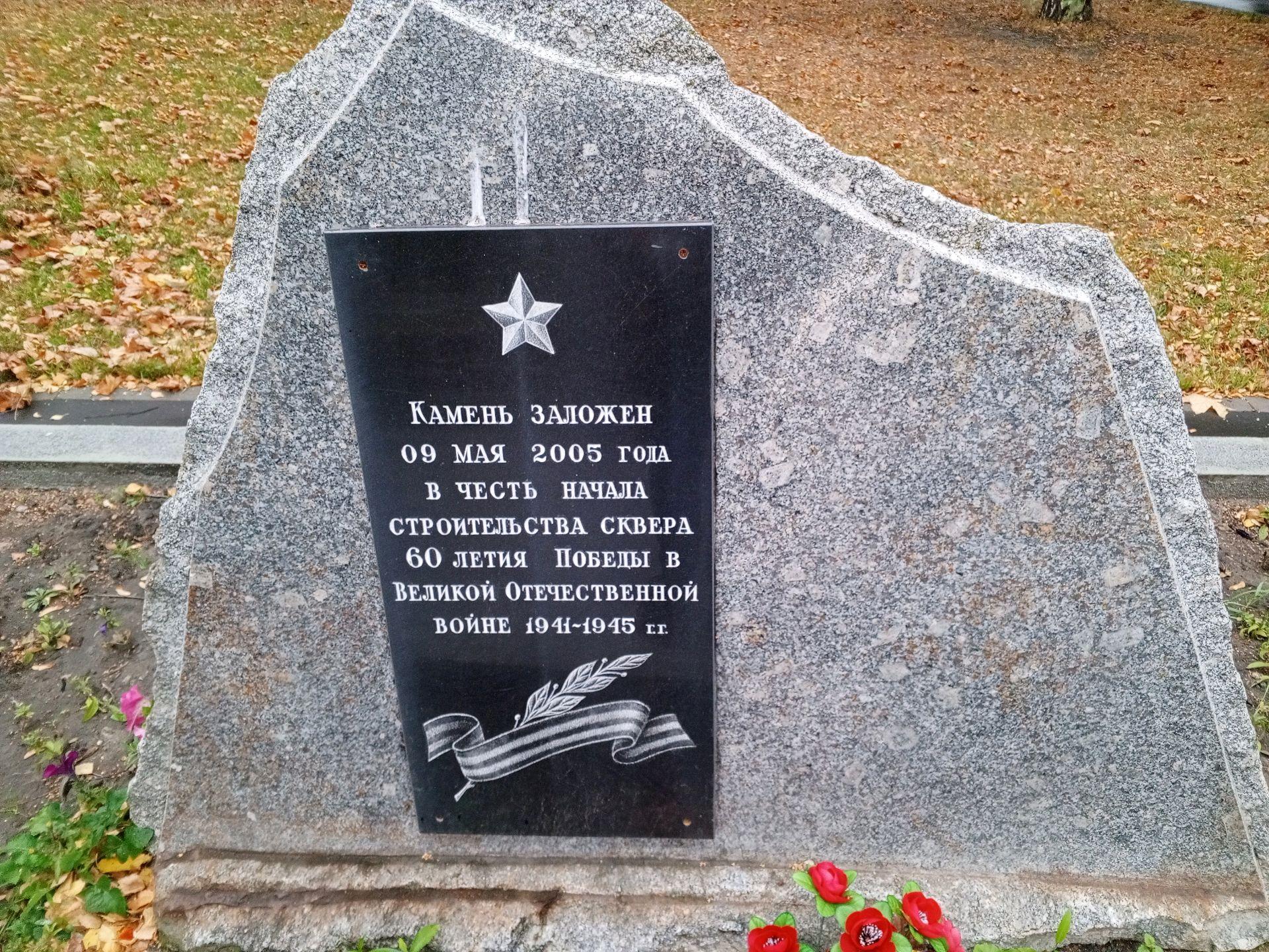 Памятник представляет собой закладной гранитный камень. На северном фасаде присутствует табличка из гранита с прорезной посвятительной надписью: «Камень заложен 9 мая 2005 г. в честь начала строительства сквера 60-летия Победы в Великой Отечественной войне 1941-1945 гг.».
