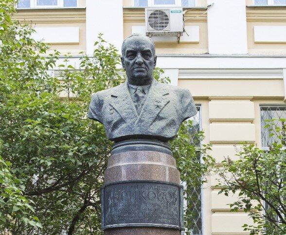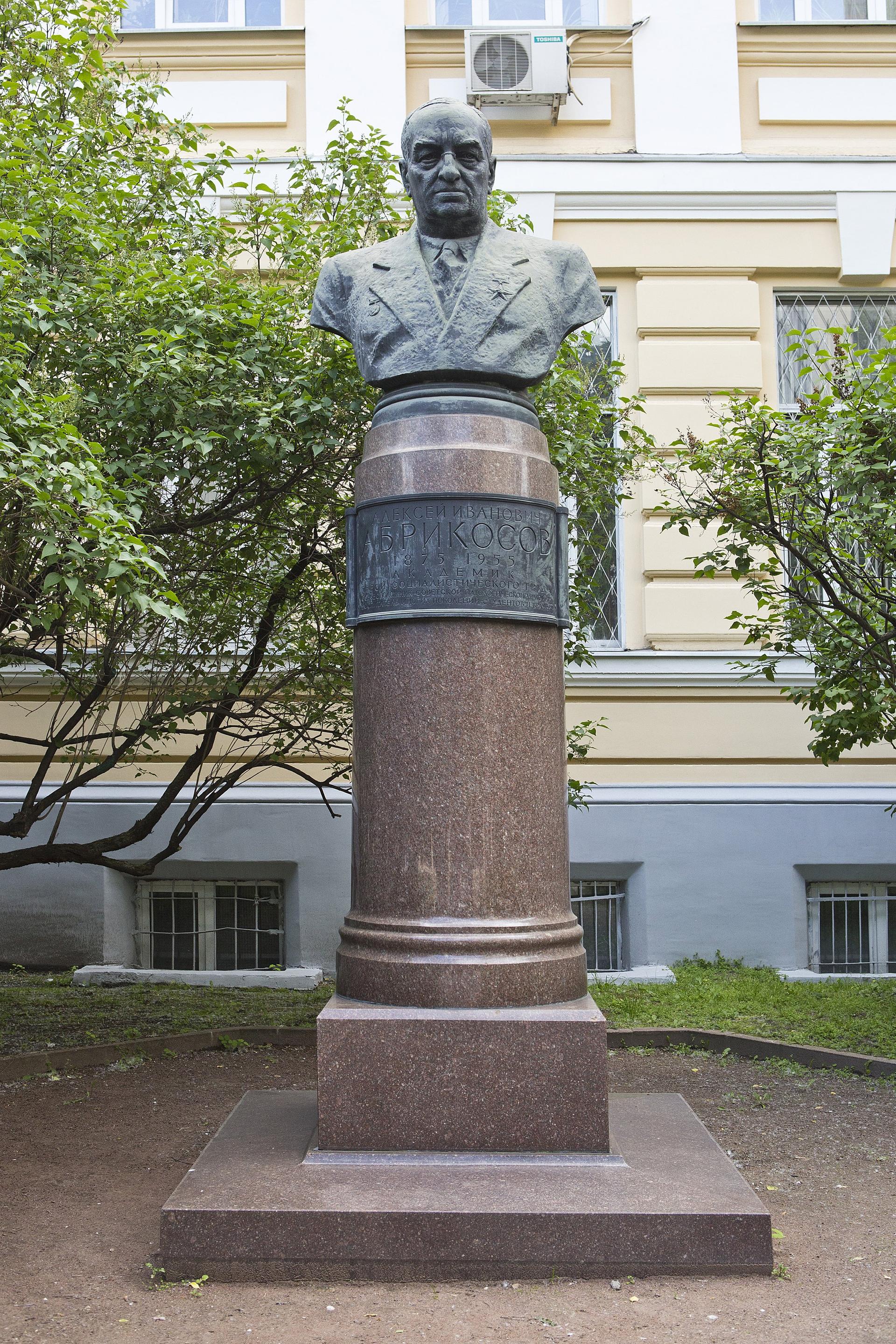 Изображение профессора погрудное, с медалью Героя Социалистического Труда на груди. На постаменте закреплена бронзовая доска с надписью: «Алексей Иванович Абрикосов. 1875—1955. Академик, Герой Социалистического Труда, основатель советской патологической анатомии, воспитатель многих поколений студентов и врачей».