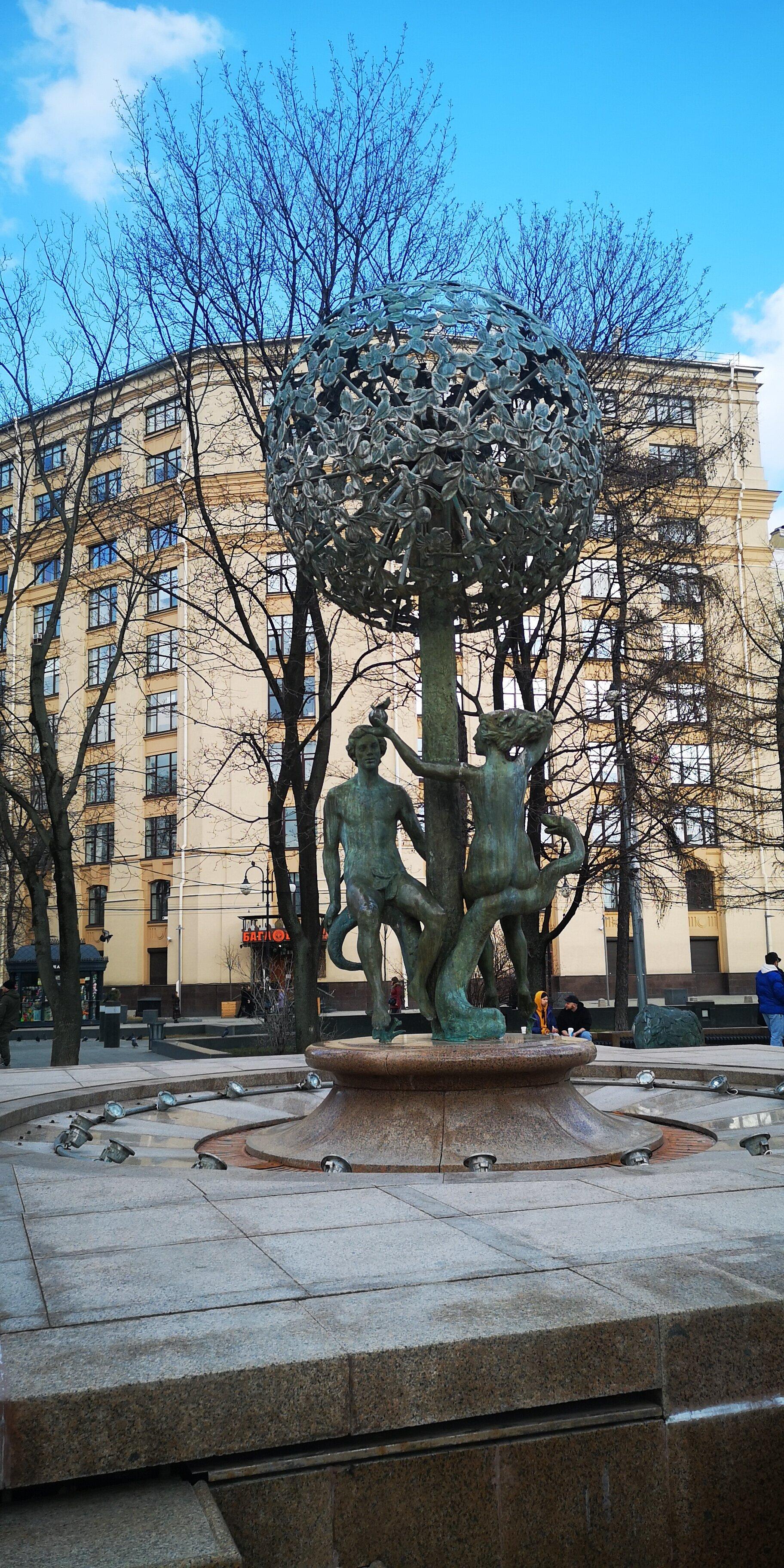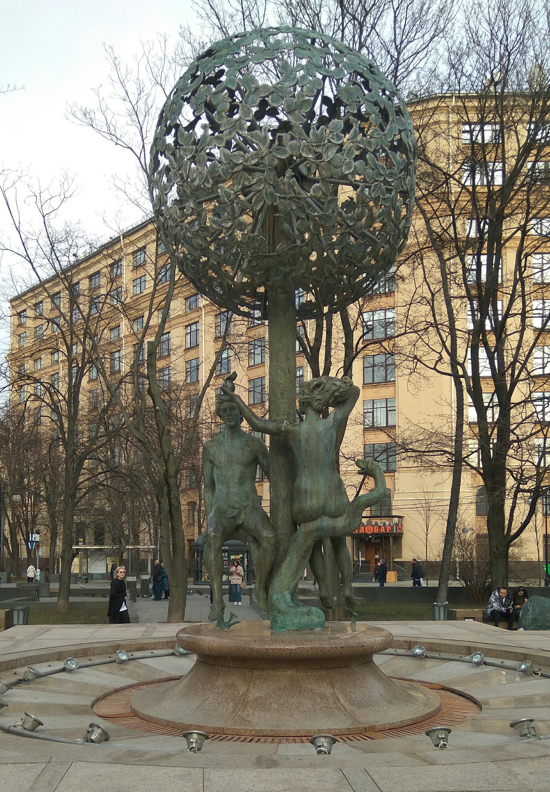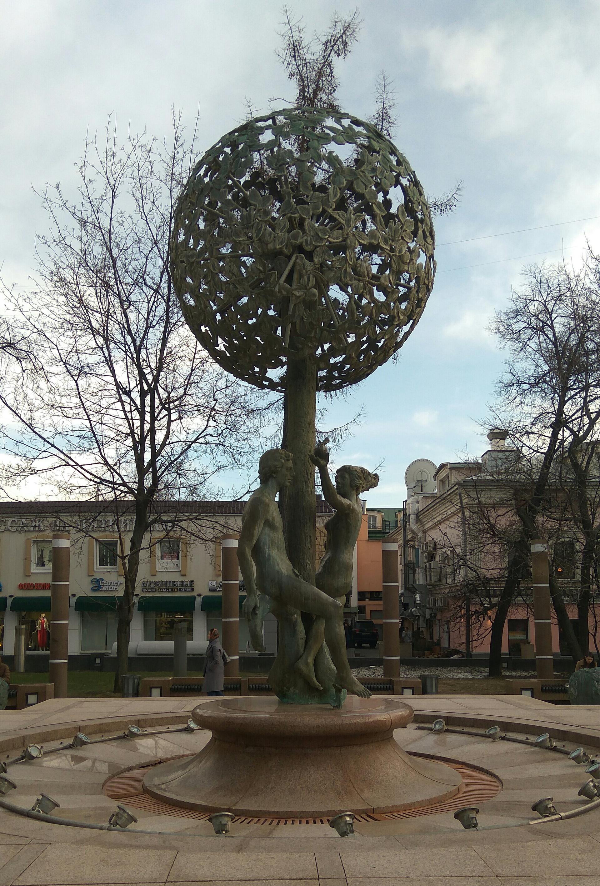 Фонтан начал работать в 2008 году, представляет собой скульптурную композицию, в центре которой расположены фигуры Адама и Евы под райским деревом, которое обвивает змей-искуситель. В ажурной бронзовой кроне дерева сусальным золотом блестят яблоки, хохолки птичек и крылья насекомых. Согласно библейскому сюжету - в руке Евы яблоко искушения.