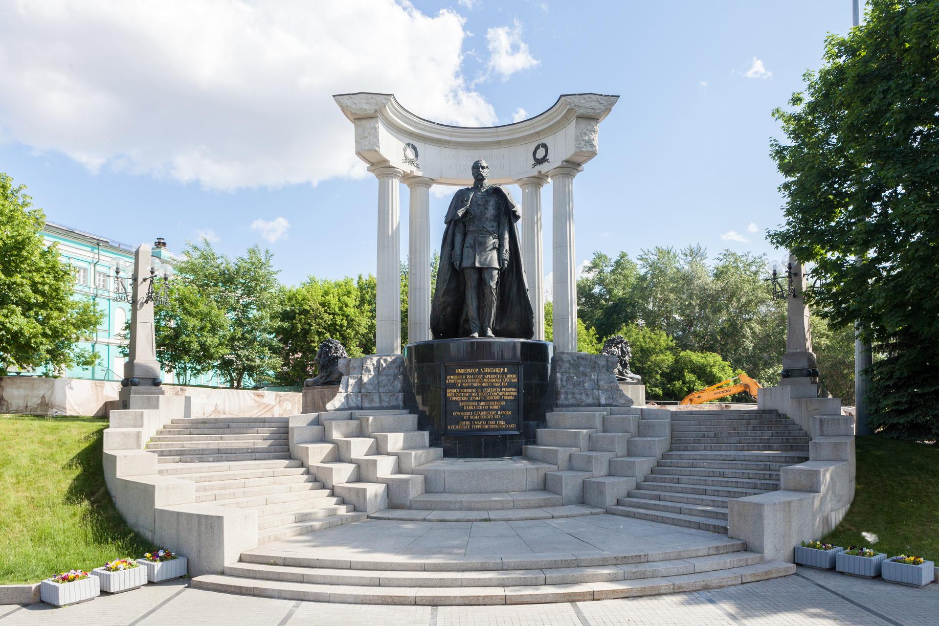 Александр II изображен в полный рост в военной форме и с царской мантией. Бронзовая фигура императора установлена на гранитном постаменте, который огибают два ступенчатых каскада и три лестницы, расположенные полукругом. За фигурой императора расположены четыре колонны с архитравом и карнизом. На гранитном архитраве два бронзовых венка и надпись, выполненная прорезными буквами: «Царю-освободителю Александру II». С двух сторон от памятника установлены два лежащих на постаментах льва.