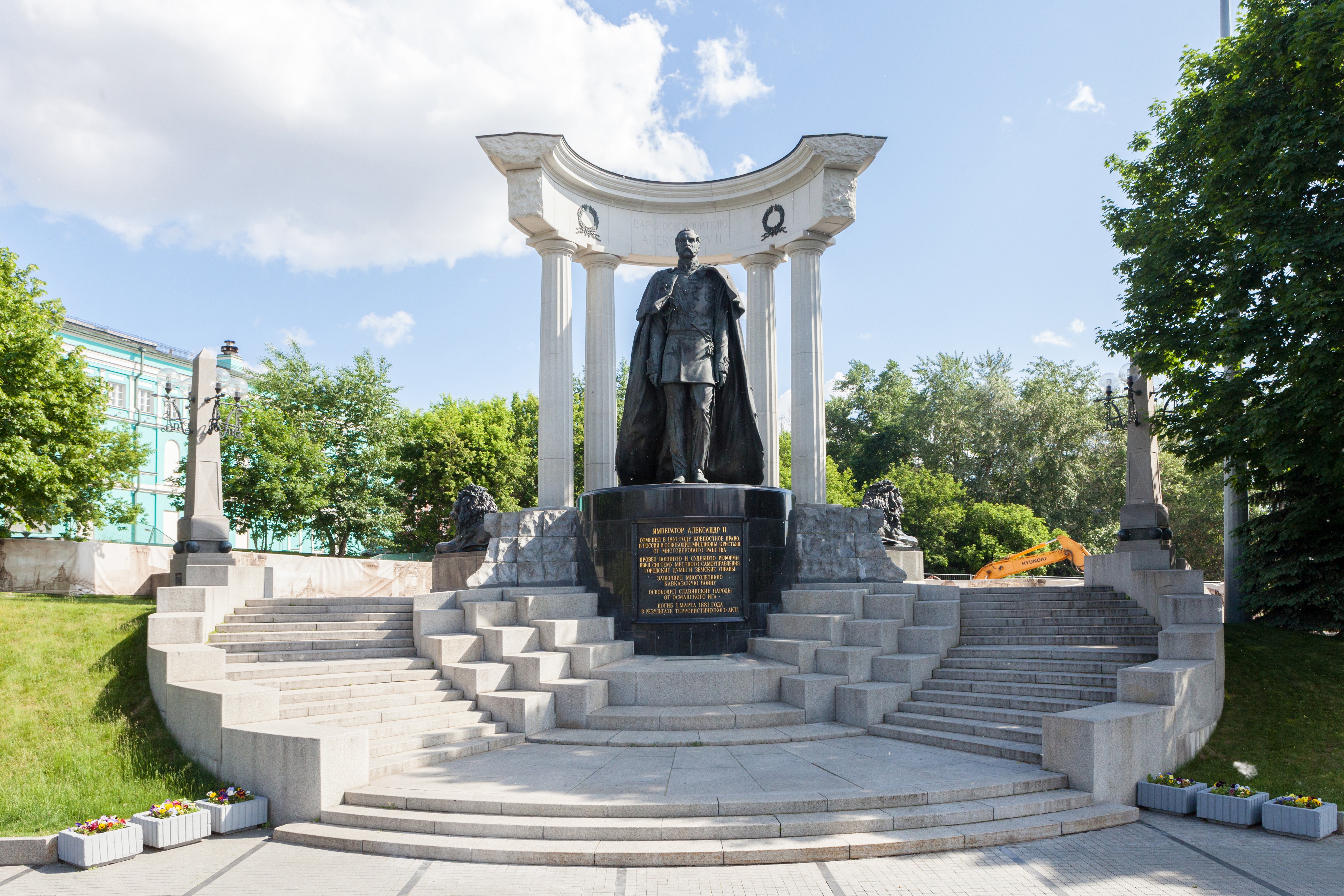 На постаменте закреплена мемориальная табличка с цельнолитой посвятительной надписью: «Император Александр II отменил в 1861 г. крепостное право в России и освободил миллионы крестьян от многовекового рабства, провел военную и судебную реформы, ввел систему местного самоуправления, городские думы и земские управы, завершил многолетнюю Кавказскую войну, освободил славянские народы от османского ига, погиб 1 марта 1881 г. в результате террористического акта».