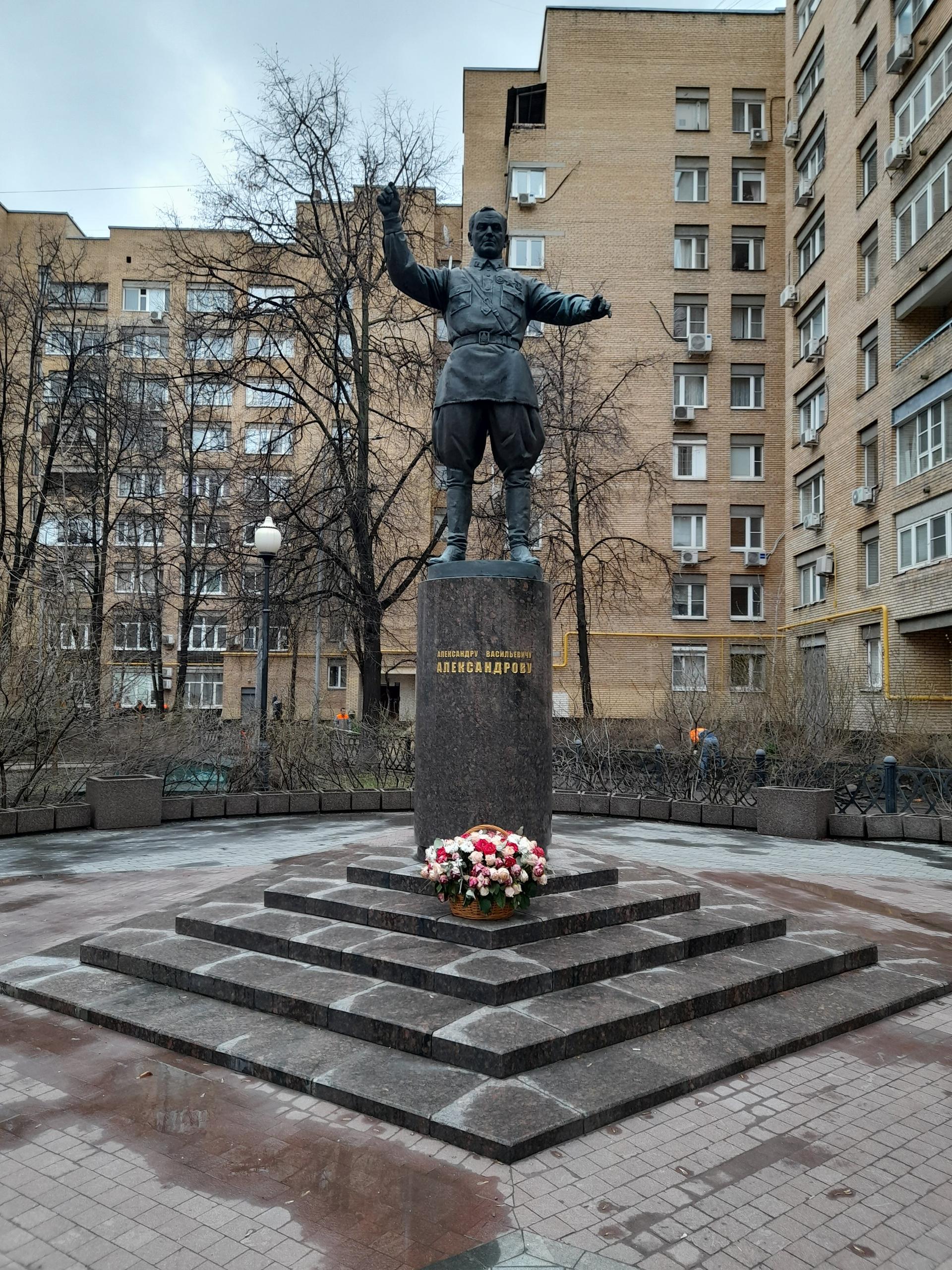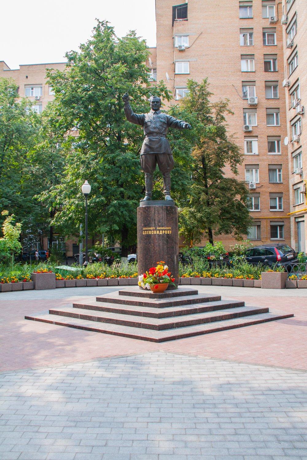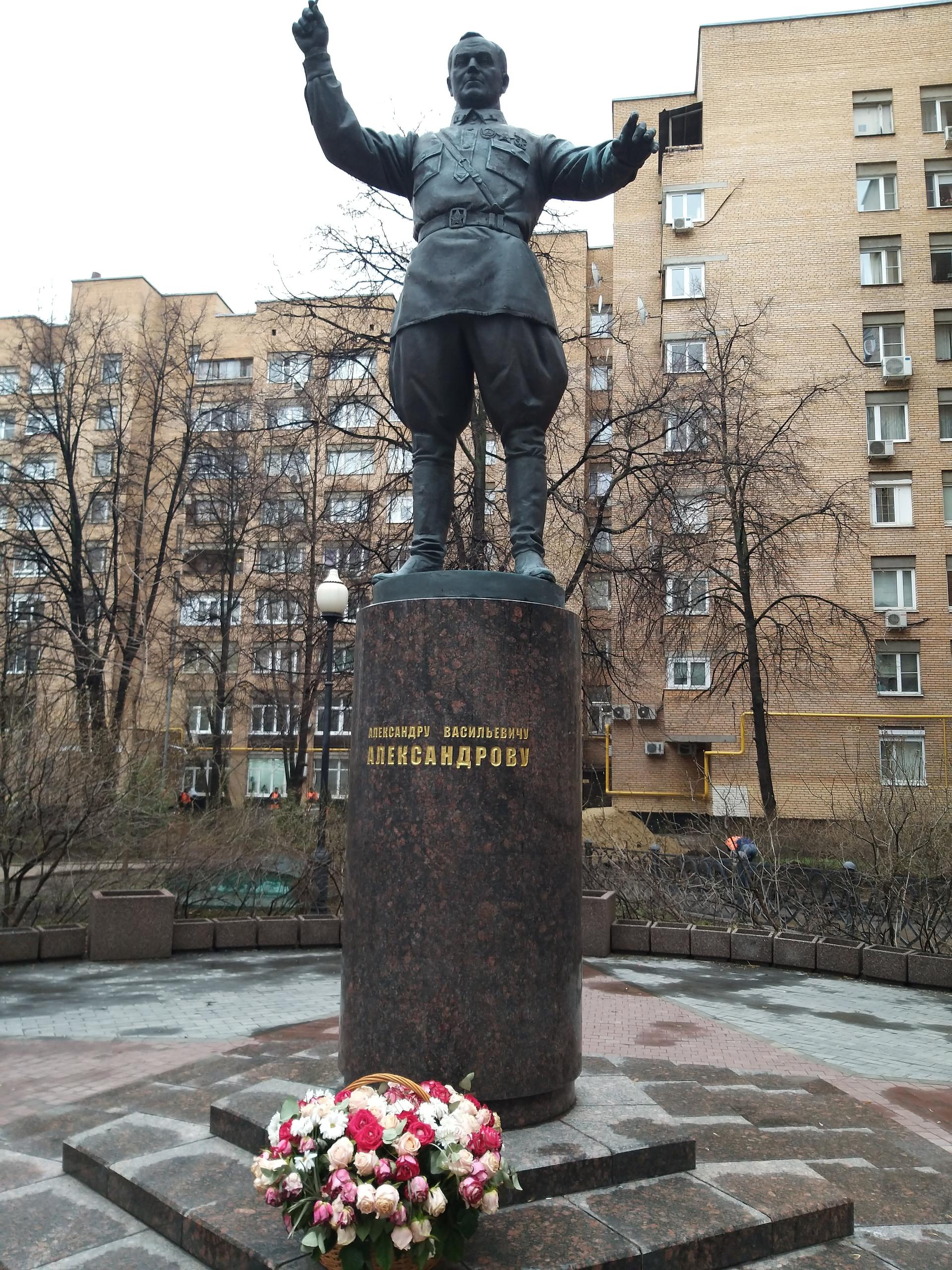 Александров изображен в строгой военной форме с дирижерской палочкой в правой руке.
