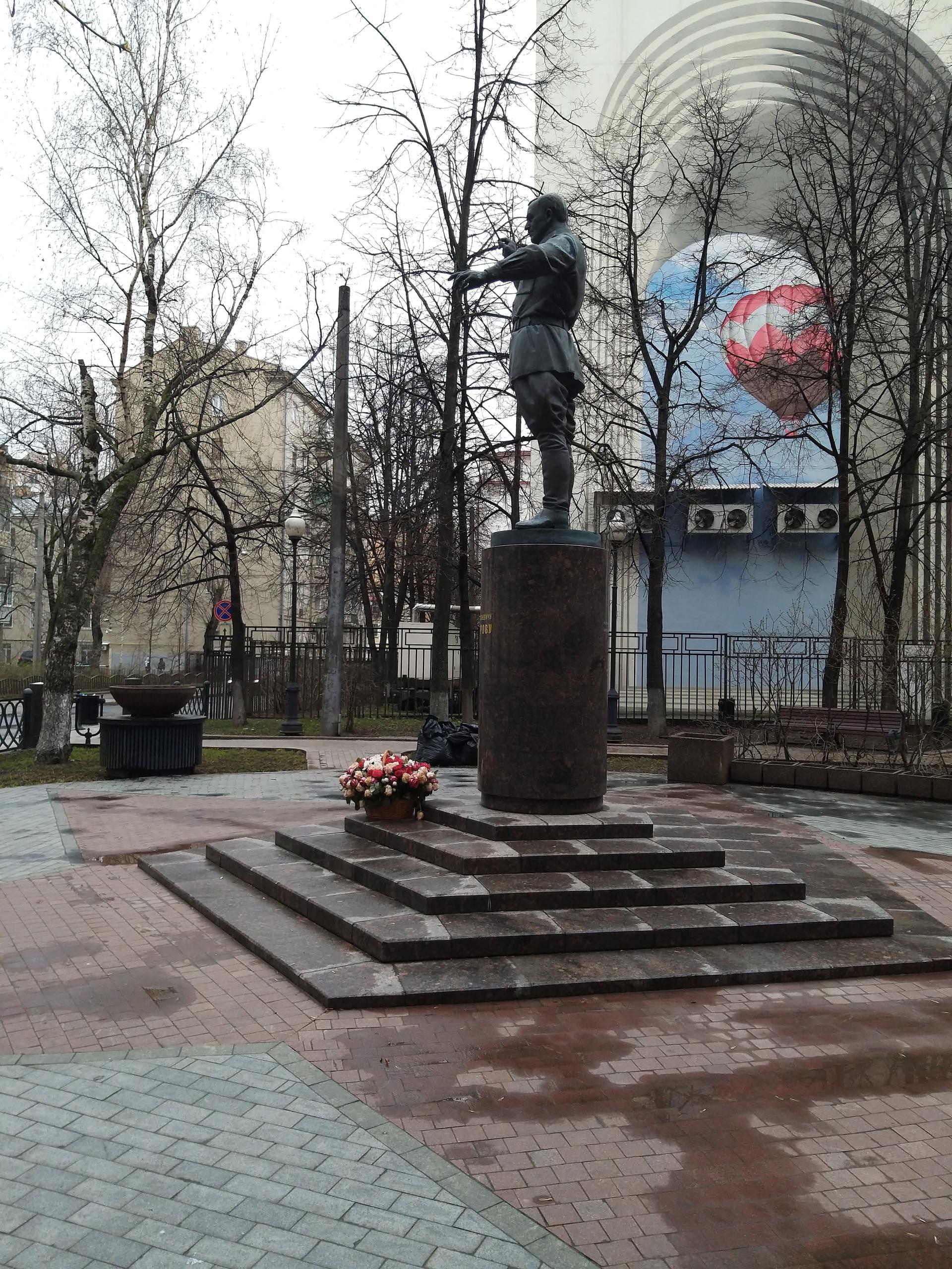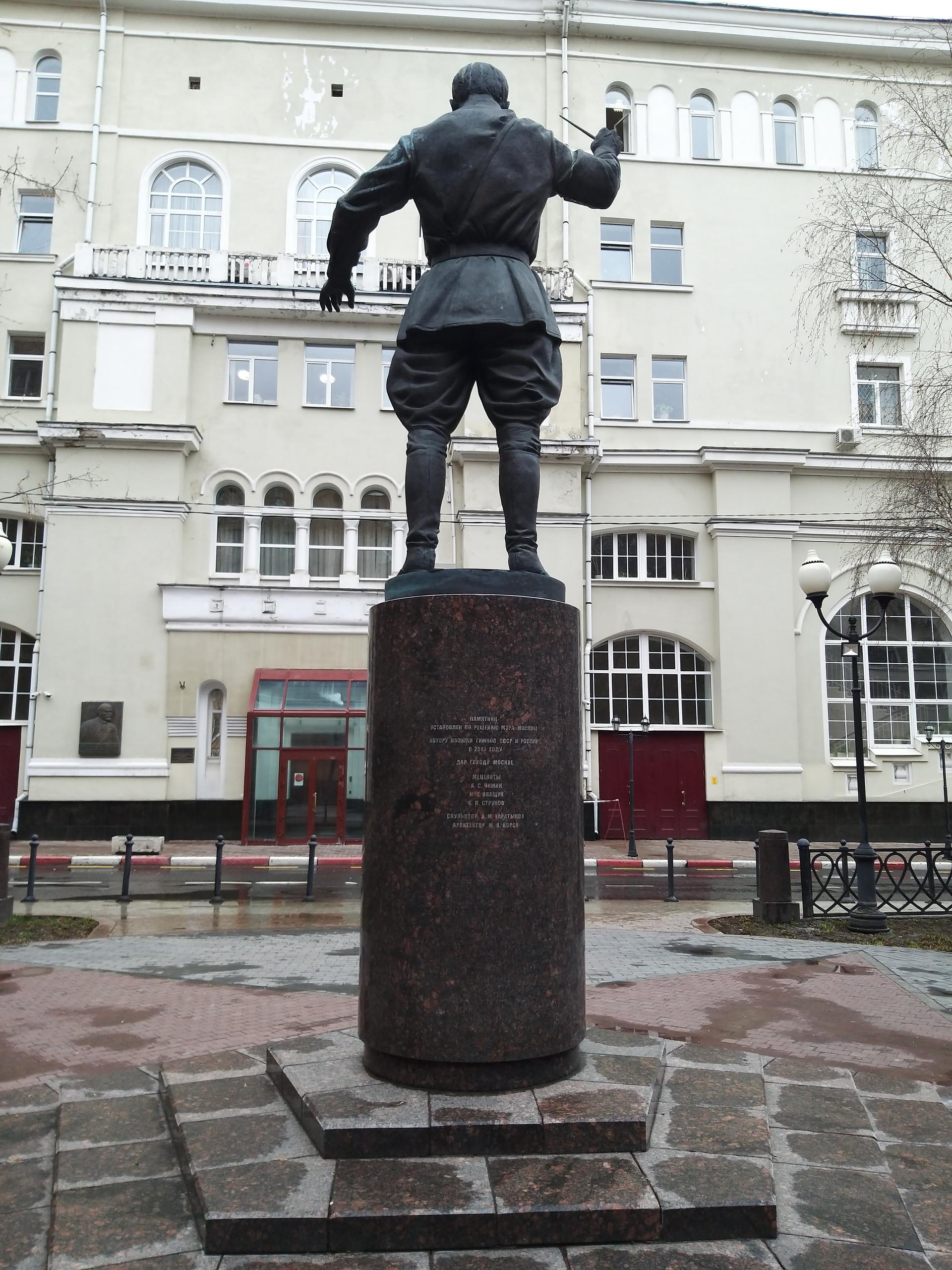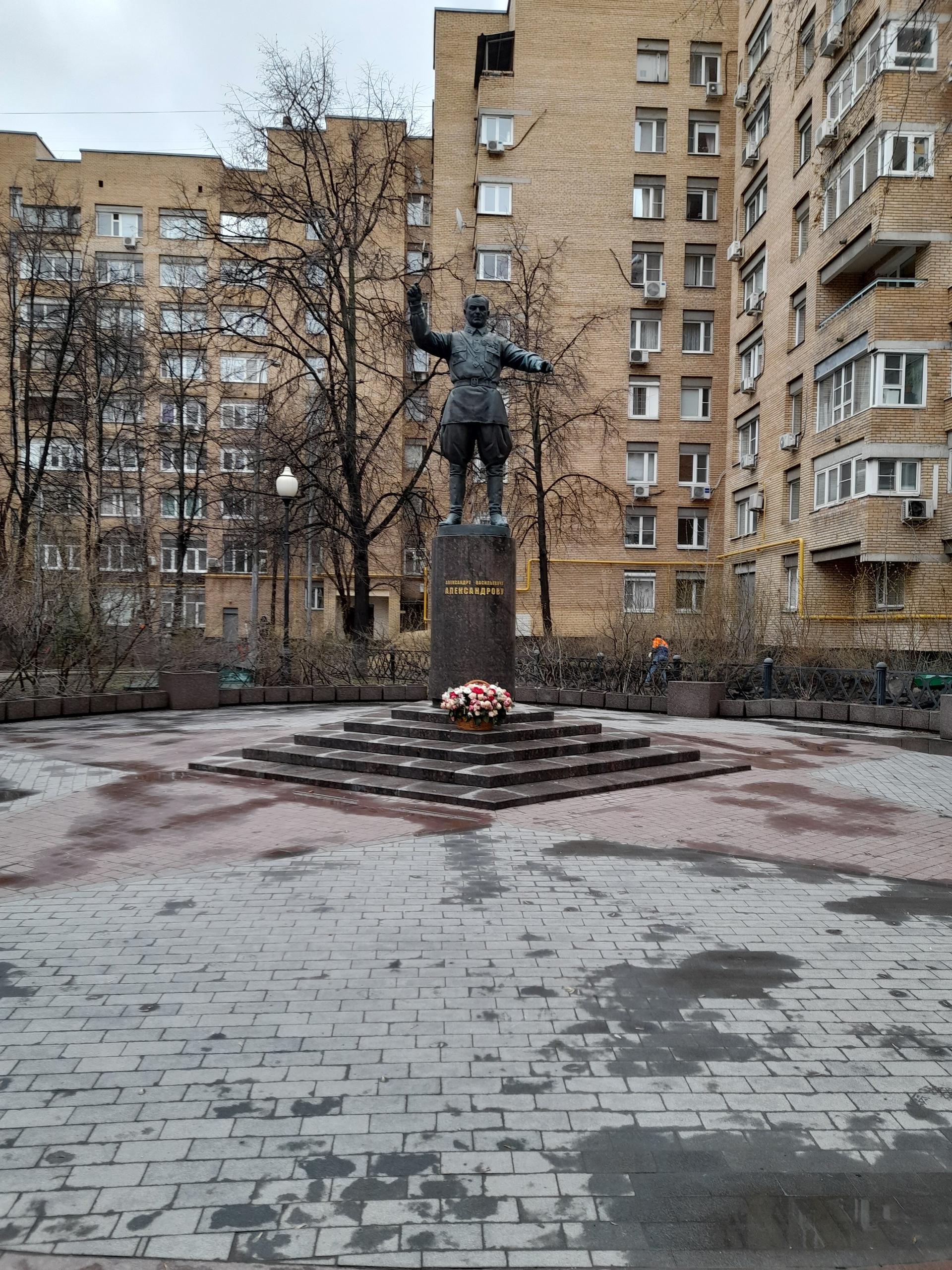 Александров изображен в строгой военной форме с дирижерской палочкой в правой руке.