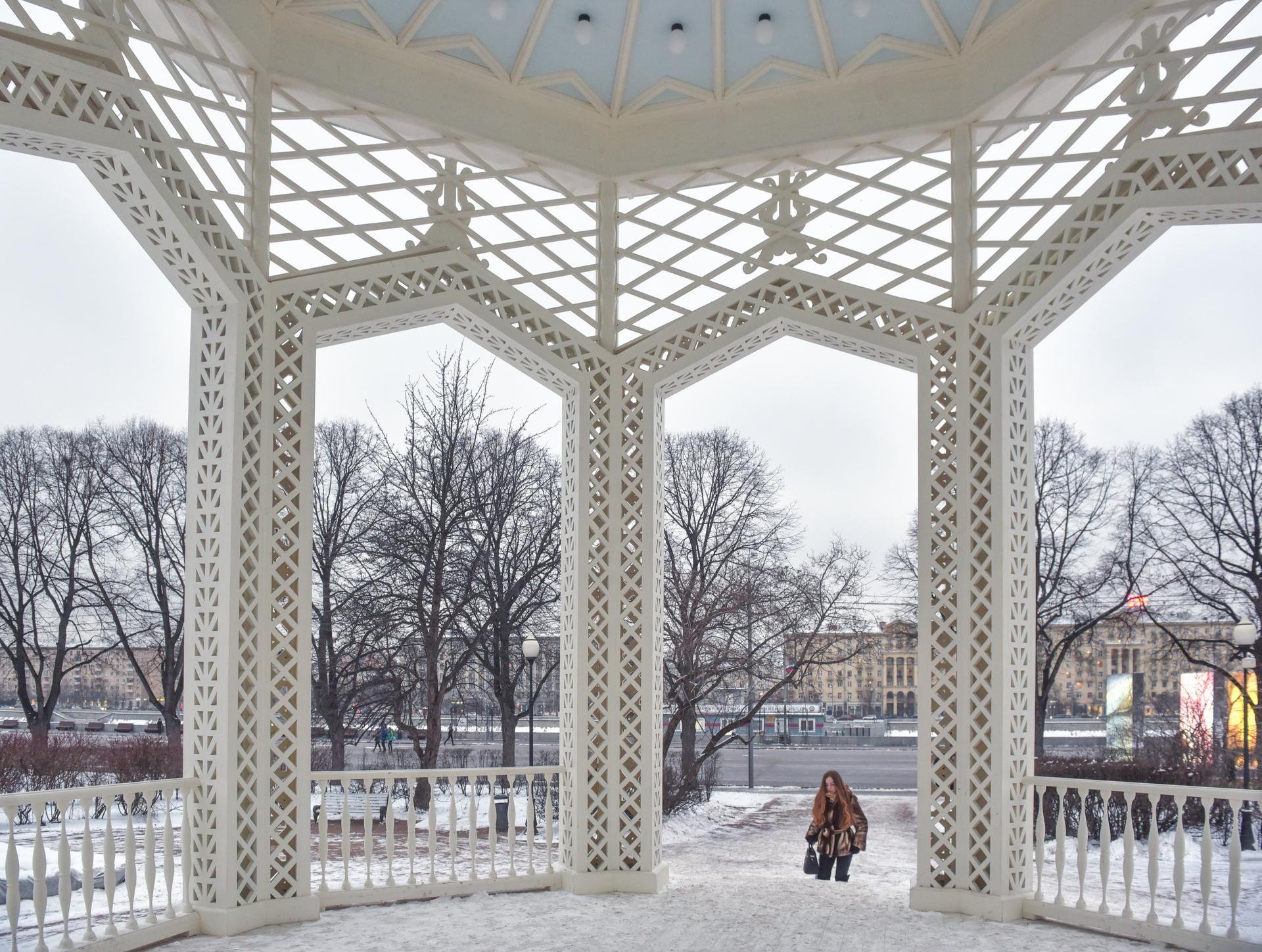 Белоснежная Ажурная или, как ее еще называют музыкальная, беседка находится недалеко от Главного входа, со стороны Пушкинской набережной. Каркас у беседки металлический, снаружи она деревянная.