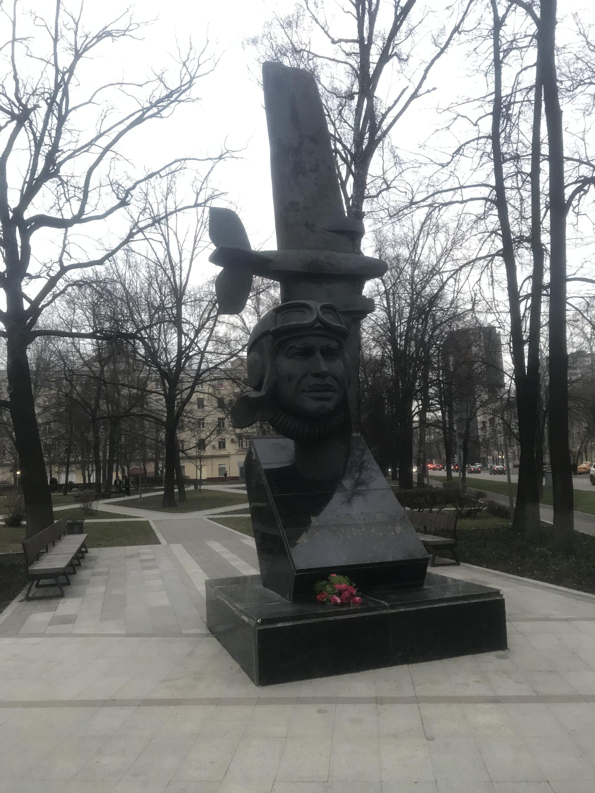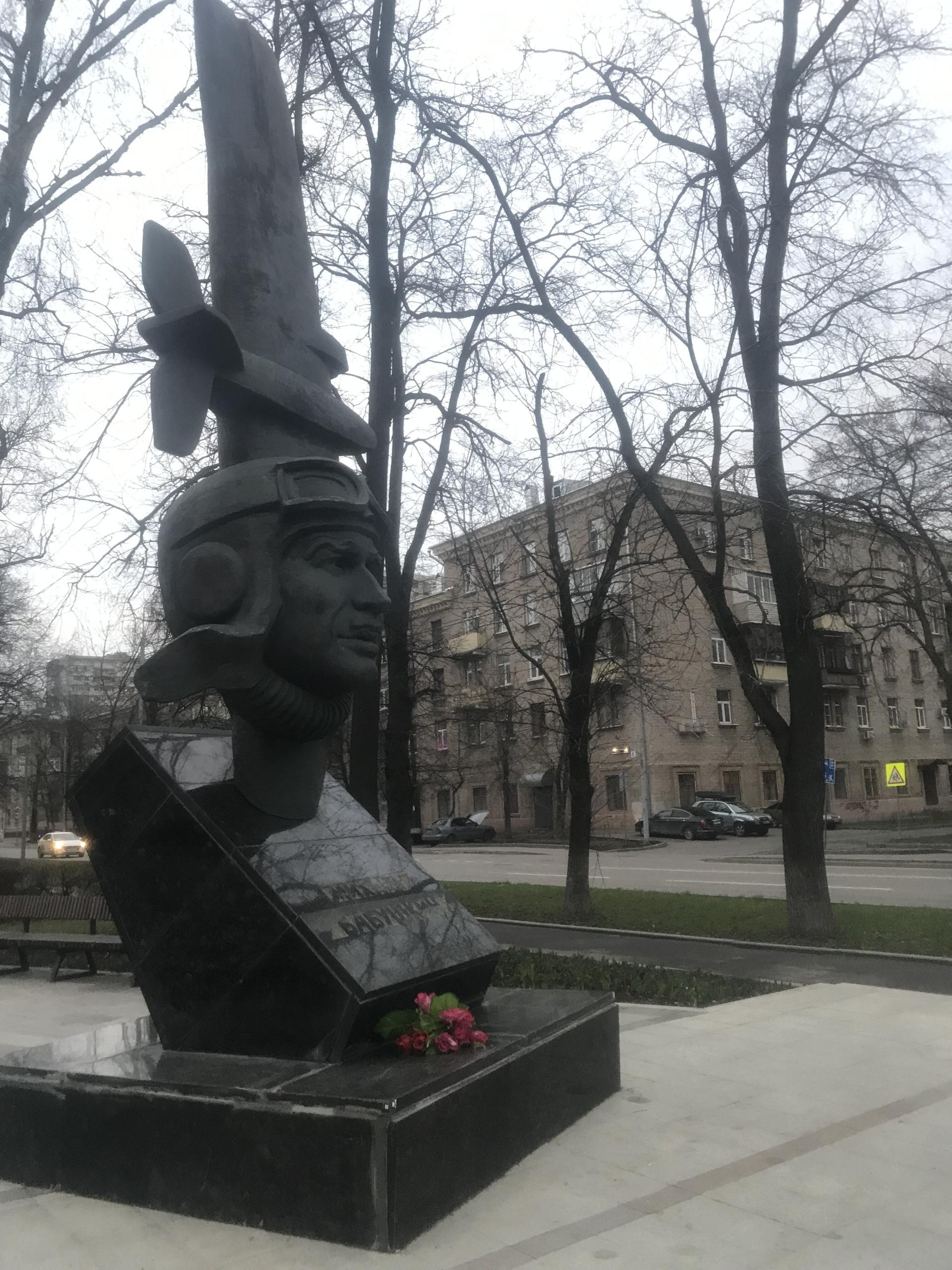 Михаил Сергеевич Бабушкин (1893—1938) — советский полярный летчик. Памятник представляет собой бронзовую скульптурную композицию на постаменте. Состоит из стилизованного самолета, расположенного вертикально, и примыкающей к нему в нижней части головы летчика в летном шлеме. Скульптура помещена на гранитный полированный постамент. На лицевой части накладными буквами выполнена надпись: «Михаил Бабушкин».