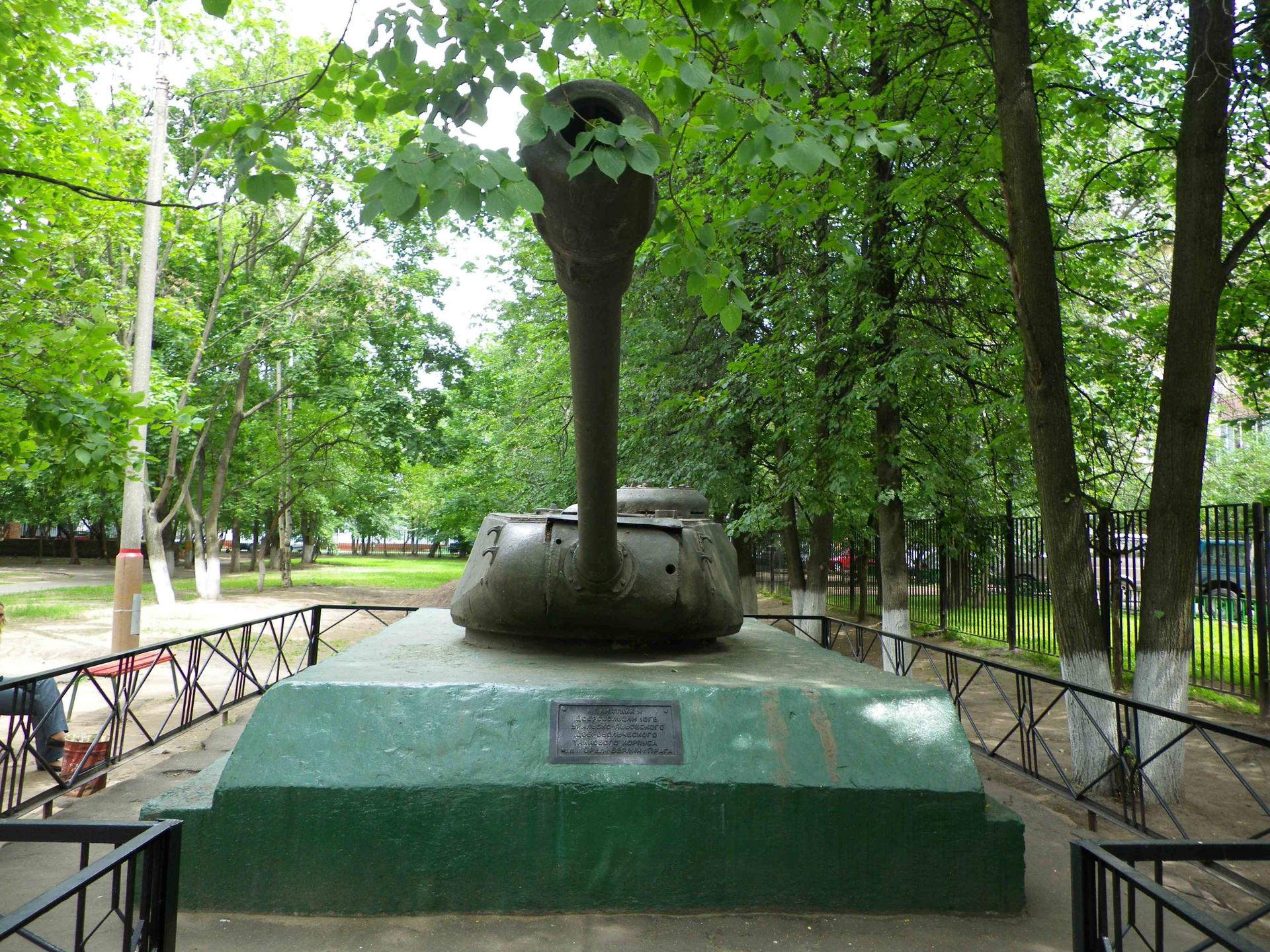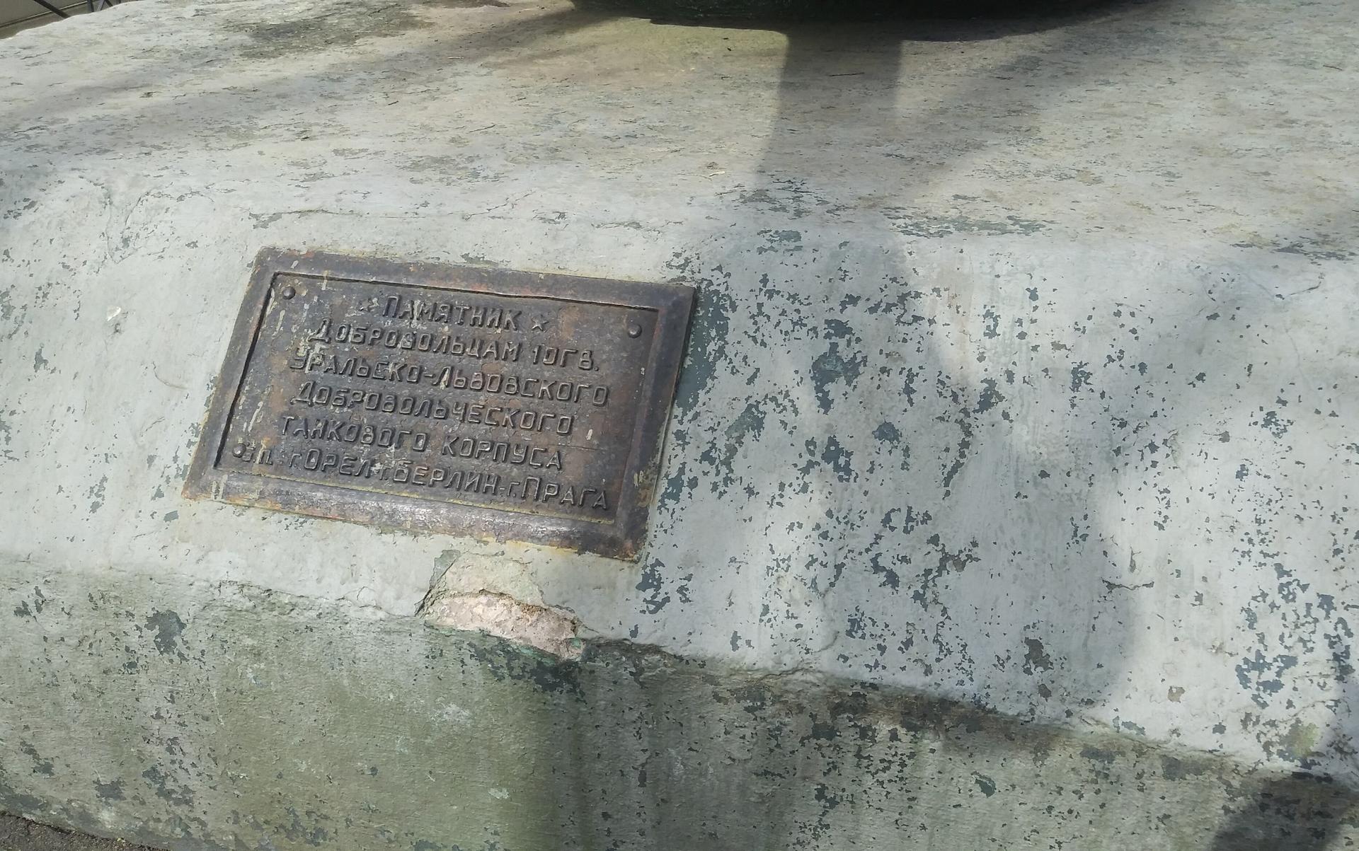 Памятный знак — башня танка в честь добровольцев — танкистов 10-го гвардейского Уральско-Львовского добровольческого танкового корпуса.
