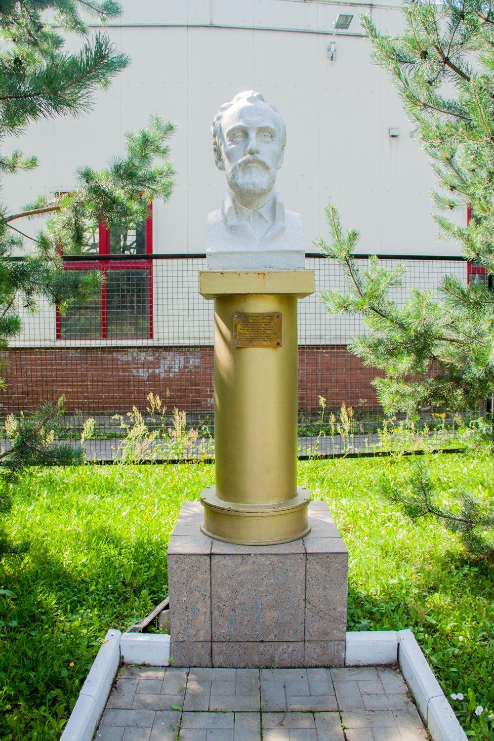 Бюст Н. Э. Баумана из белого мрамора установлен на металлическом поста-менте цилиндрической формы.