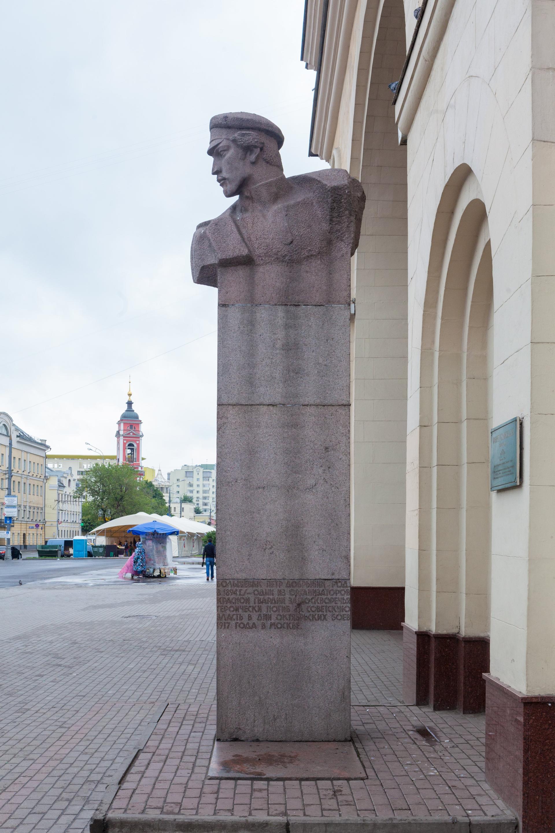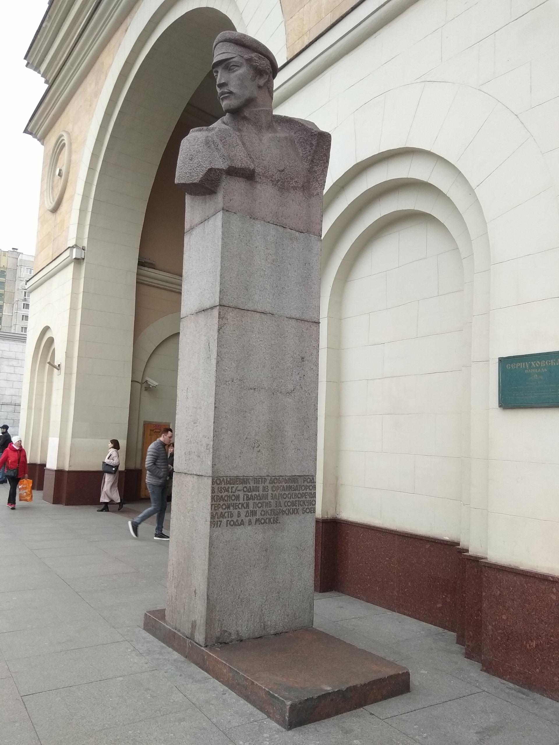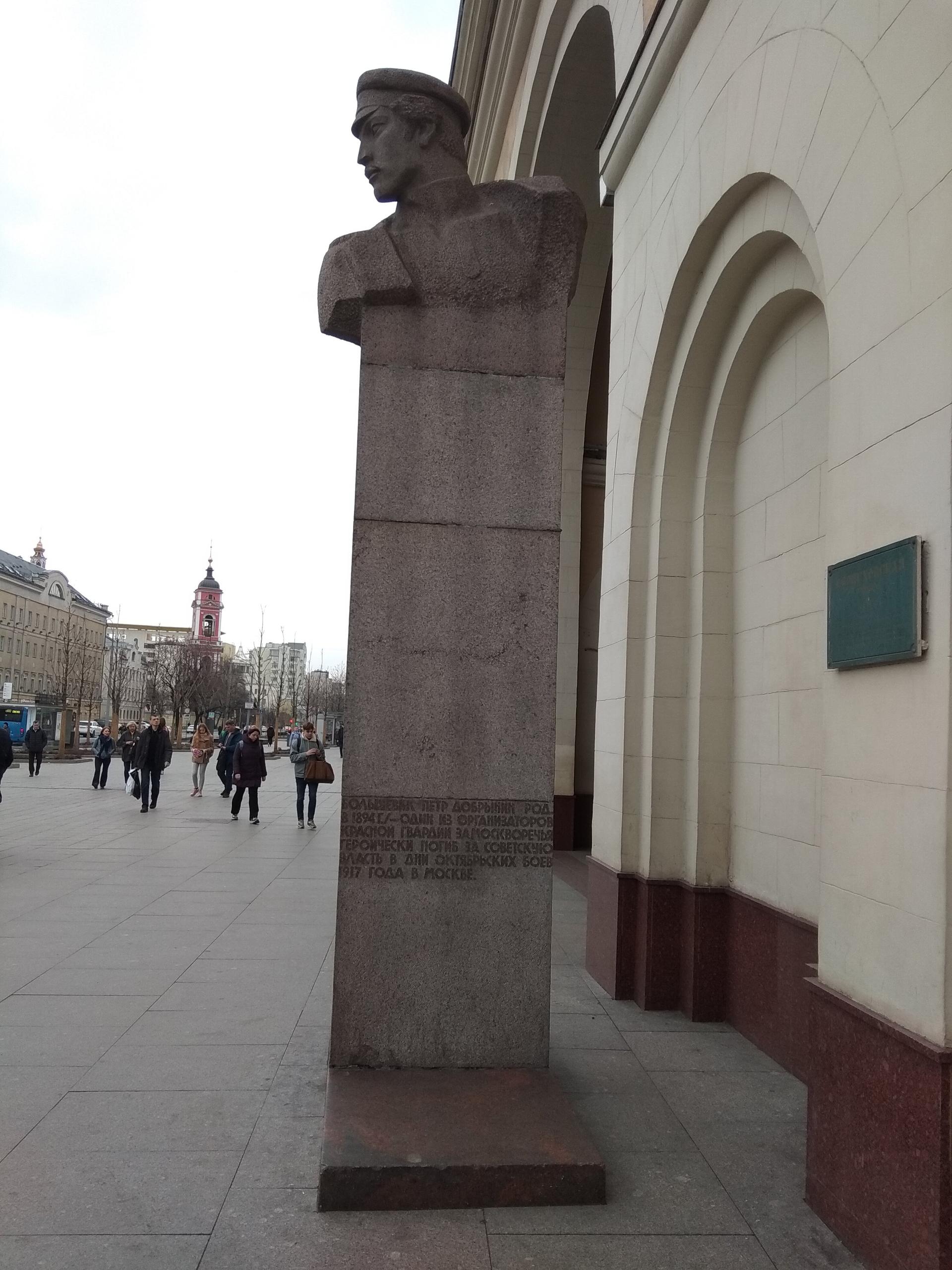 На Добрынинской площади перед вестибюлем станции метро «Добрынинская» на постаменте стоит бюст героя революции, высеченный из розового гранита. На постаменте надпись: «Большевик Петр Добрынин (род. в 1894 г.) — один из организаторов Красной гвардии Замоскворечья. Героически погиб за советскую власть в дни октябрьских боев 1917 г. в Москве». Реставрационные работы на объекте проводились в 2009 г. и включали очистку от различных загрязнений гранитной поверхности, докомпоновку сколов камня, антисептирование и консервационные работы.