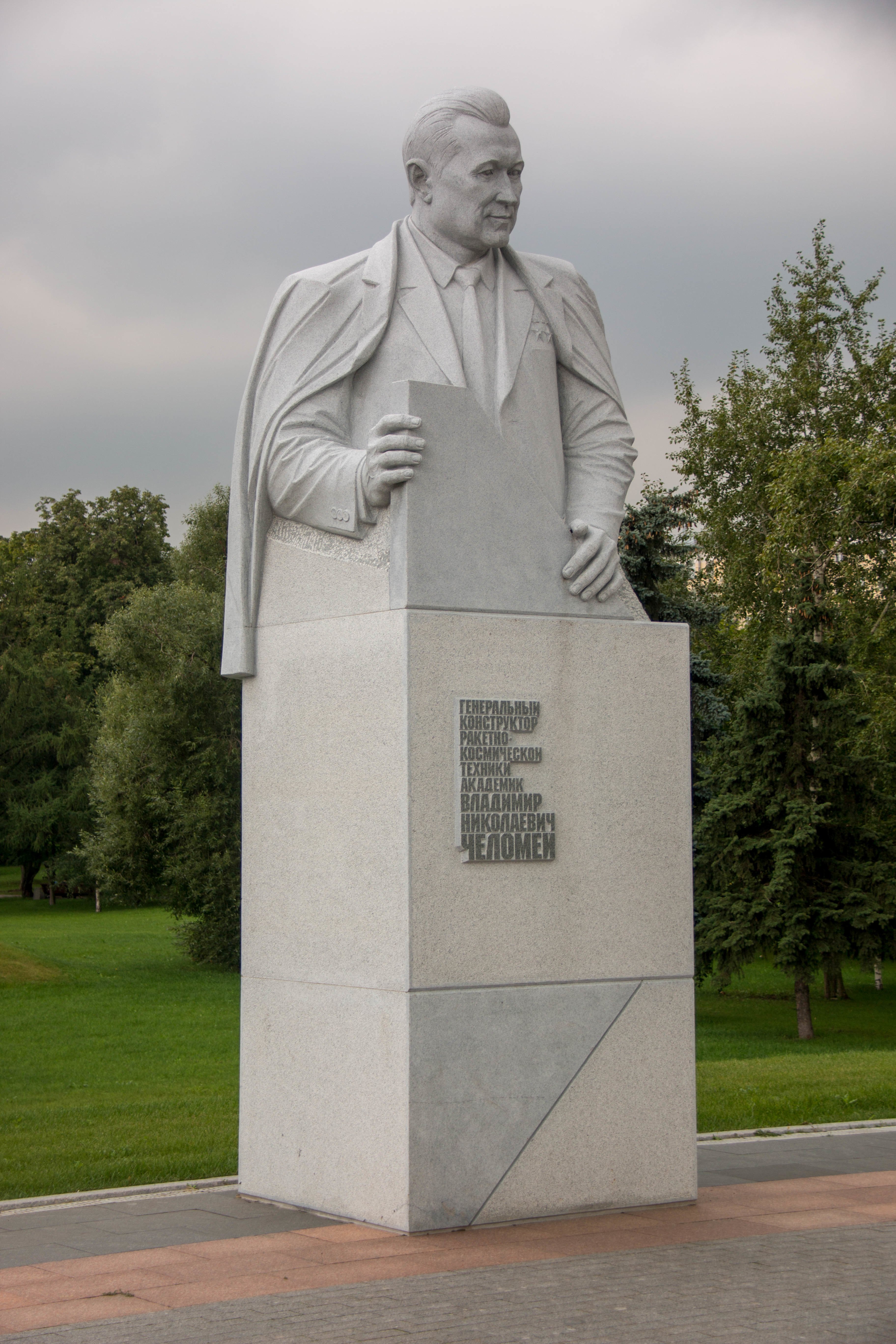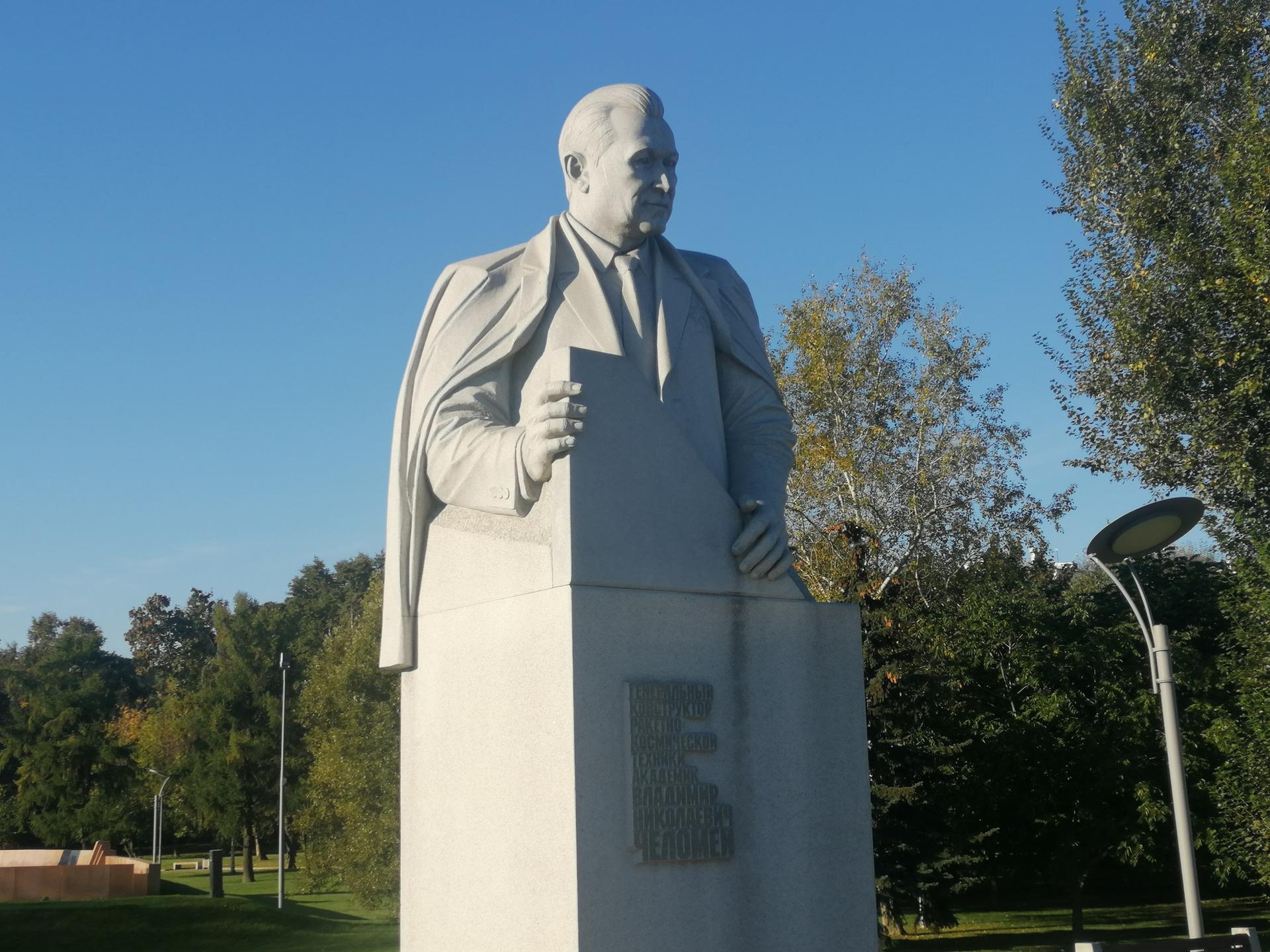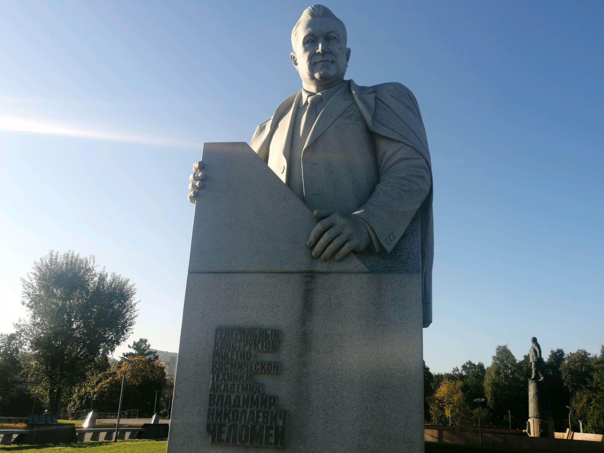 Памятник представляет В. Н. Челомея за работой. Ученый одет в костюм, на плечах плащ. В руках папка. Он с улыбкой смотрит вперед. Памятная надпись: «Генеральный конструктор ракетно-космической техники академик Владимир Николаевич Челомей».