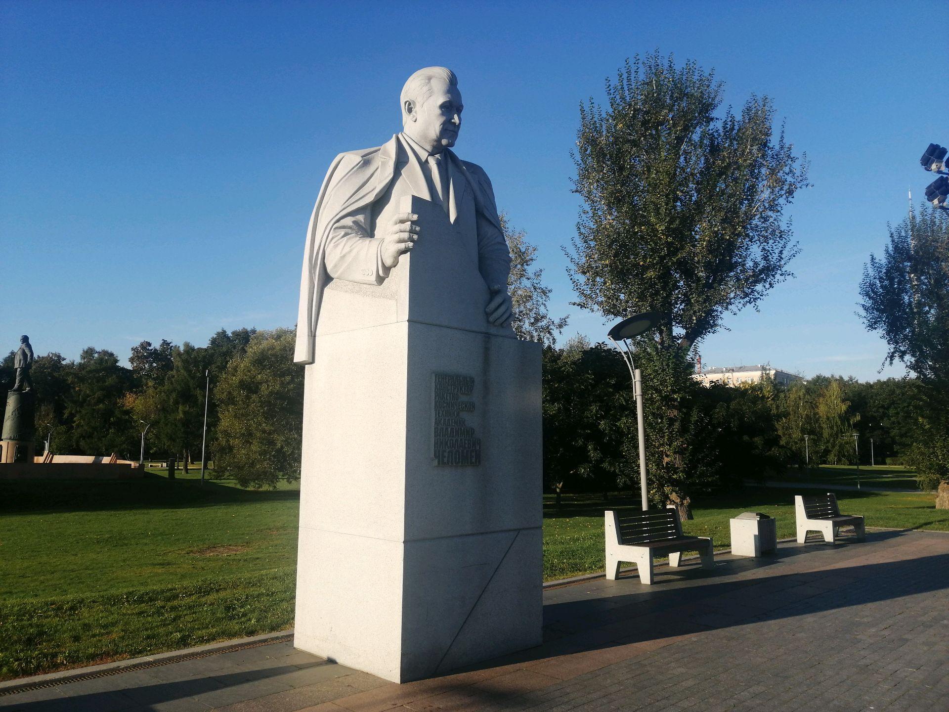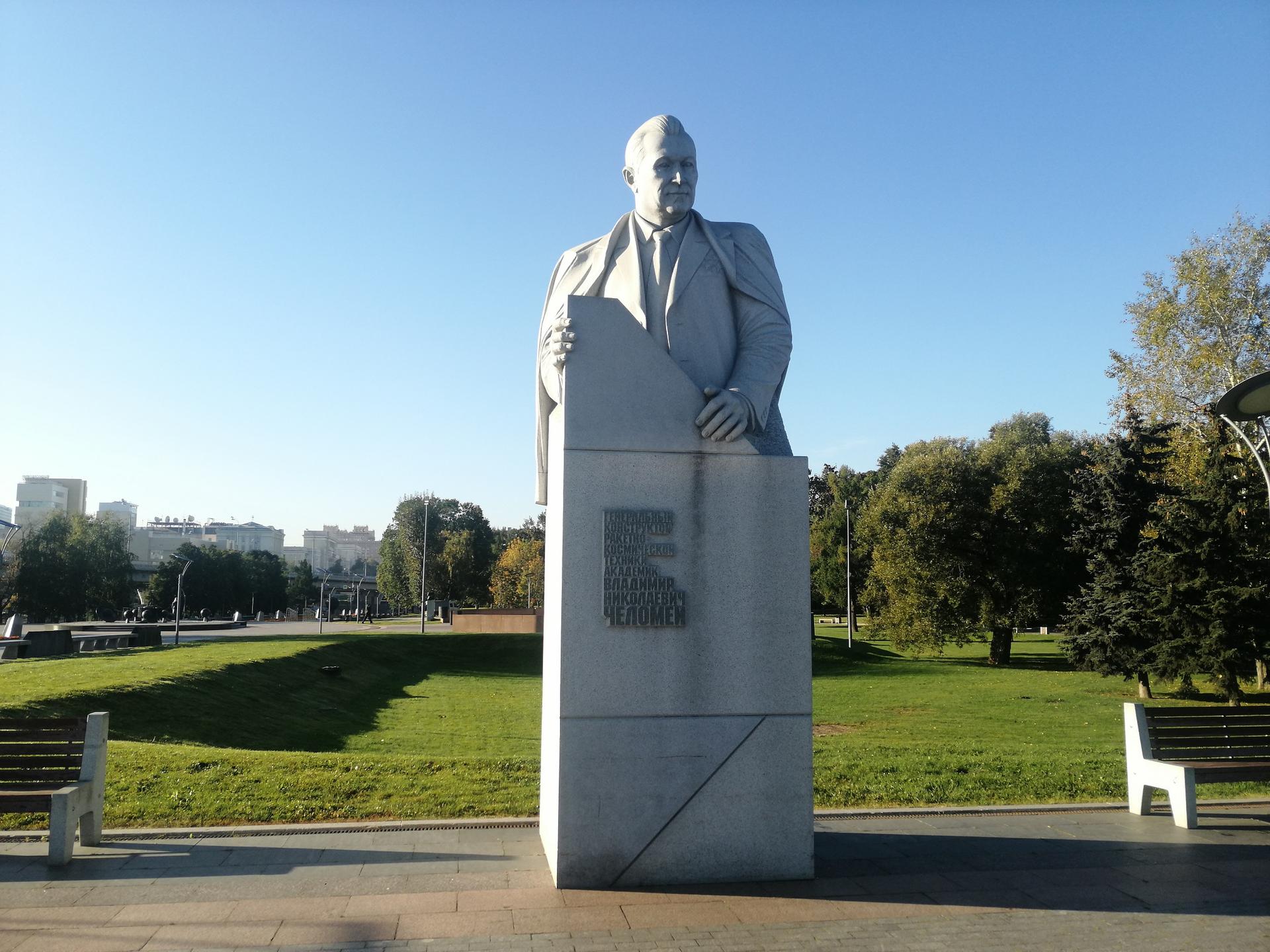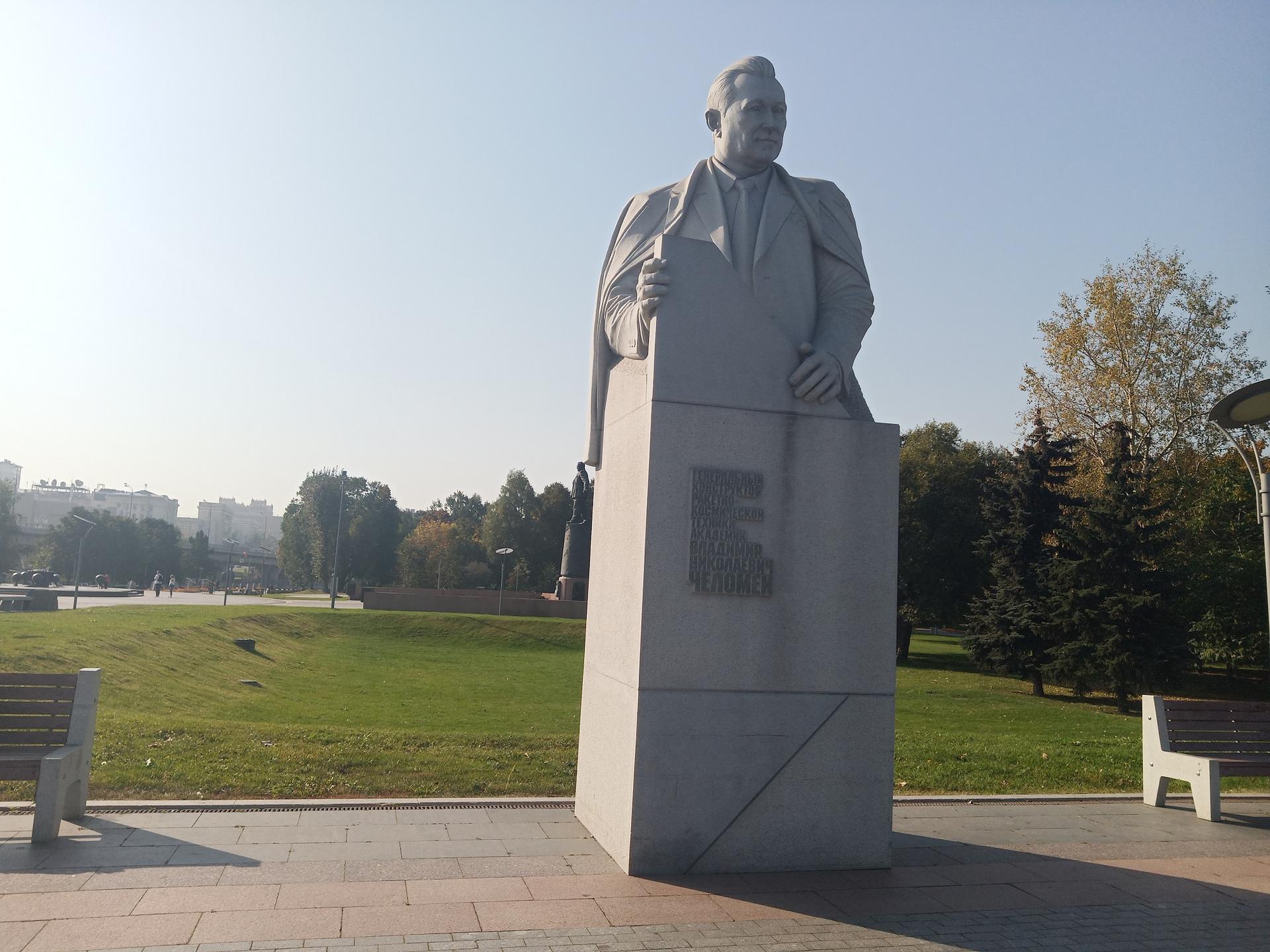 Памятник представляет В. Н. Челомея за работой. Ученый одет в костюм, на плечах плащ. В руках папка. Он с улыбкой смотрит вперед. Памятная надпись: «Генеральный конструктор ракетно-космической техники академик Владимир Николаевич Челомей».