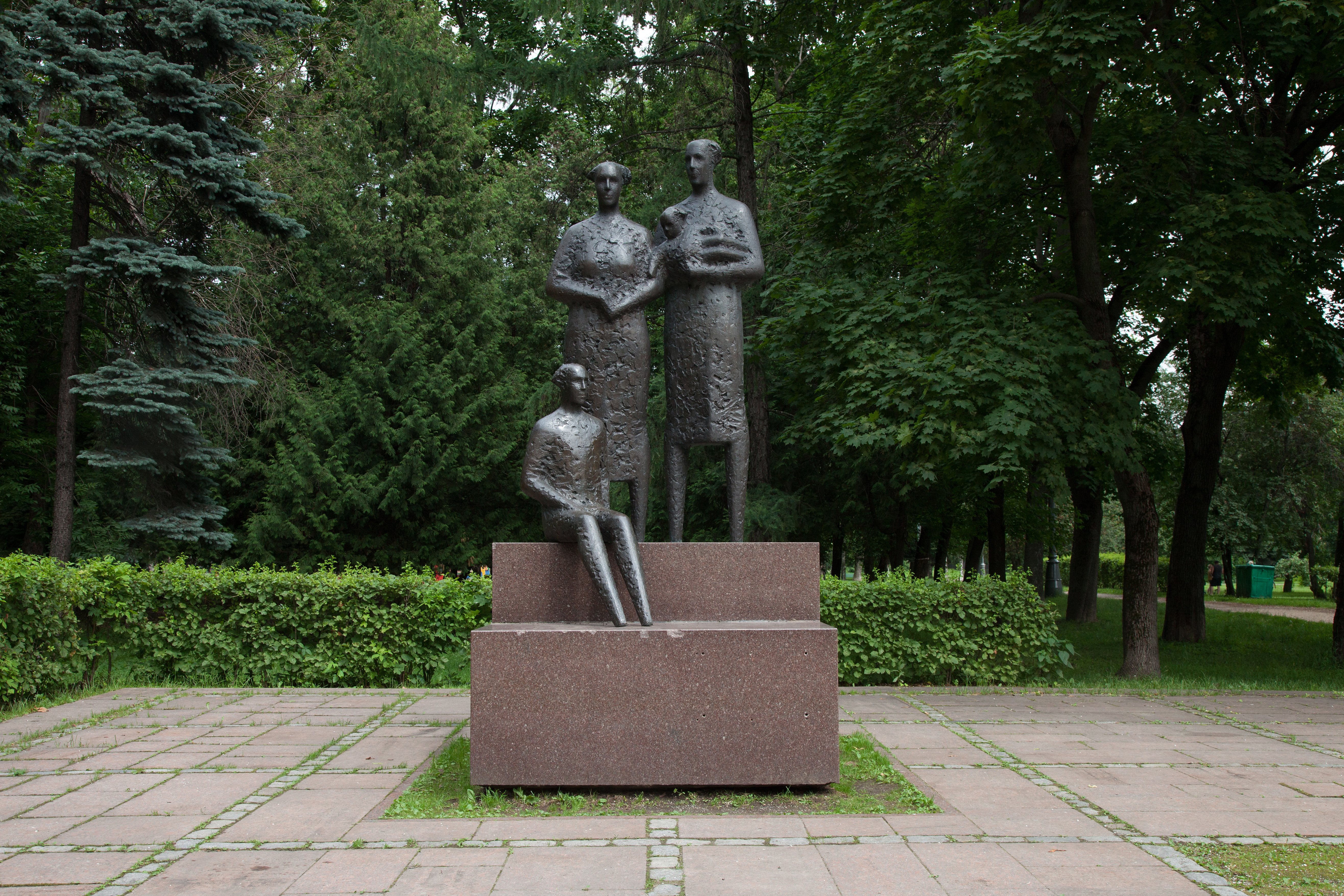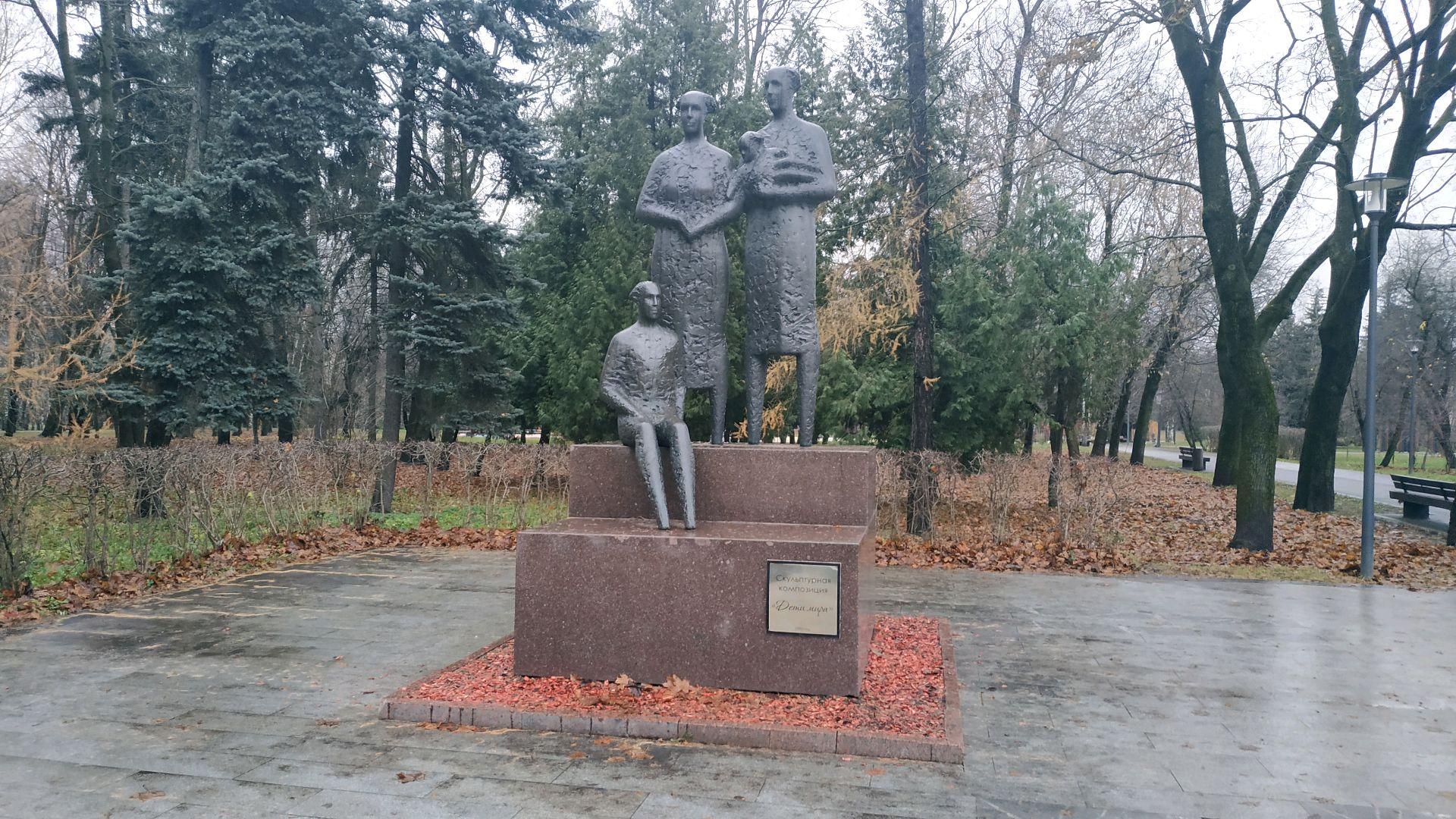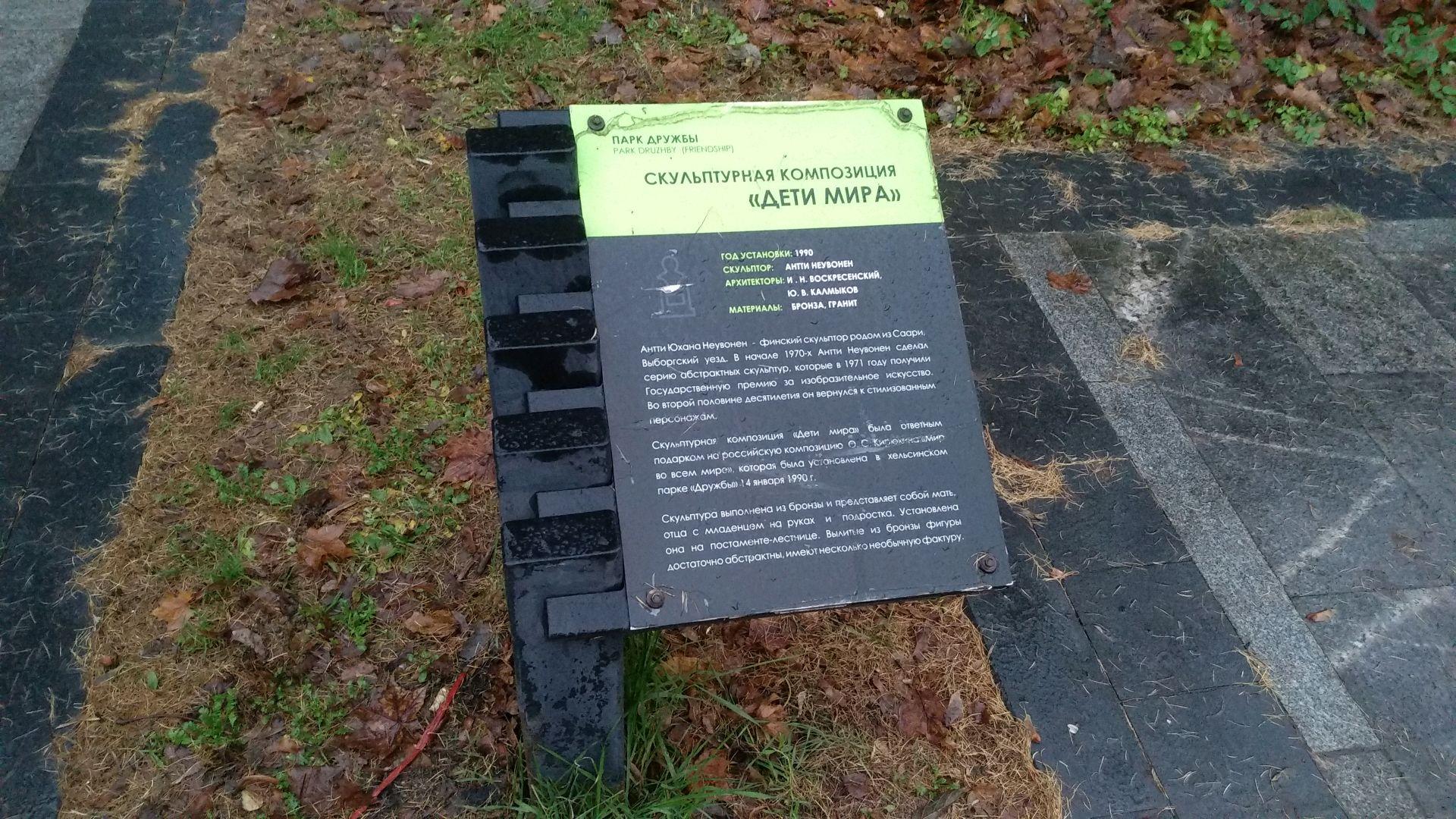 Скульптурная композиция «Дети мира» состоит из фигур матери, отца, держащего младенца на руках, и подростка. Вылитые из бронзы фигуры достаточно абстрактны, имеют несколько необычную фактуру. Композиция была подарена в ответ на российскую композицию Ю. Кирюхина «Мир во всем мире», установленную в хельсинском парке Дружбы 14 января 1990 г.