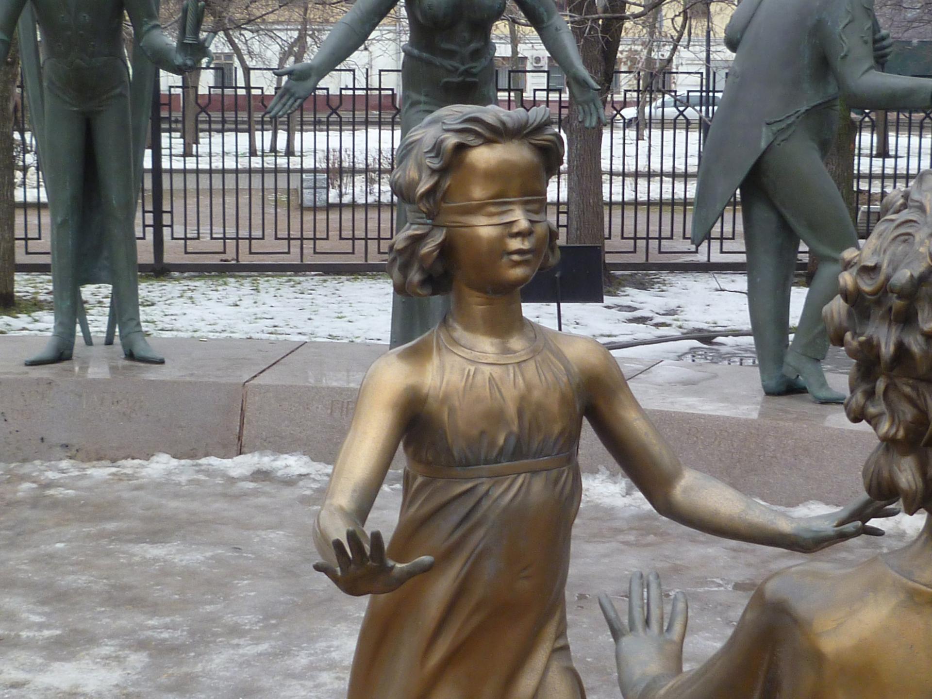 Скульптурная композиция включает в себя фигуры детей, мальчика и девочки, которые застыли в движении с завязанными глазами, у их ног лежат книги: «Народные русские сказки» и А.С. Пушкин «Сказки», а вокруг полукругом расположены фигуры, олицетворяющие пороки или зло современного мира - наркомания, воровство, алкоголизм, невежество, лженаучность, равнодушие, пропаганда насилия, эксплуатация детского труда, нищета...