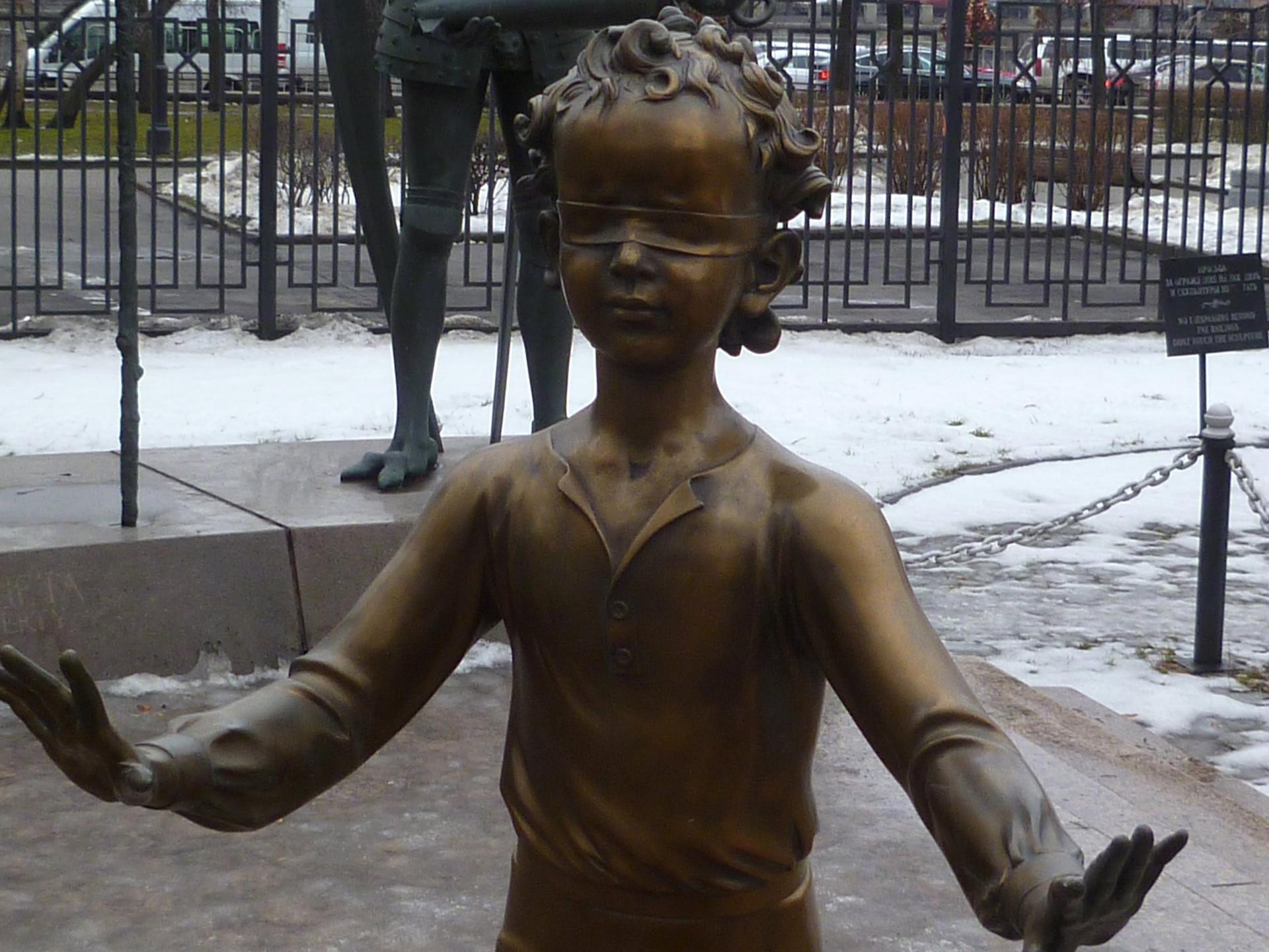 15 фигур - двое играющих в жмурки детей с завязанными глазами, окружённые трехметровыми аллегорическими монстрами, - производят на зрителей неизменно сильное впечатление. Антропоморфные фигуры олицетворяют «пороки взрослых», разрушающих детей. Контраст между миром взрослых пороков и невинностью детства достигается также с помощью цветового решения.