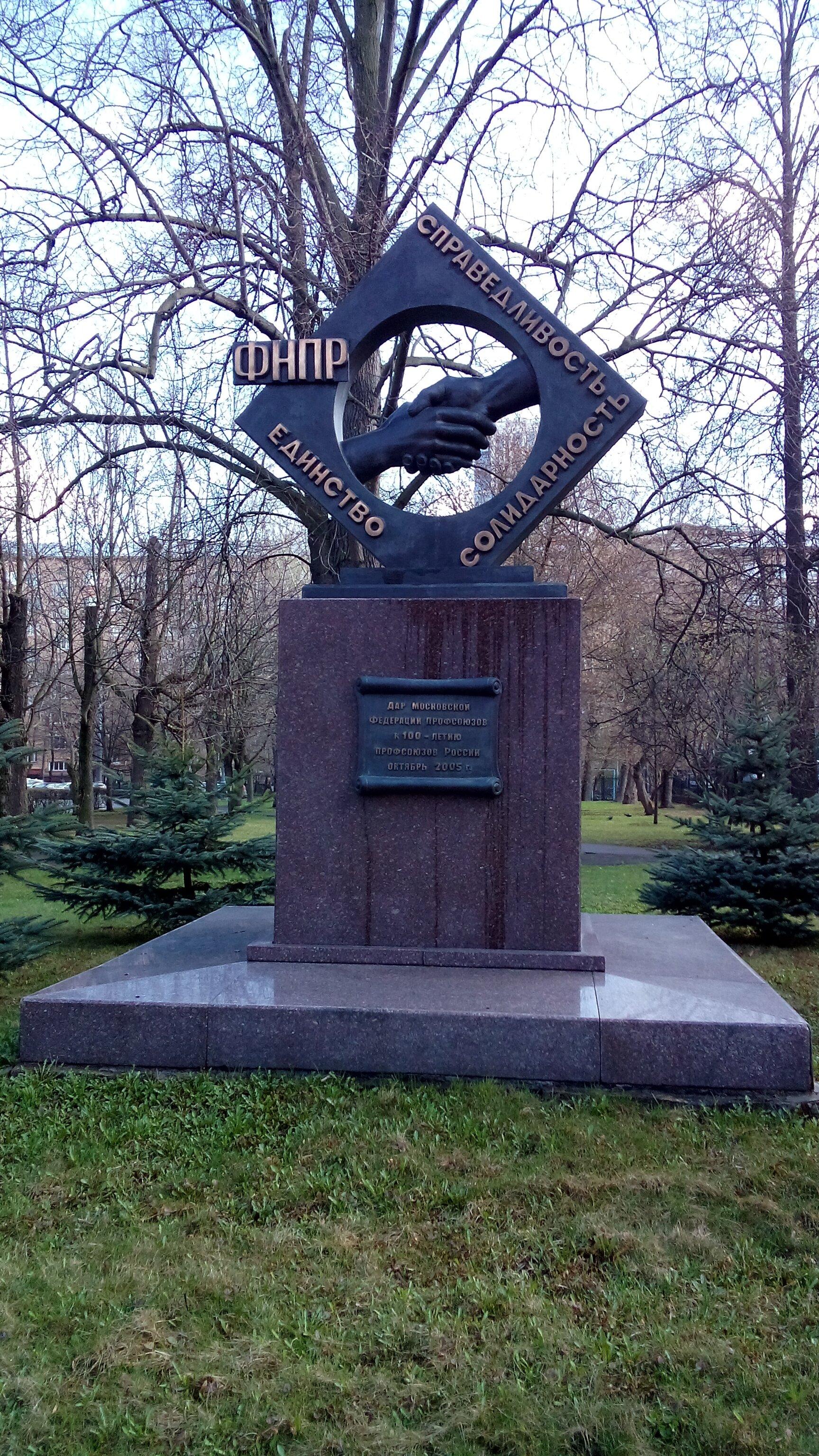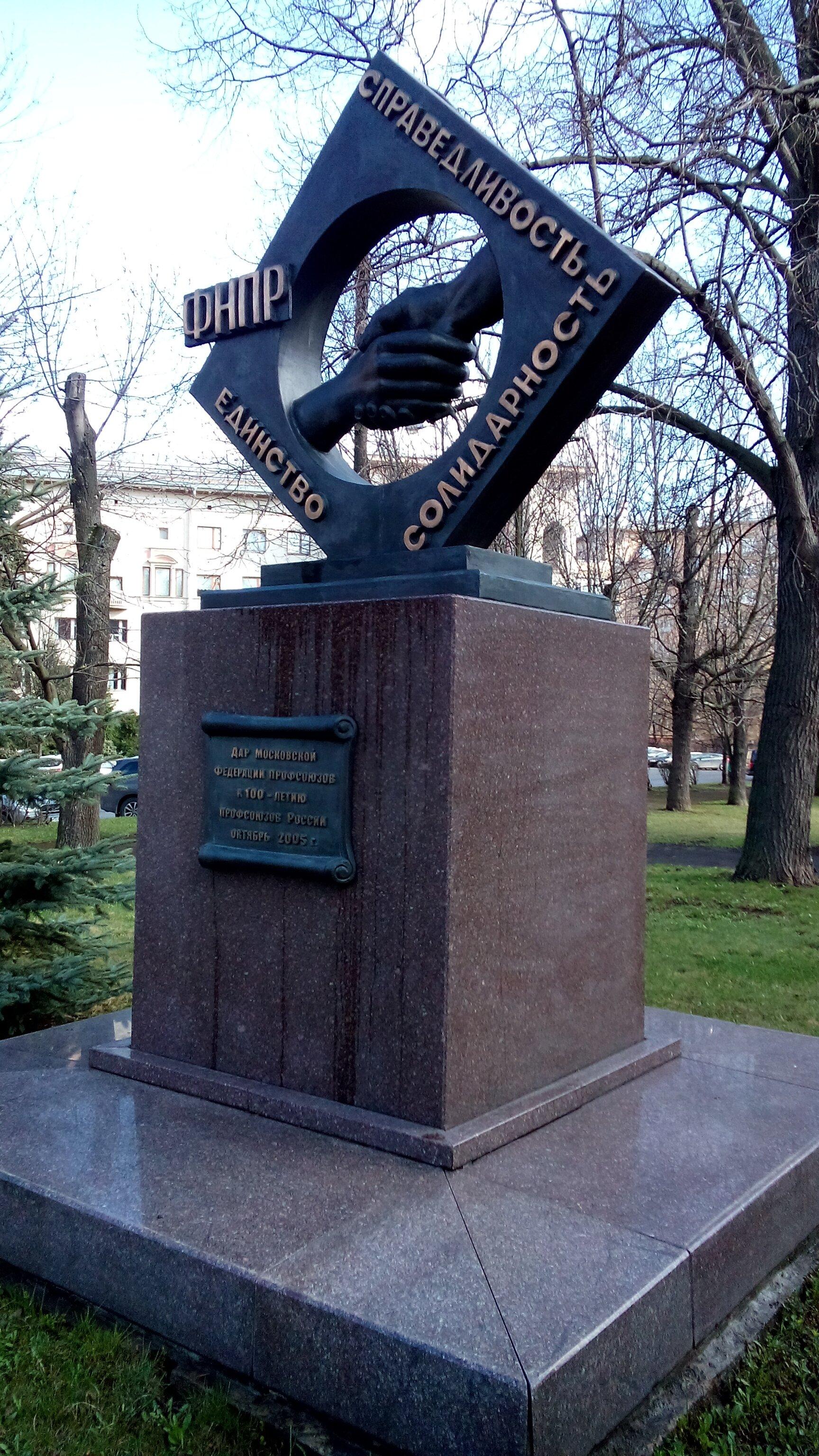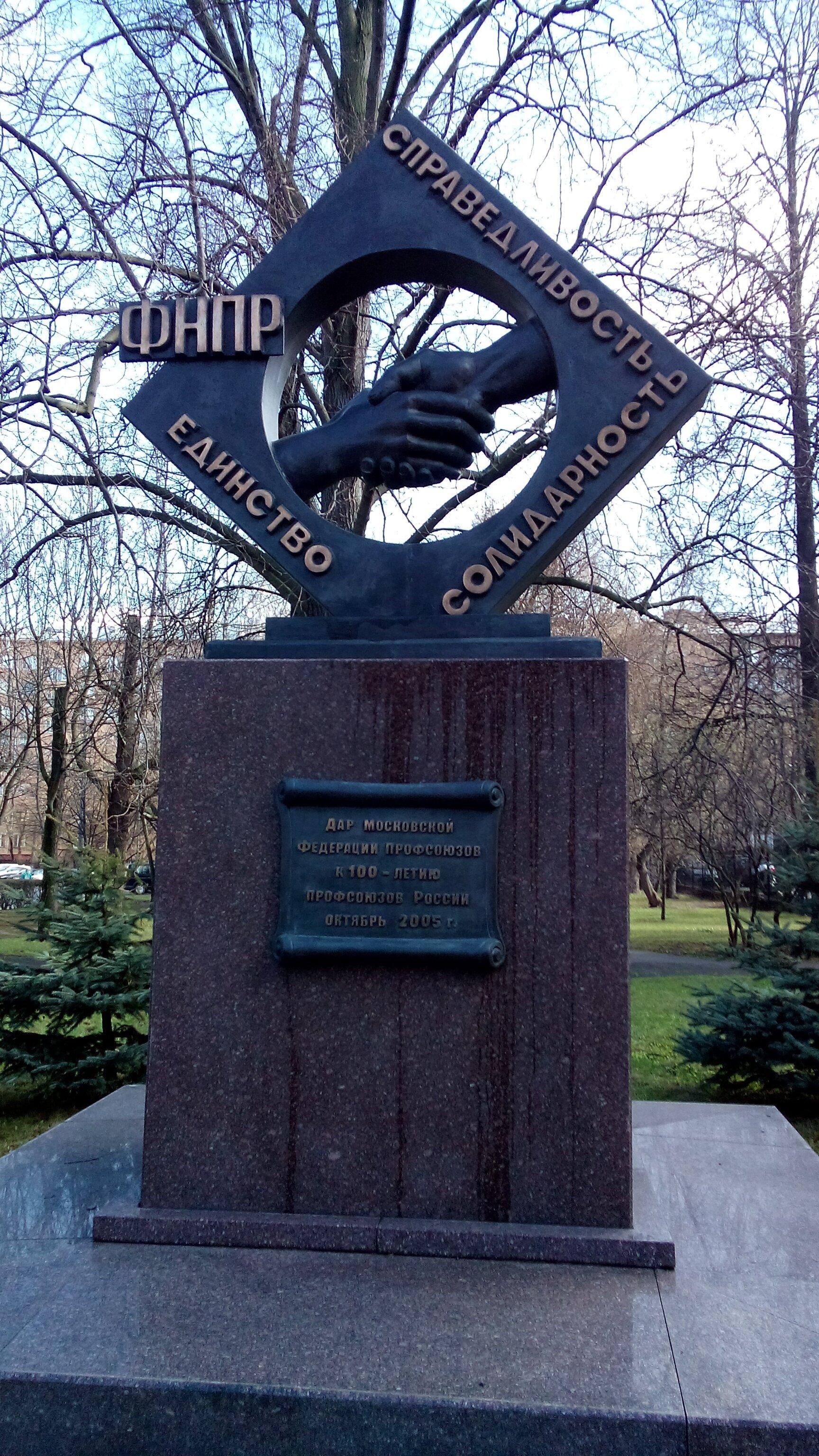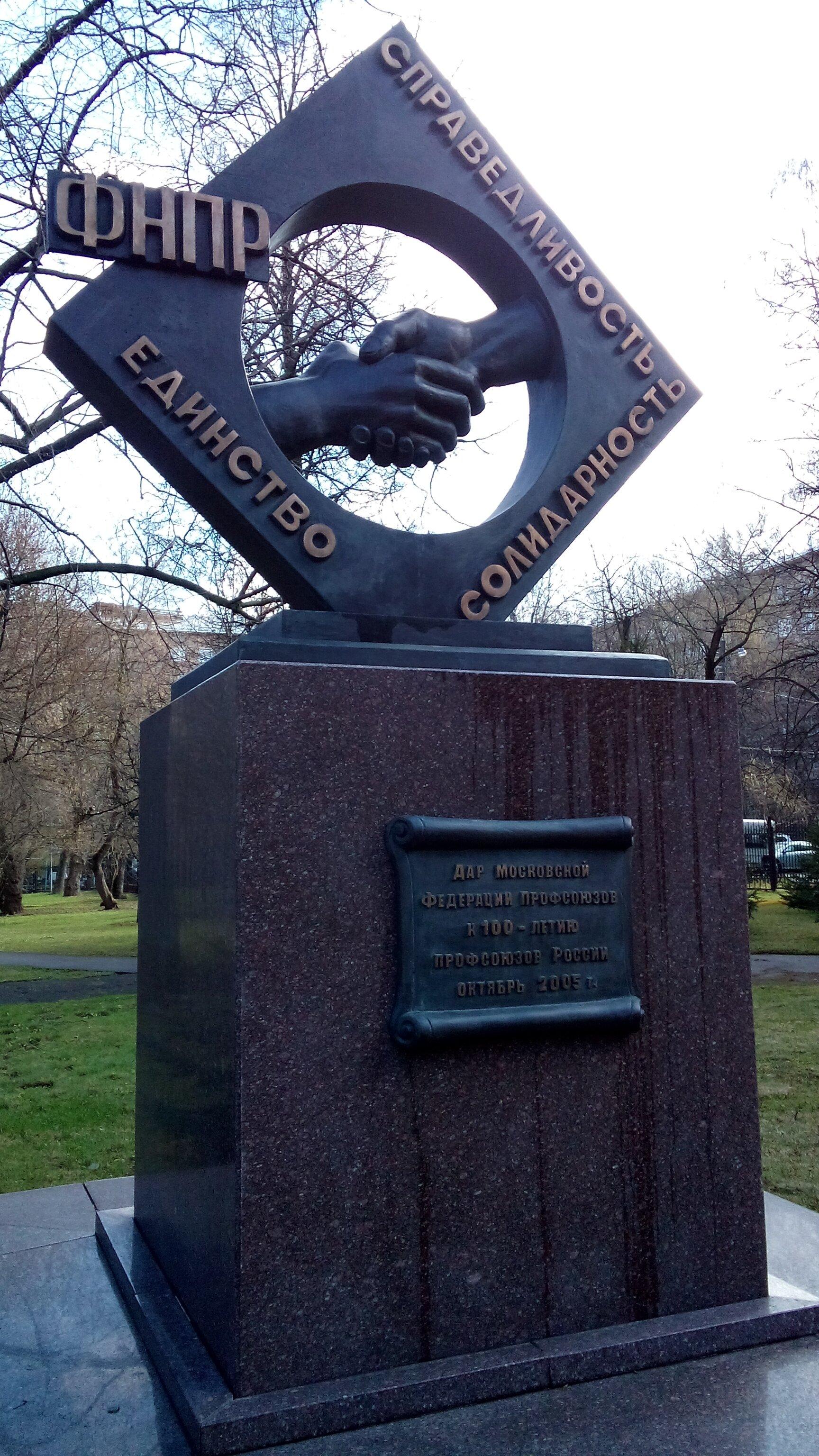 "Единство, солидарность, справедливость" - слова, написанные по периметру памятника, видимо являются лозунгом Федерации Независимых Профсоюзов, на территории которой находится памятник. Квадратная черная рамка с лозунгом по периметру и круглое отверстие в центре, заполненное скульптурным изображением рукопожатия.