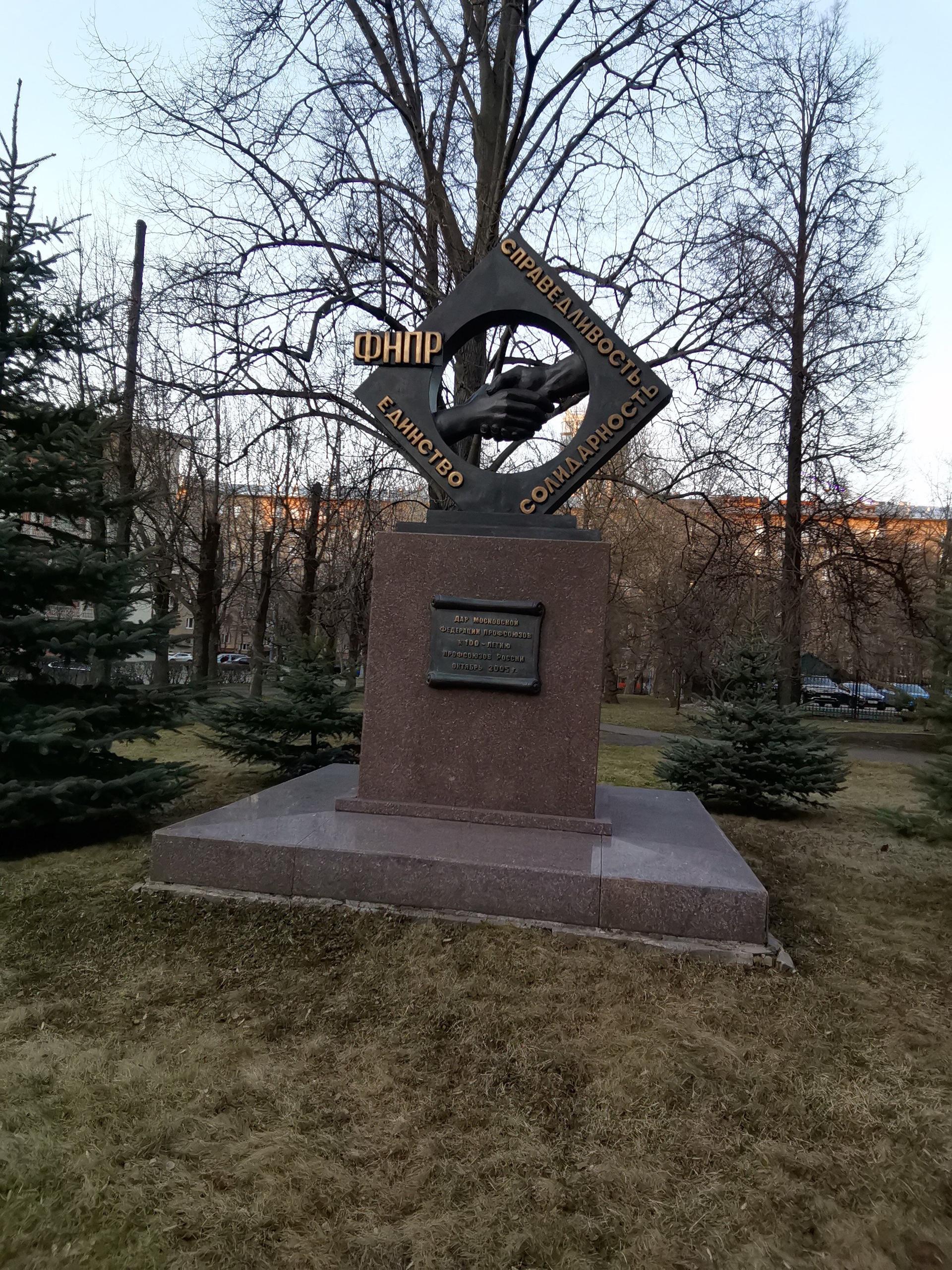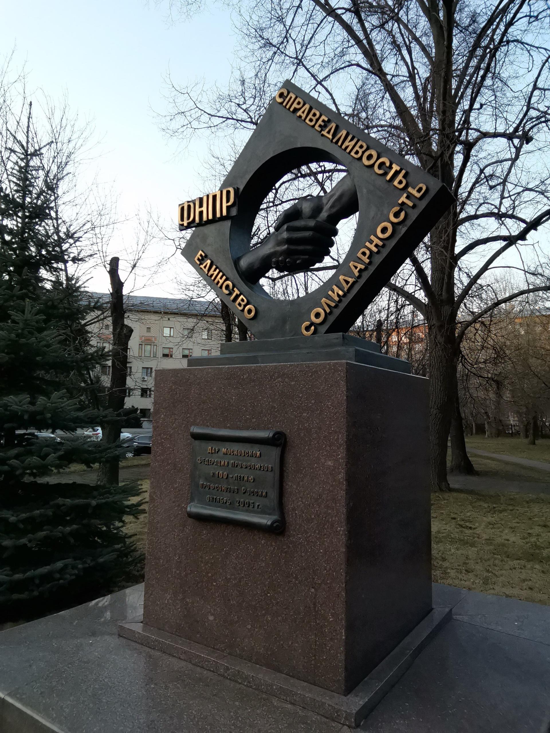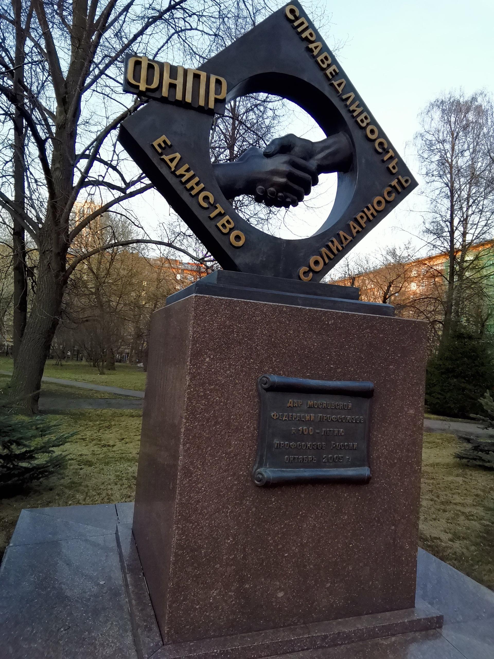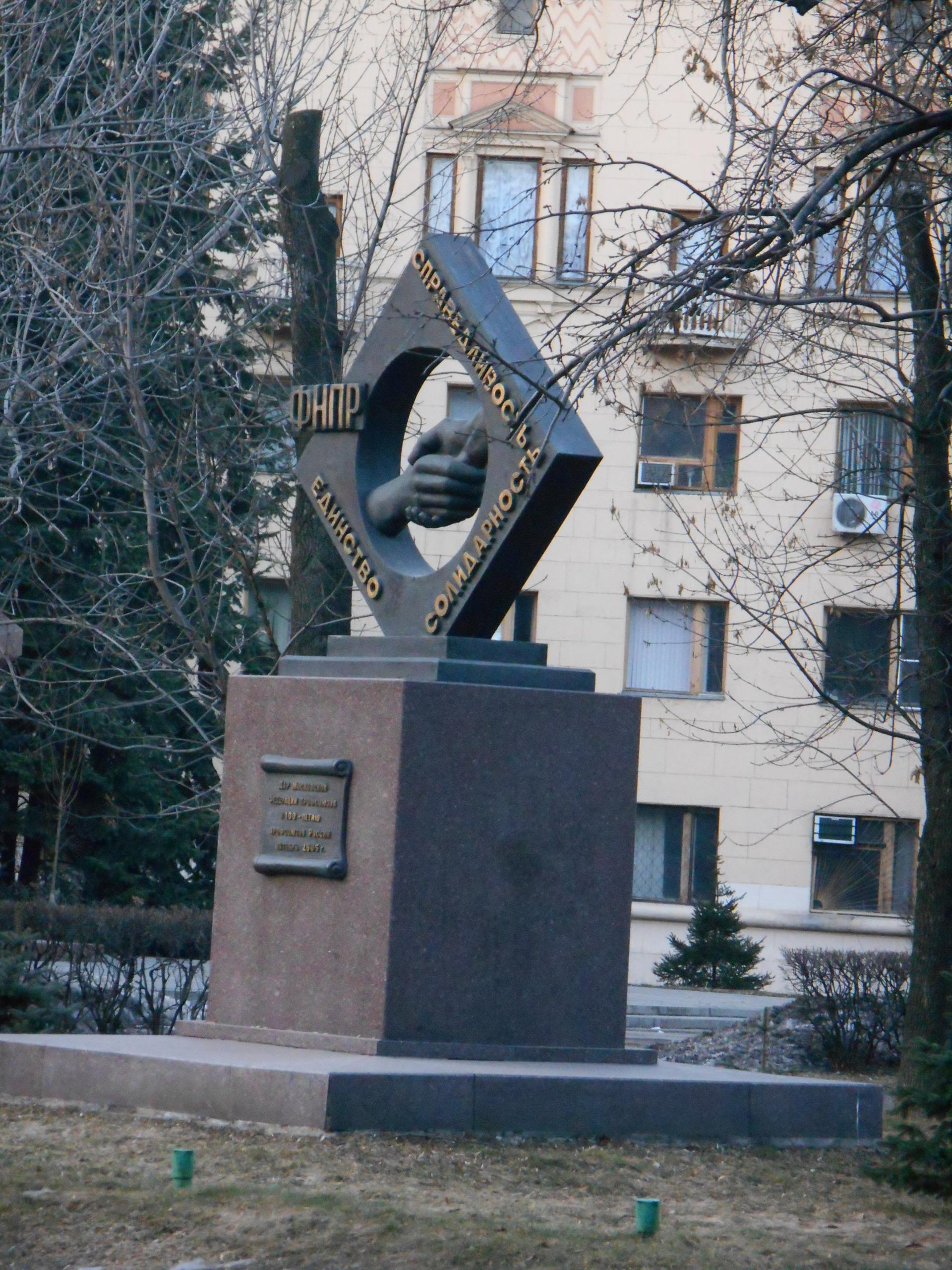 "Единство, солидарность, справедливость" - слова, написанные по периметру памятника, видимо являются лозунгом Федерации Независимых Профсоюзов, на территории которой находится памятник. Квадратная черная рамка с лозунгом по периметру и круглое отверстие в центре, заполненное скульптурным изображением рукопожатия.