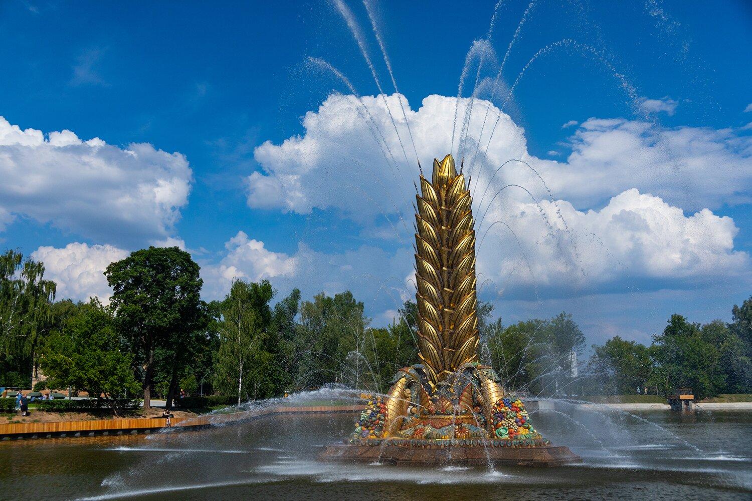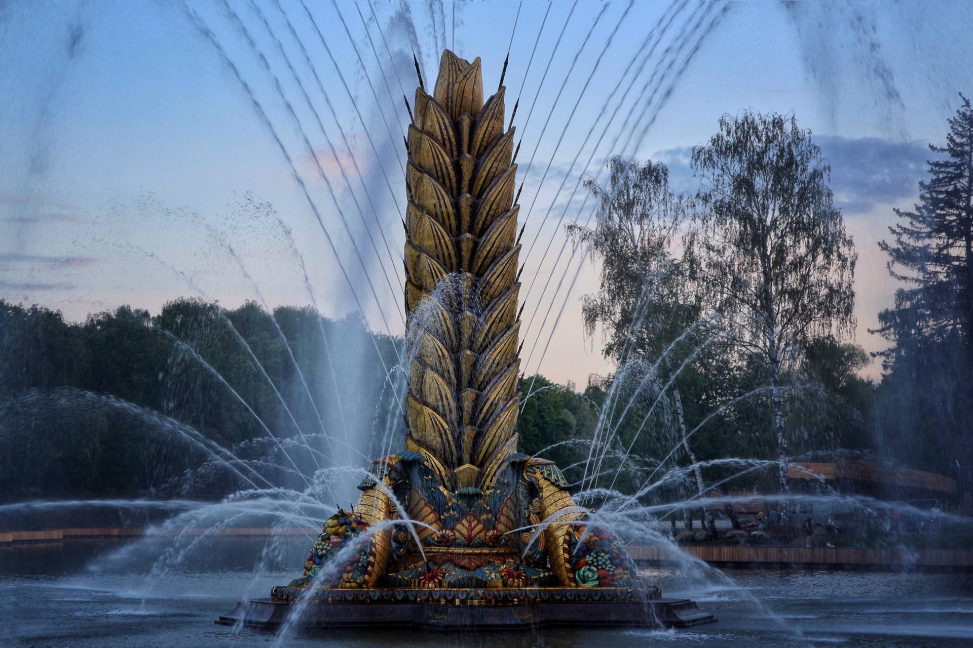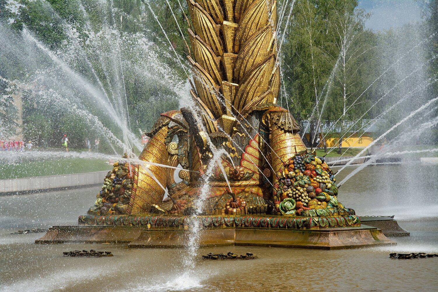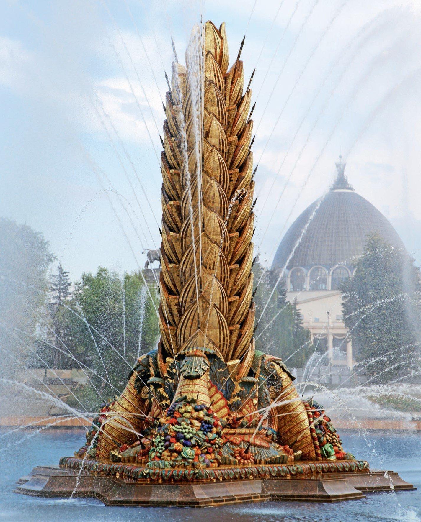 «Золотой колос» считается самым зрелищным фонтаном ВДНХ. Он представляет собой величественный колос пшеницы высотой 16 метров, у основания которого расположены три рога изобилия, наполненные овощами и фруктами. Вся конструкция покрыта мозаичной смальтой, создающей эффект золотого сияния.