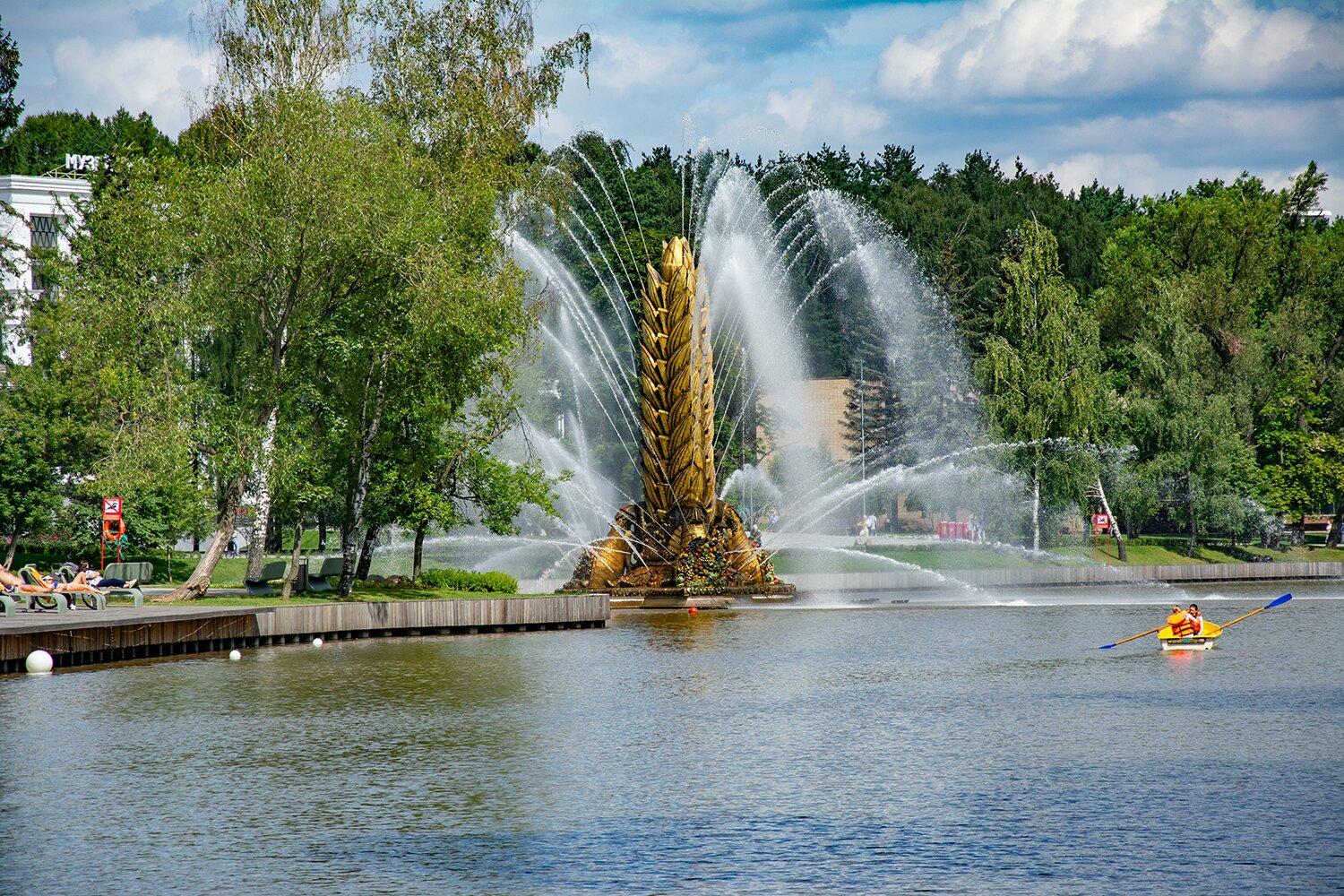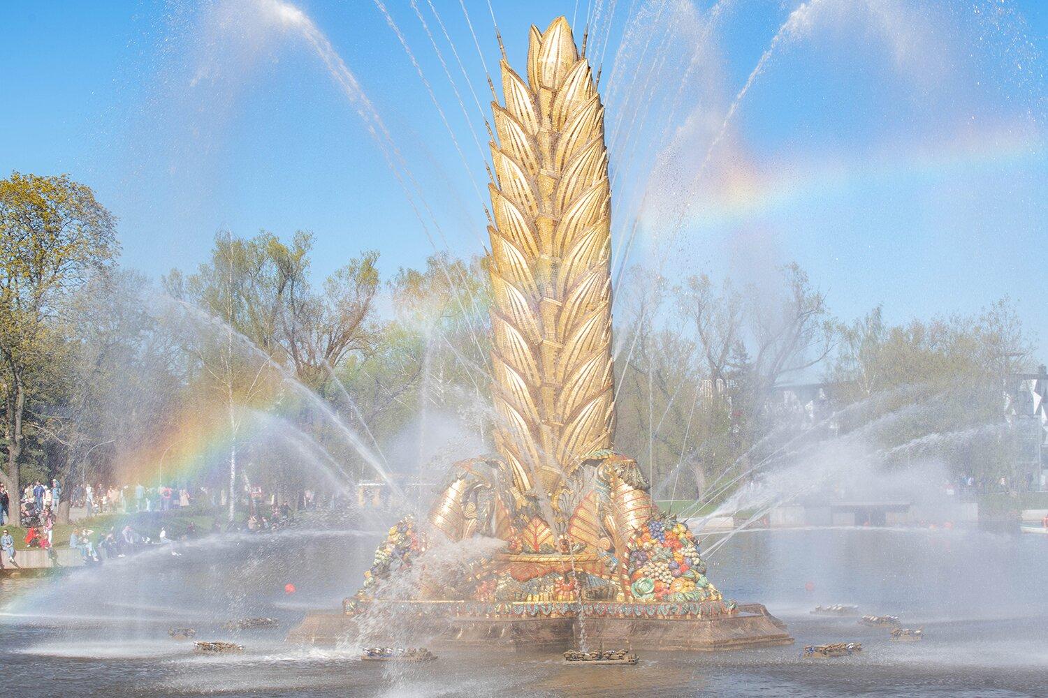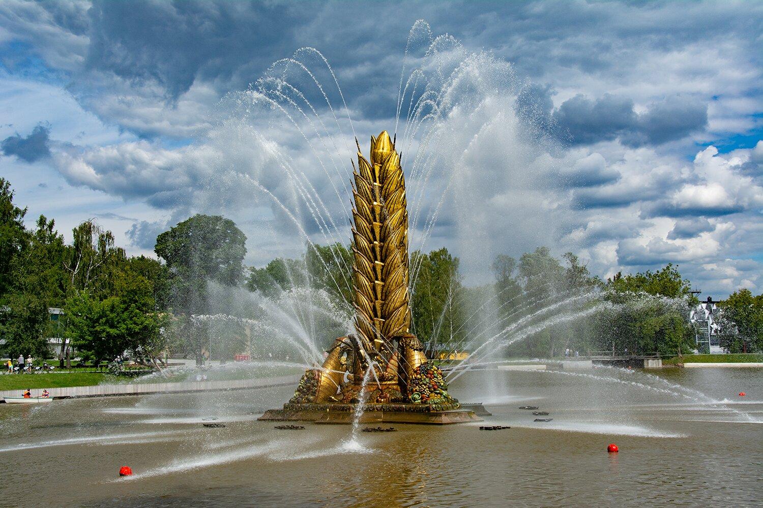 «Золотой колос» считается самым зрелищным фонтаном ВДНХ. Он представляет собой величественный колос пшеницы высотой 16 метров, у основания которого расположены три рога изобилия, наполненные овощами и фруктами. Вся конструкция покрыта мозаичной смальтой, создающей эффект золотого сияния.