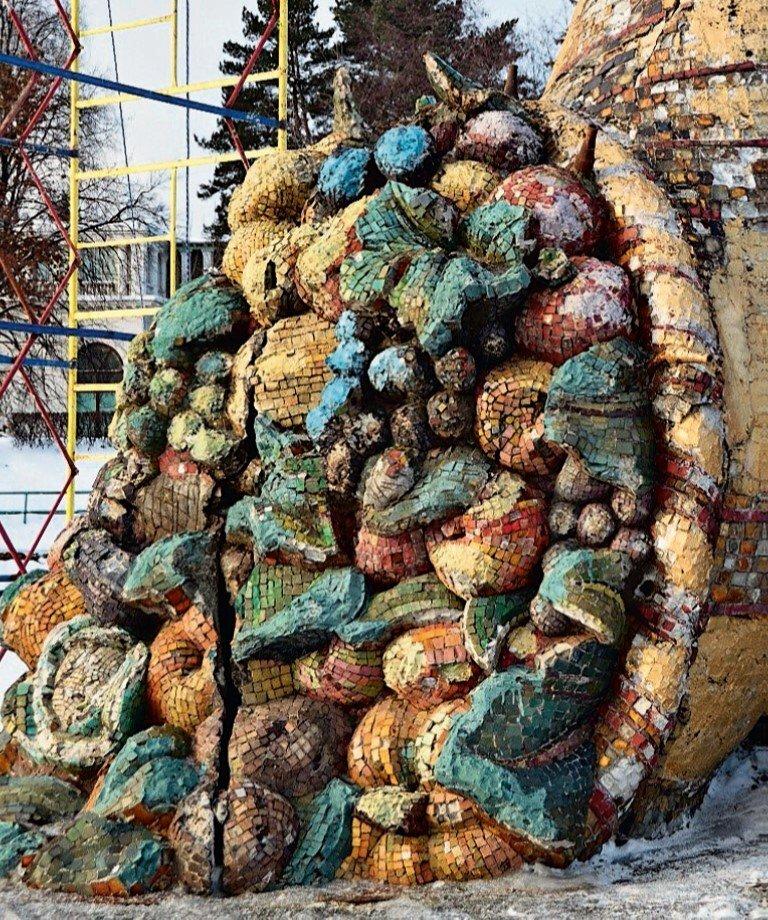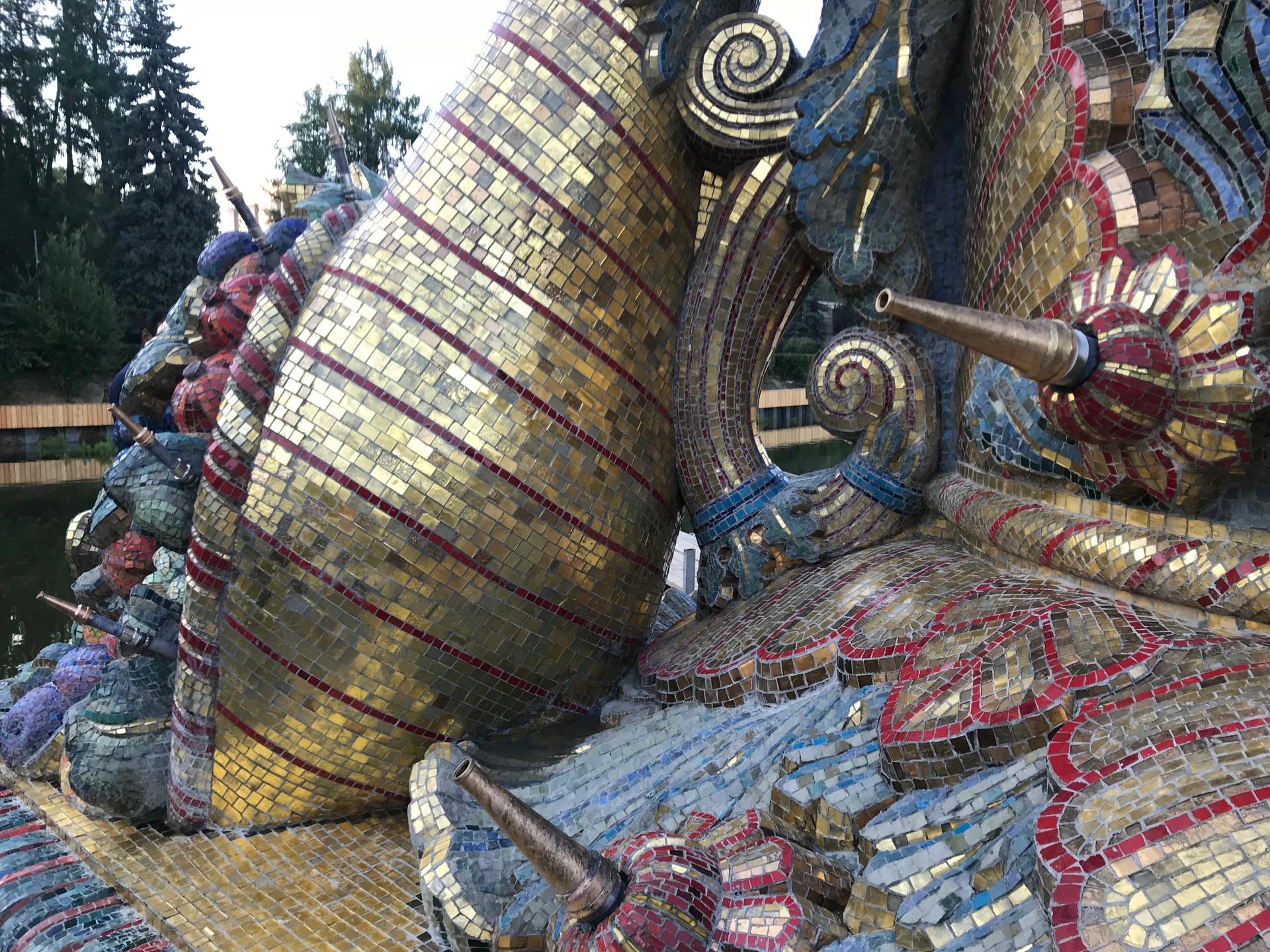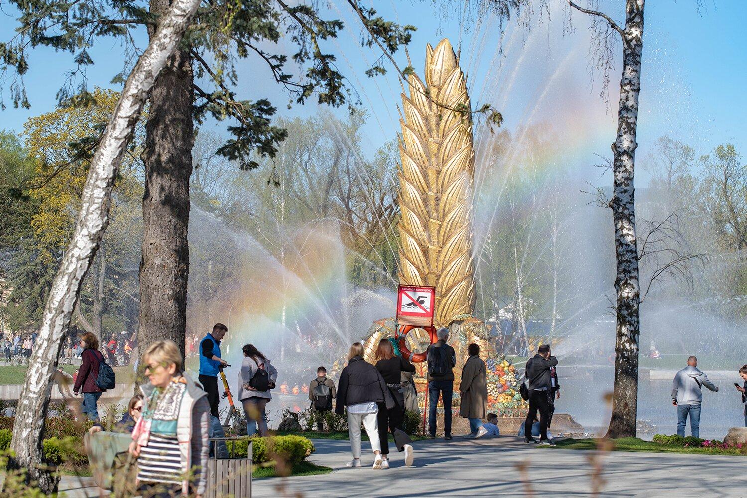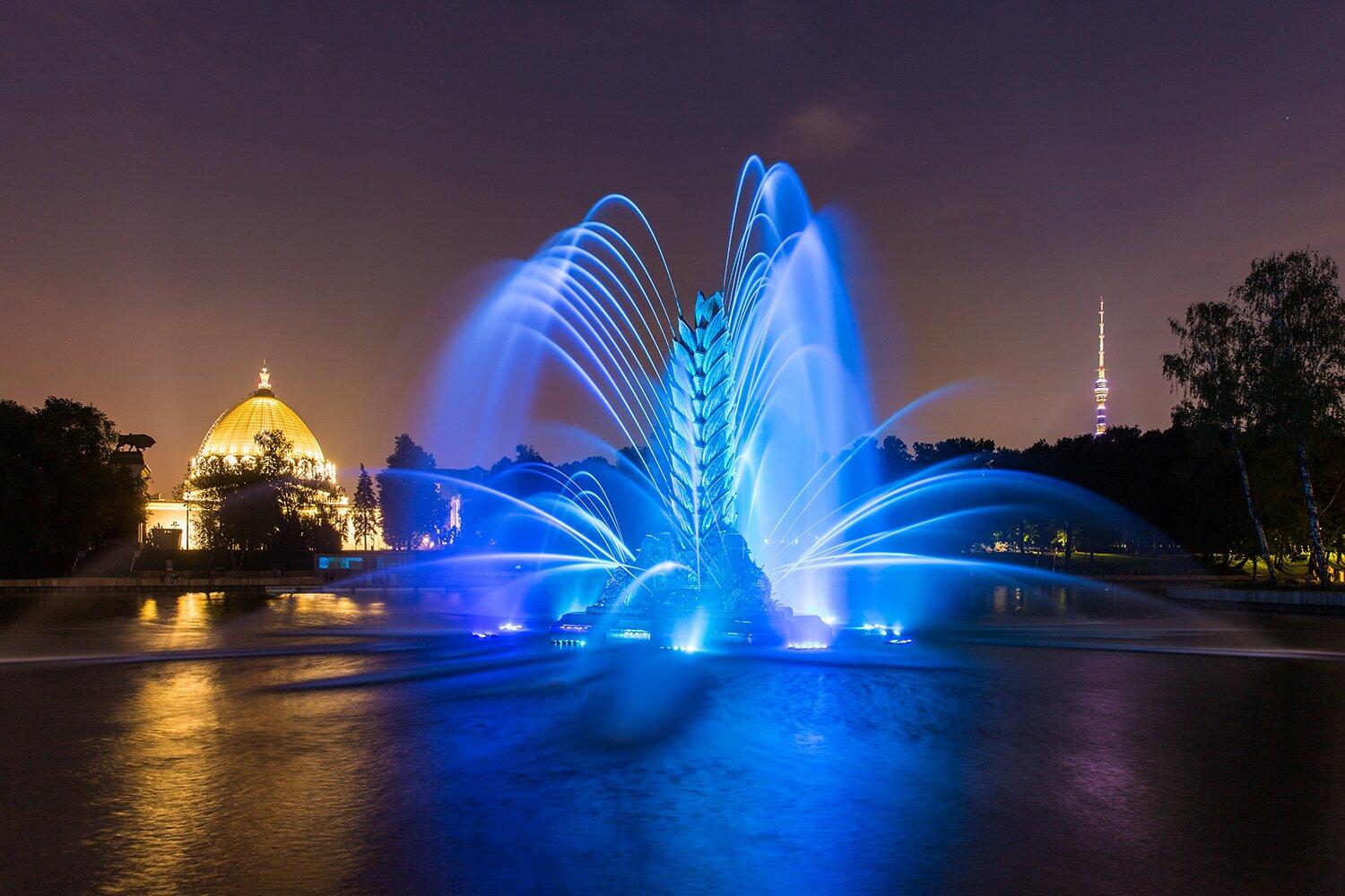 «Золотой колос» считается самым зрелищным фонтаном ВДНХ. Он представляет собой величественный колос пшеницы высотой 16 метров, у основания которого расположены три рога изобилия, наполненные овощами и фруктами. Вся конструкция покрыта мозаичной смальтой, создающей эффект золотого сияния.