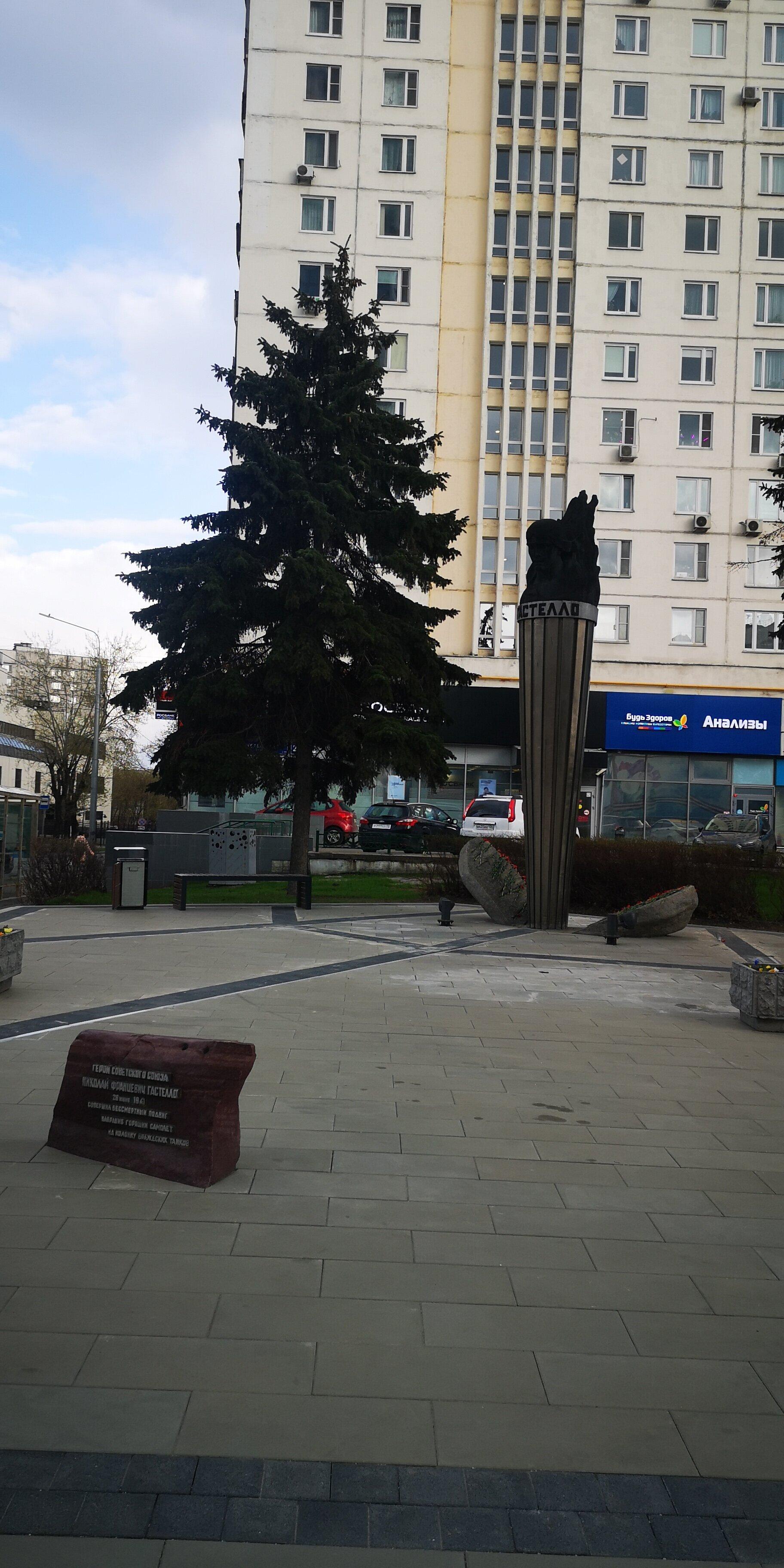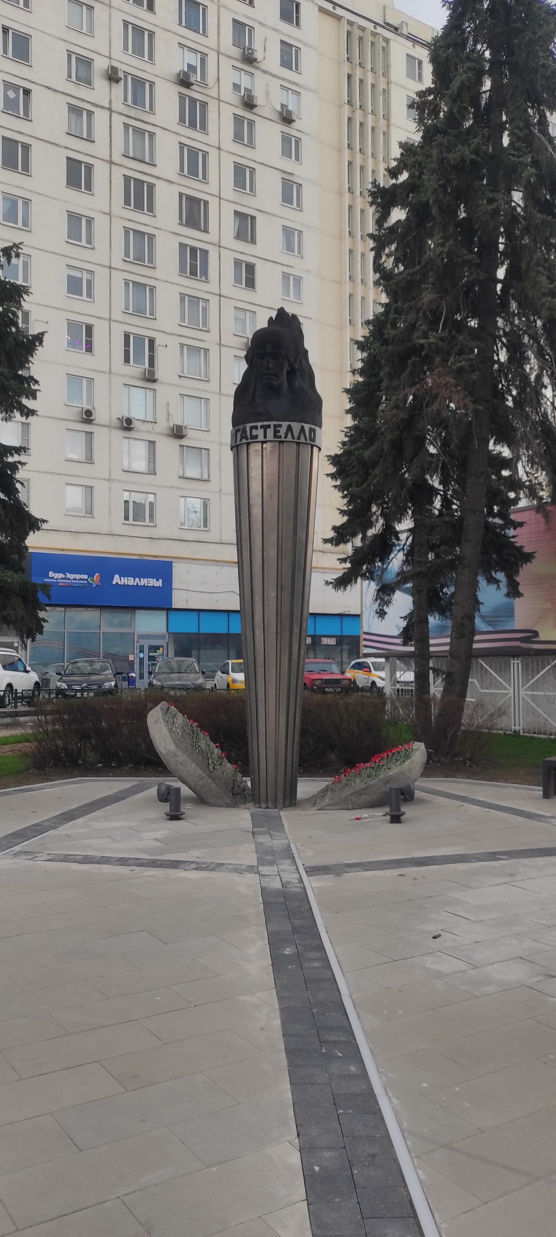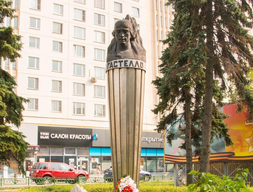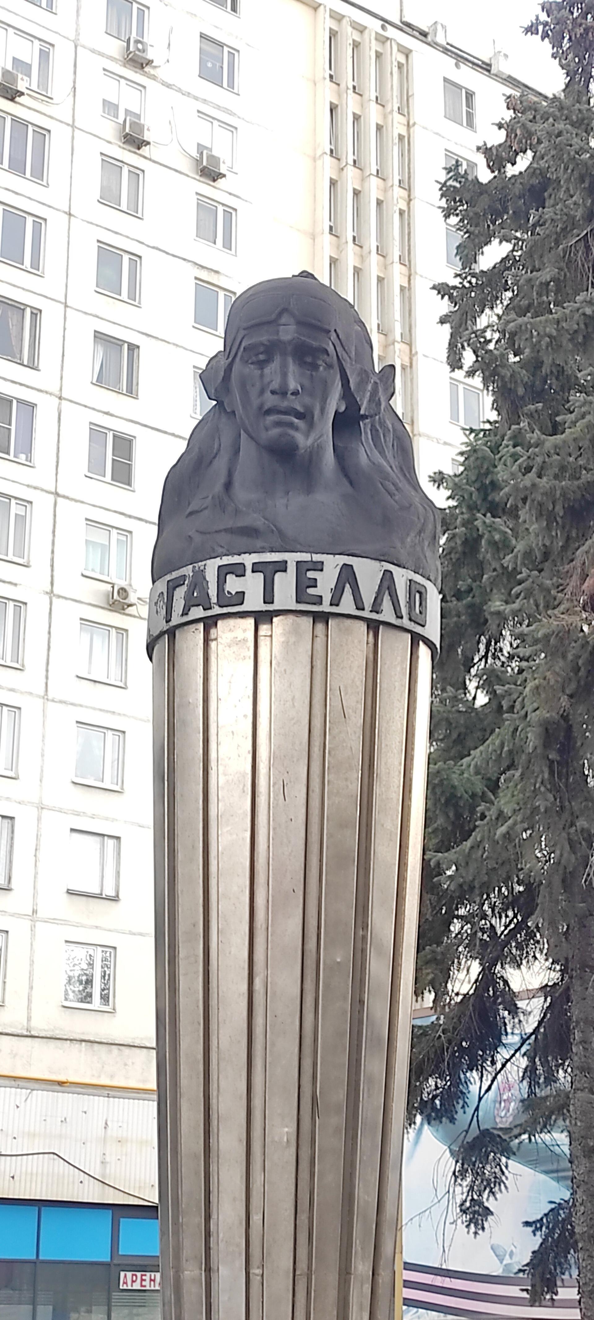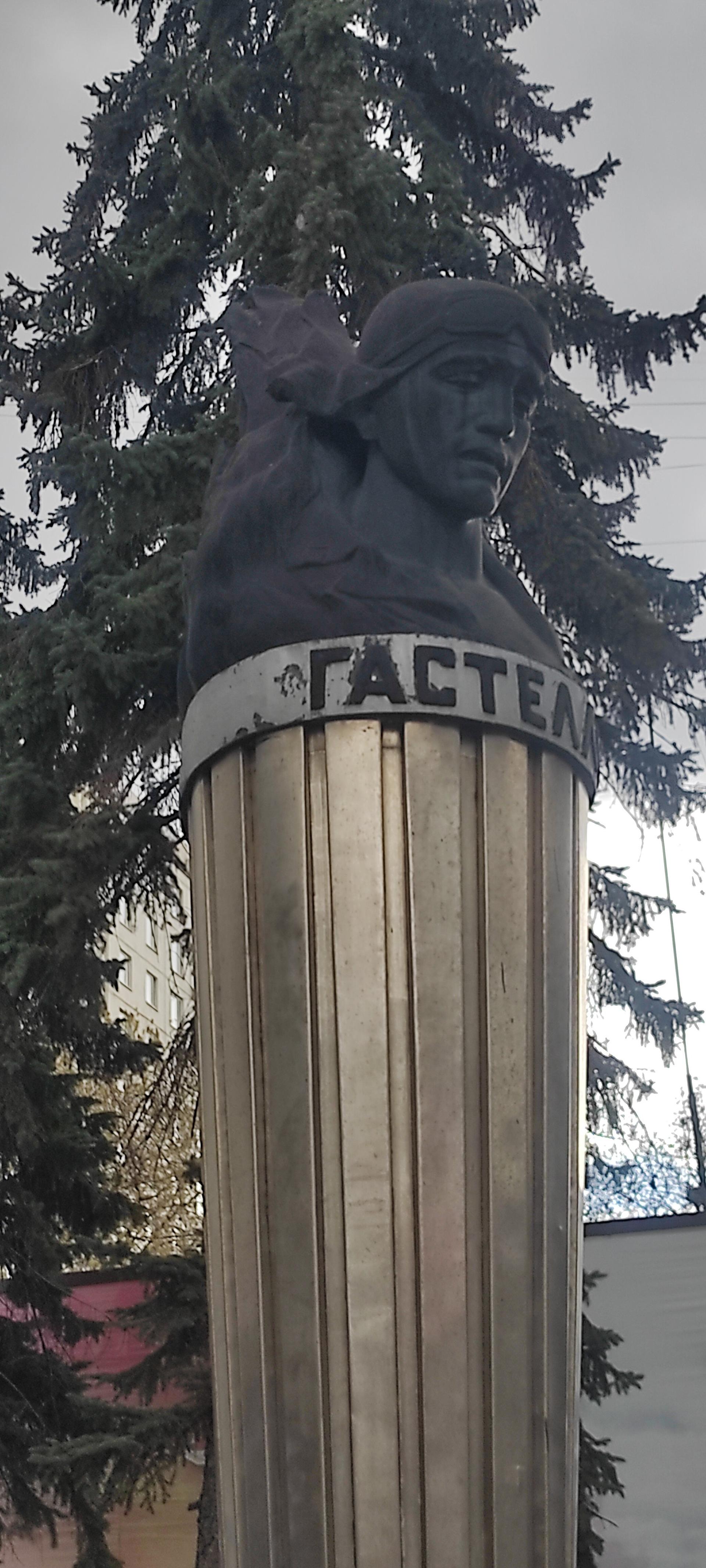 Подножия постамента по бокам расположены два гранитных камня, имитирующих крылья. Бюст дает самое общее представление о портретном сходстве. Гастелло показан в летном шлеме. Памятник выполнен в трагическом контексте: портретируемый изображен на фоне языков пламени. В верхней части колонны-постамента накладными буквами исполнена посвятительная надпись: «Гастелло».