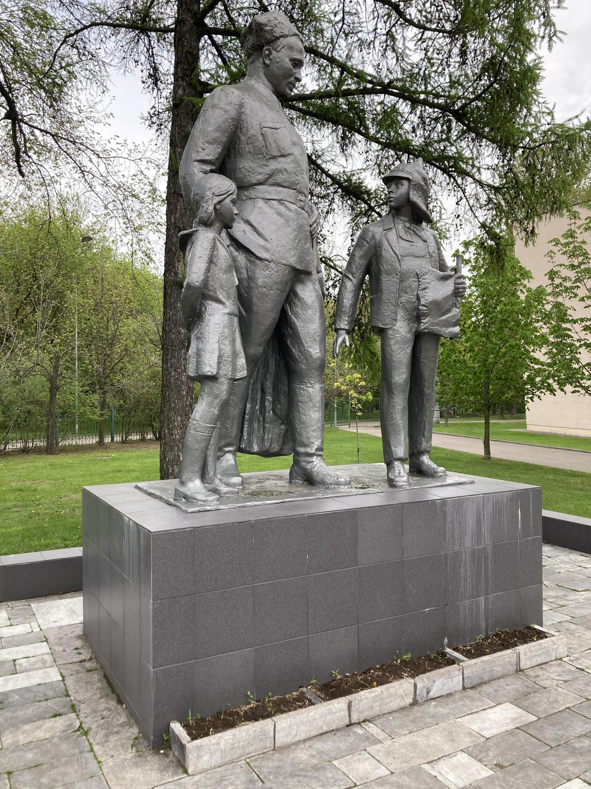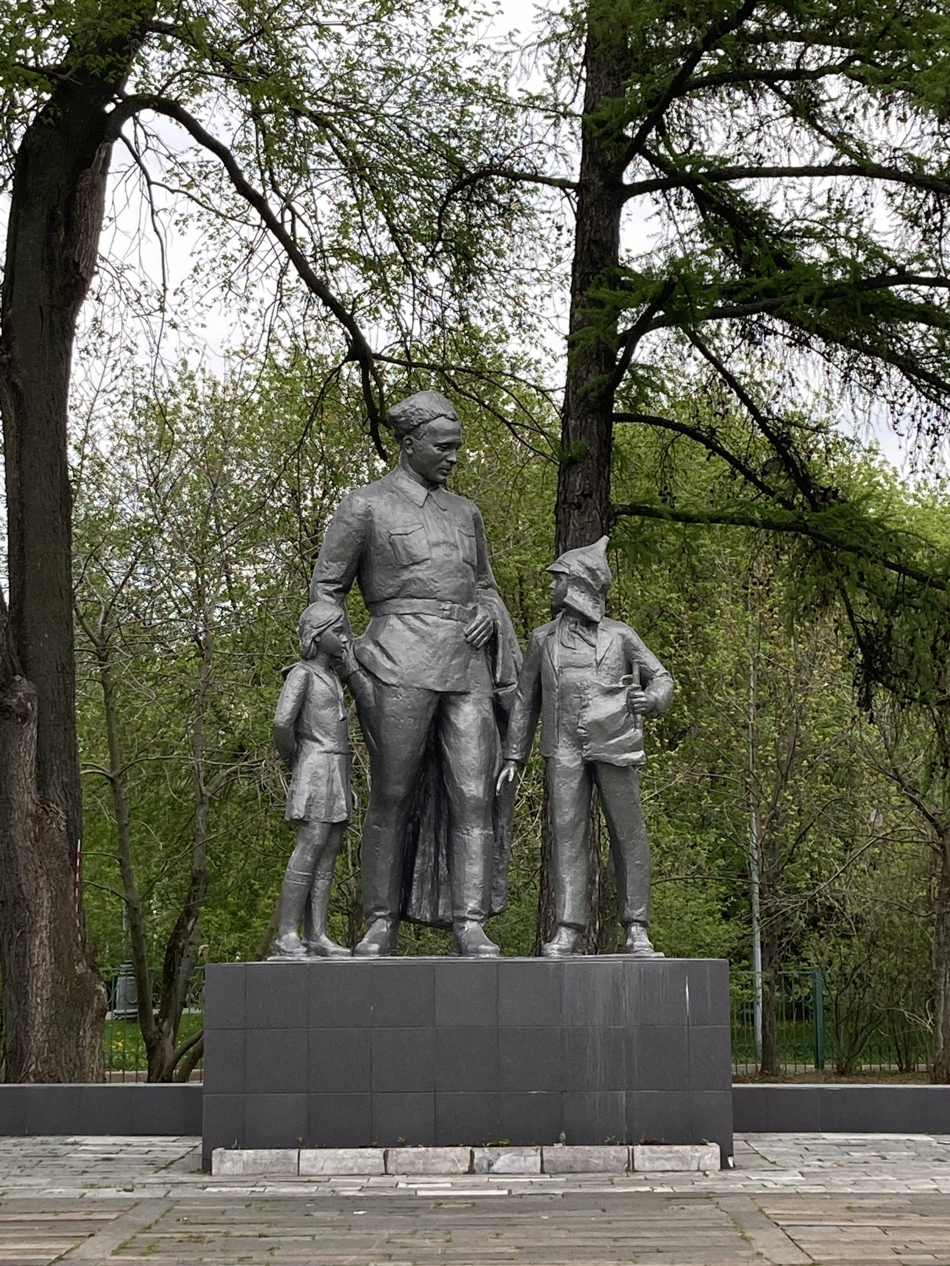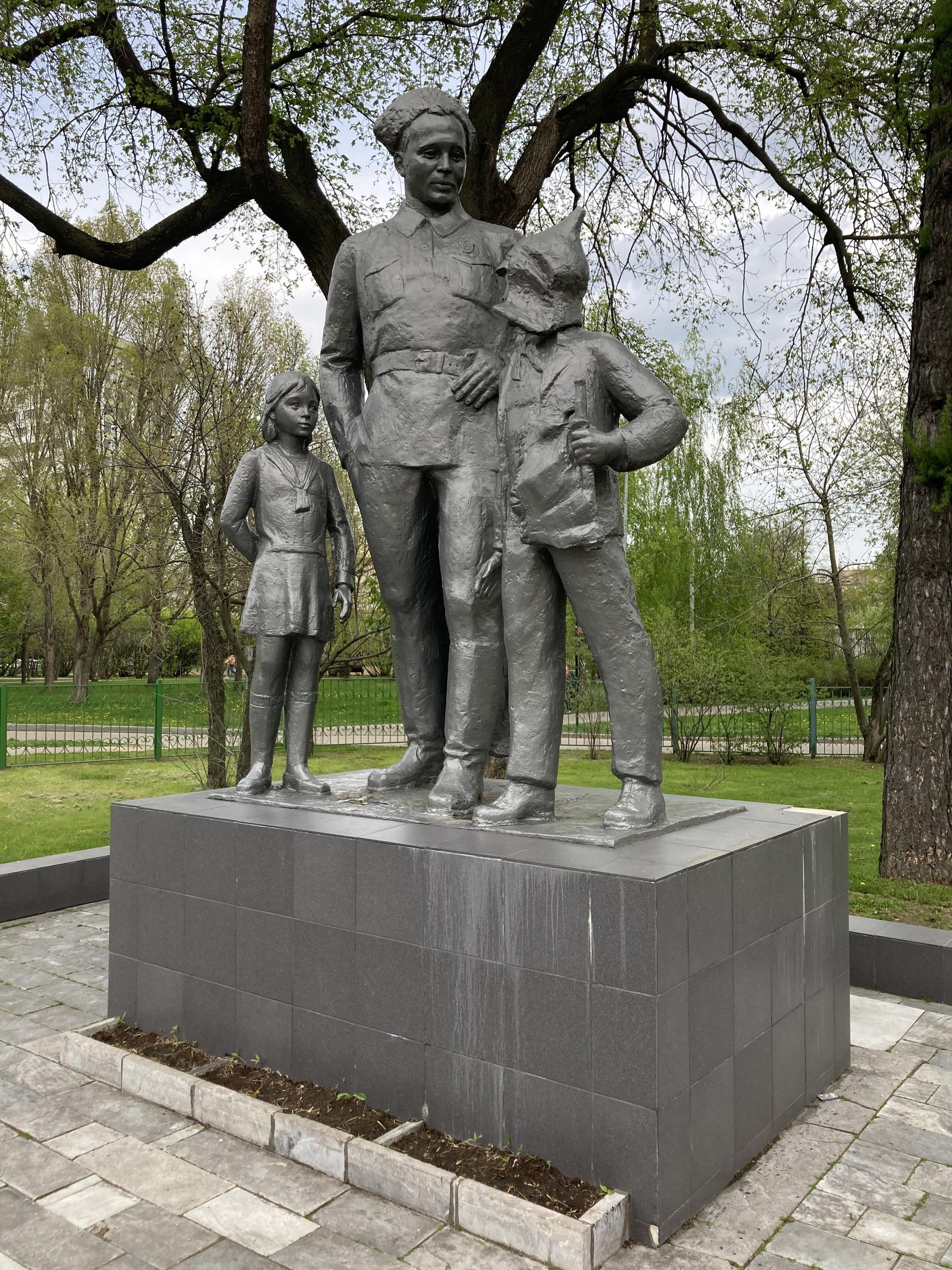 Памятник представляет собой скульптурную трехфигурную композицию из шпиатра, размещенную на облицованном керамическими плитами постаменте. Центральное положение в скульптурной композиции занимает фигура писателя, которую окружают фигуры мальчика и девочки. Гайдар слушает и внимательно смотрит на мальчика. Девочка, одетая в матроску, стоит рядом с писателем, по правую руку от него, и слушает своего товарища.